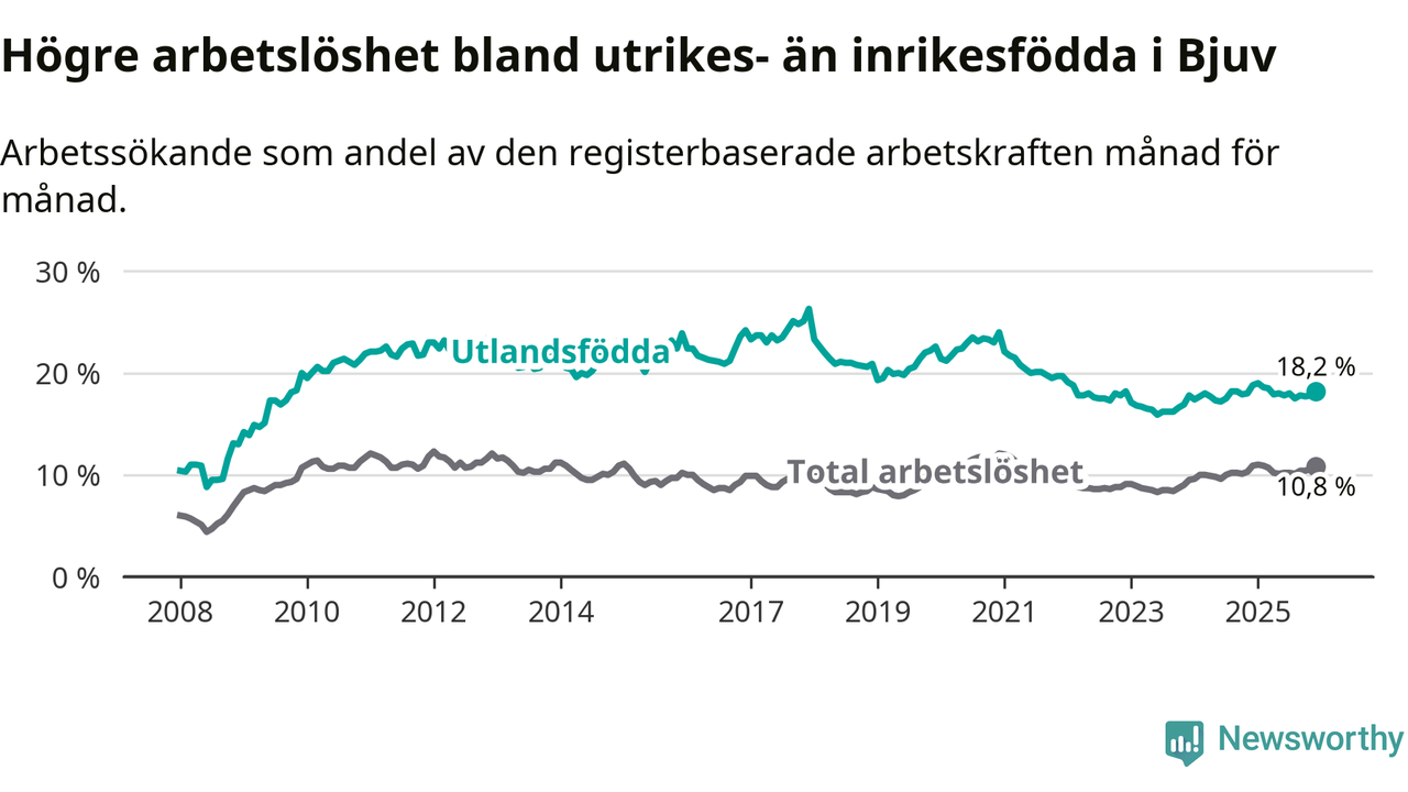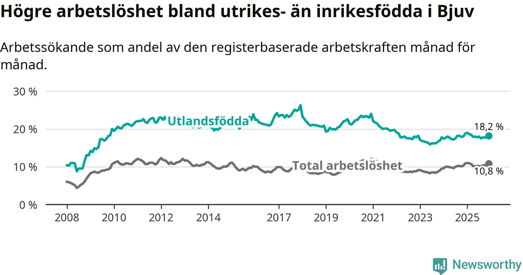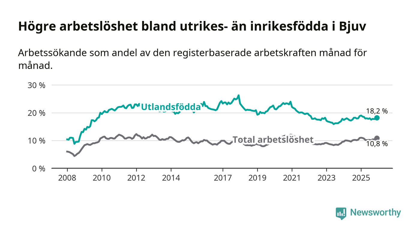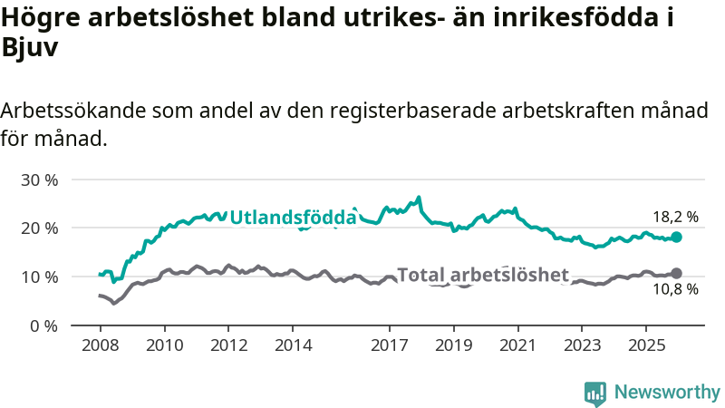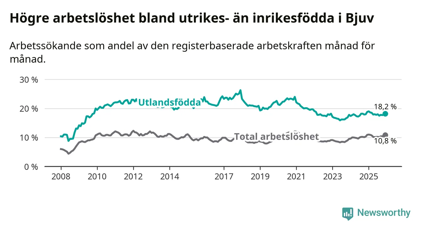 Arbetslösheten bland utlandsfödda var 18,2 procent i Bjuv under december månad, motsvarande 454 av 2 495 personer. Det är 0,6 procentenheter färre än vid samma tidpunkt i fjol (−9 om man räknar personer).