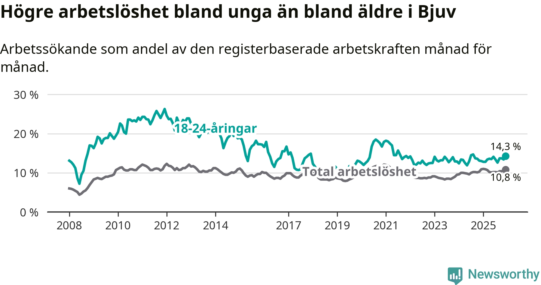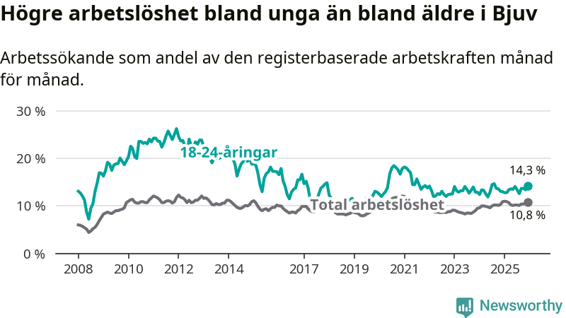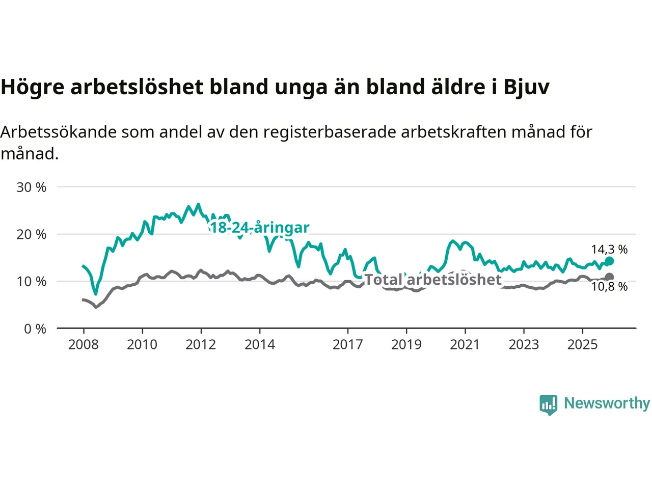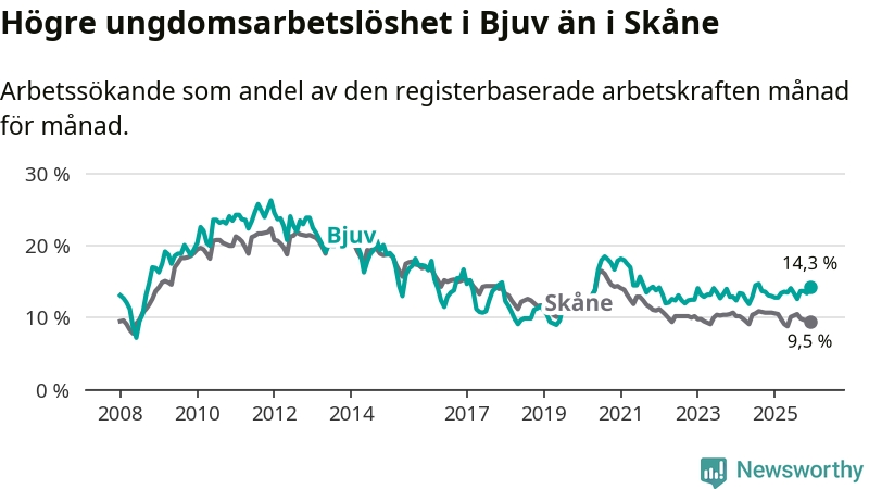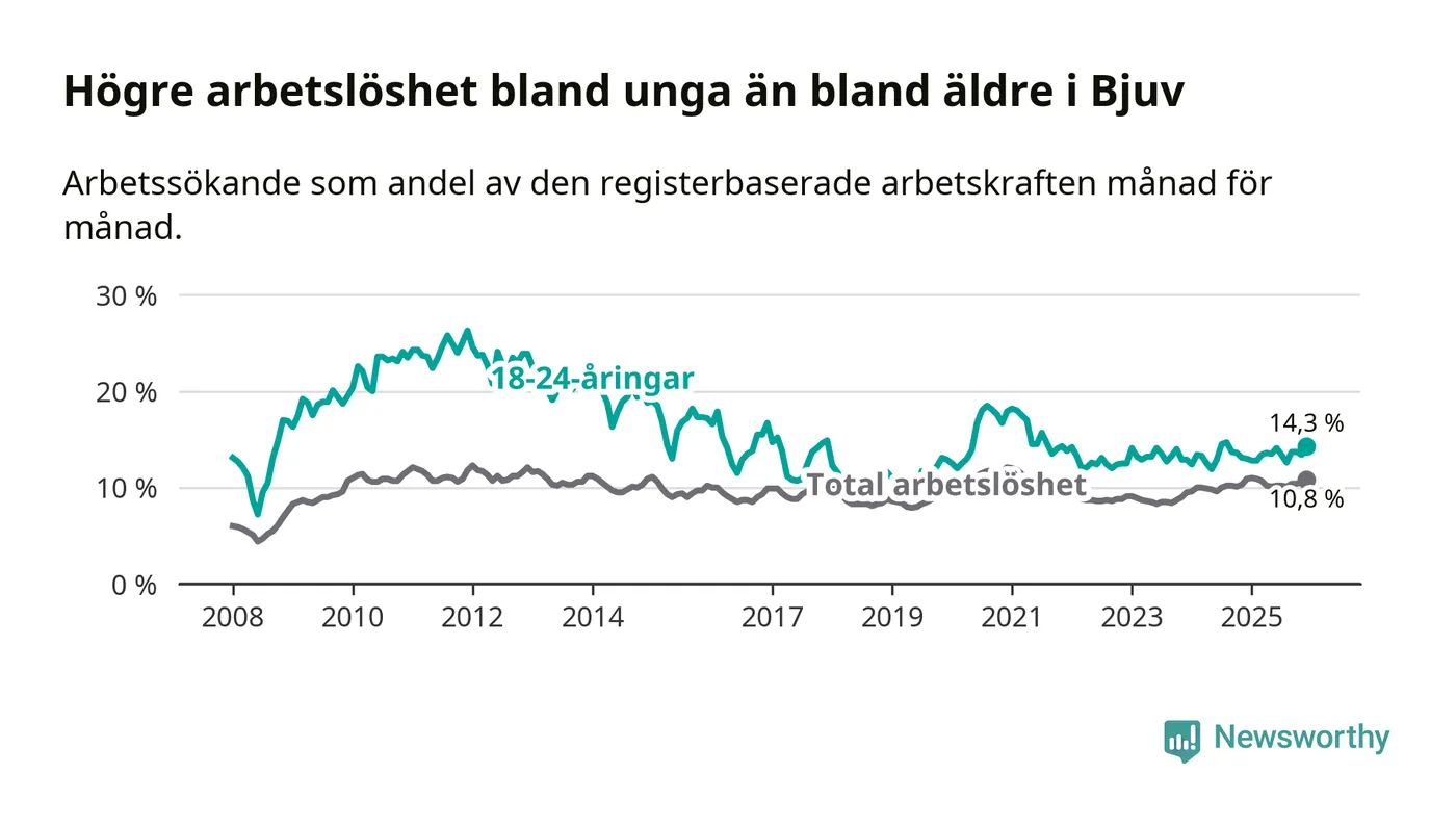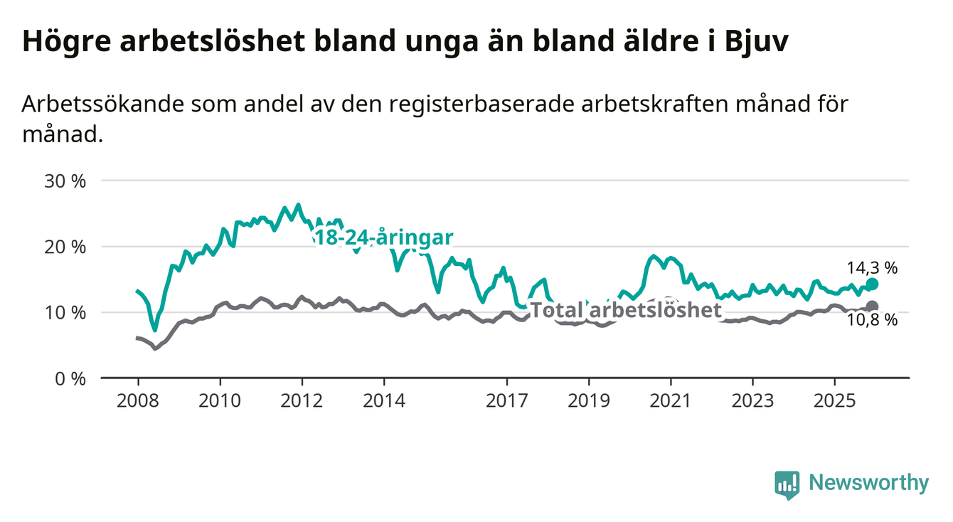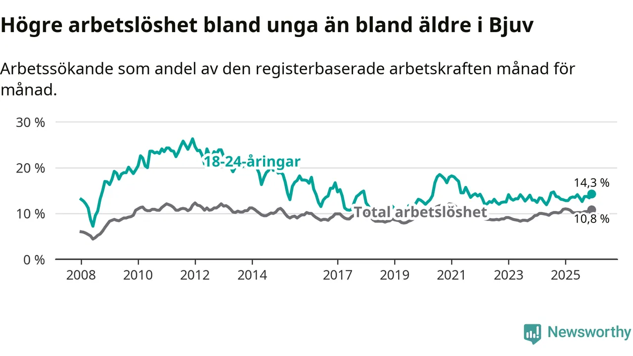 Den senaste månadsstatistiken från Arbetsförmedlingen visar på en uppgång i ungdomsarbetslöshet i Bjuvs kommun med 1,3 procentenheter. Arbetslösheten bland personer i åldern 18–24 år låg i december på 14,3 procent.