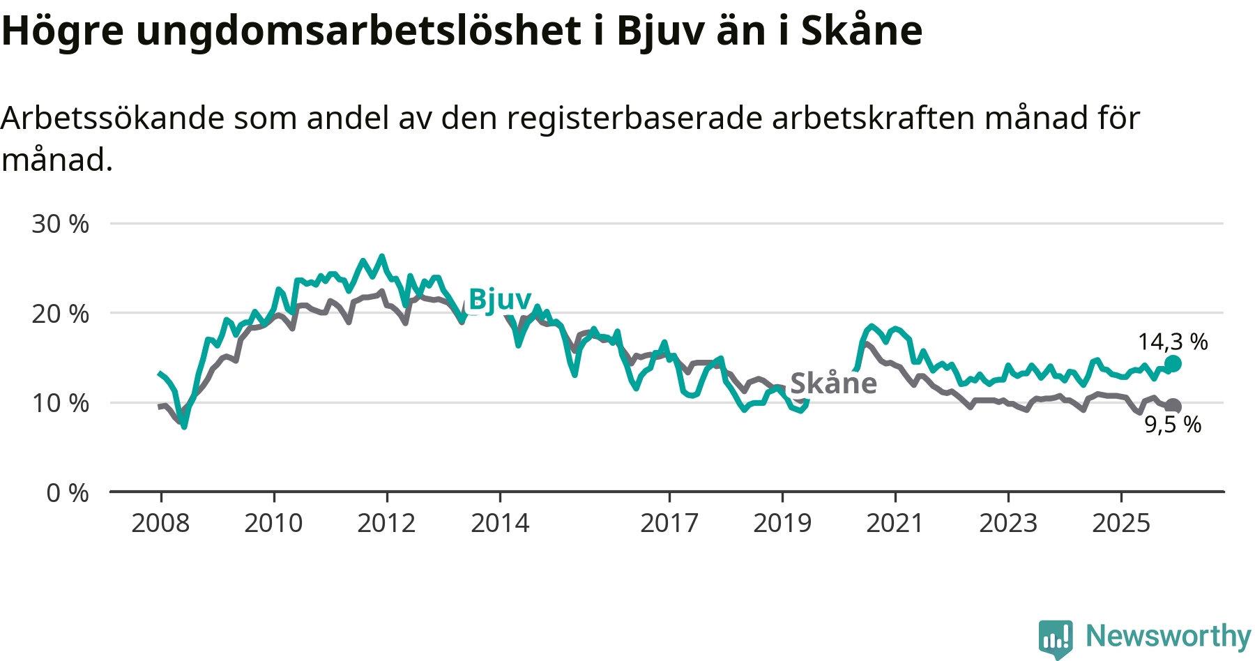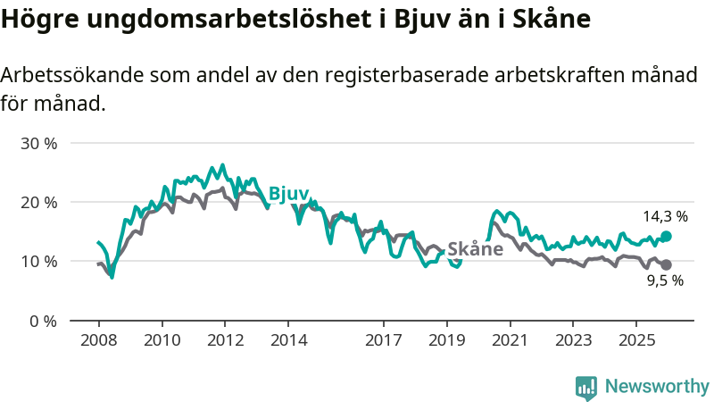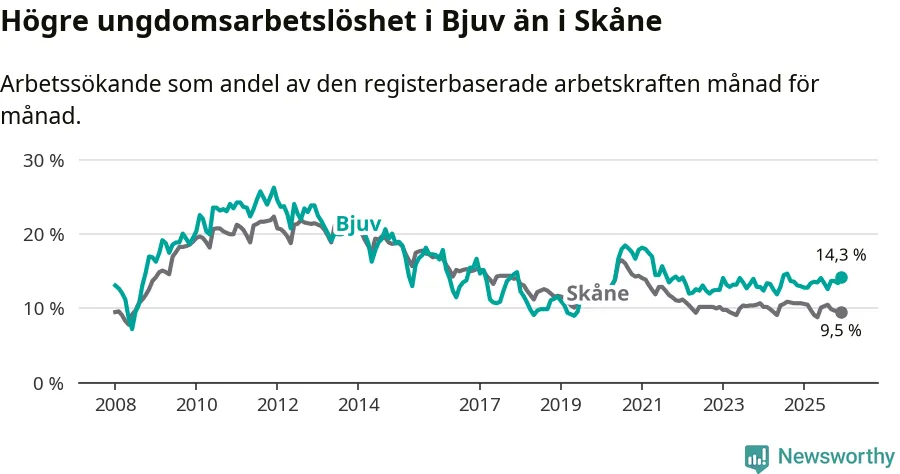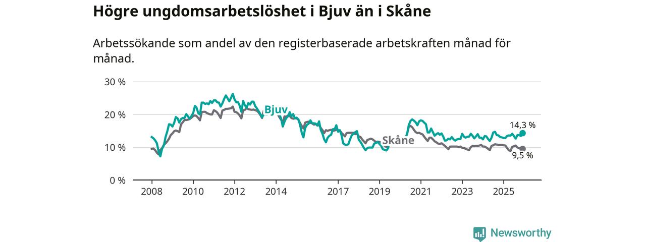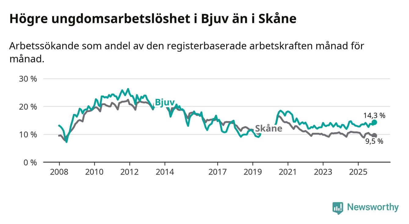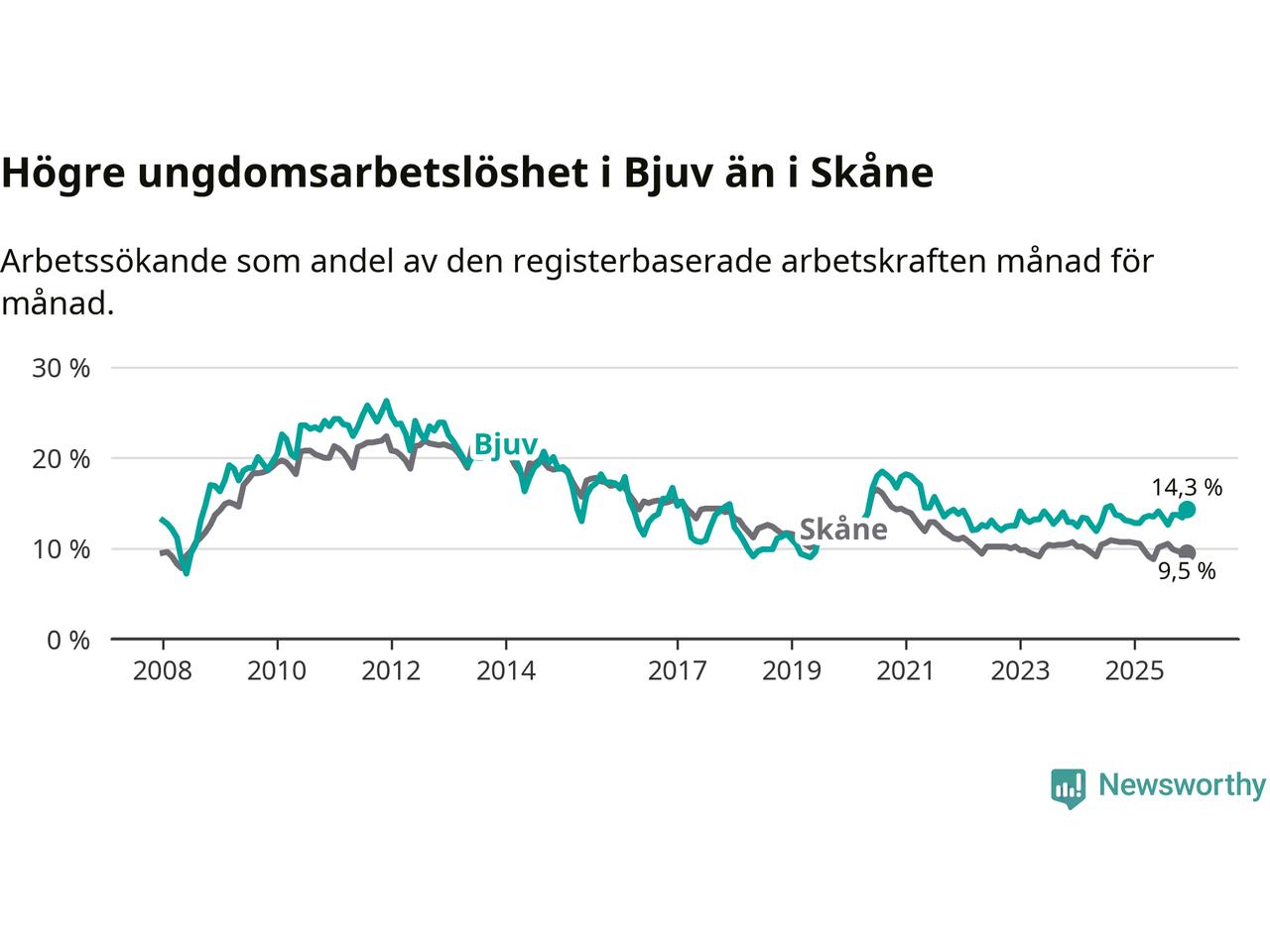 Precis som den totala arbetslösheten ligger ungdomsarbetslösheten i Bjuv högre än i Skåne som helhet. Skillnaden mellan kommunen och länet är 4,8 procentenheter. Medan ungdomsarbetslösheten i Bjuv alltså ökar så minskar den i Skåne (−1,2 procentenheter).