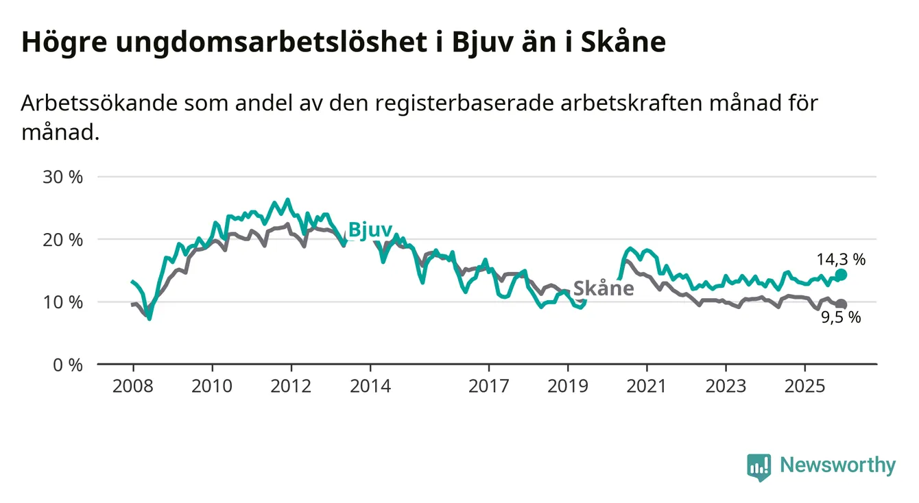 Bjuvs kommun såg under december en svagare utveckling på arbetsmarknaden för unga än länet. Skillnaden i arbetslöshet mellan kommunen och Skåne län växer.