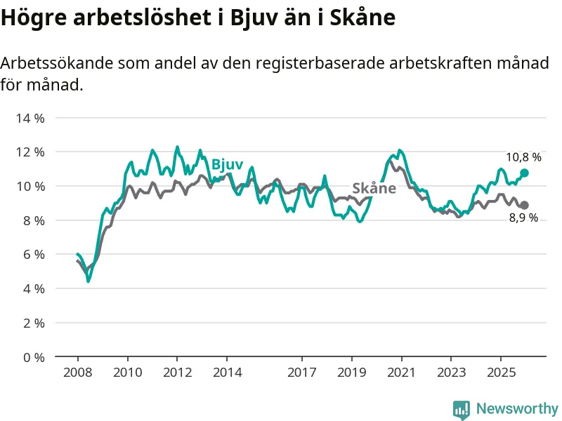 Under december månad rapporterade Bjuvs kommun en total arbetslöshet på 10,8 procent. Det är en minskning jämfört med samma tidpunkt i fjol (−0,1 procentenheter). Även i Skåne län sjunker arbetslösheten .