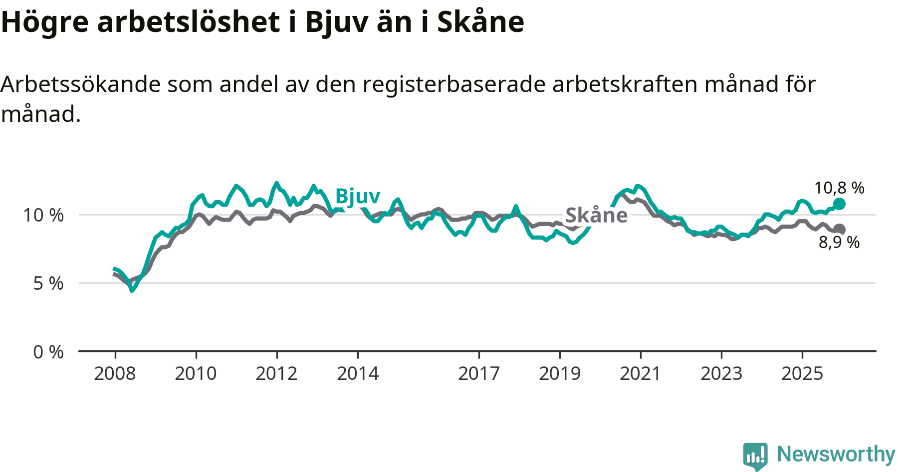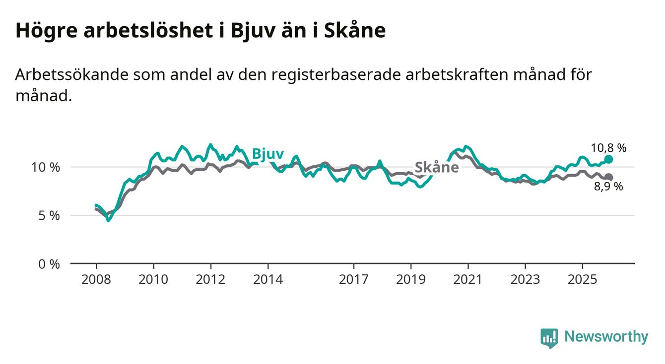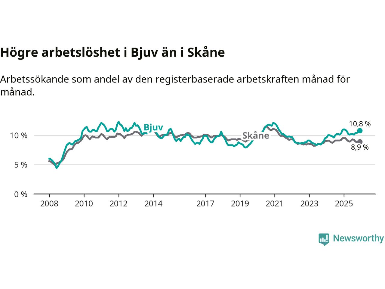 Även om arbetslösheten i Bjuv alltså minskar, så ligger den fortfarande över snittet i hela Skåne län (10,8 procent i kommunen, jämfört med 8,9 procent i hela länet). Lomma har den lägsta arbetslösheten i länet (4,0 procent), medan Perstorp har den högsta (13,3 procent). För att Bjuv skulle komma ner i samma arbetslöshetsnivå som Lomma skulle 534 personer behöva sysselsättas.