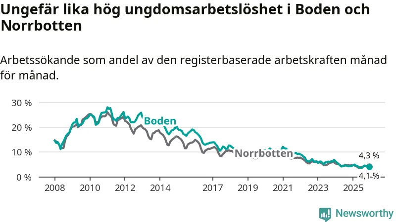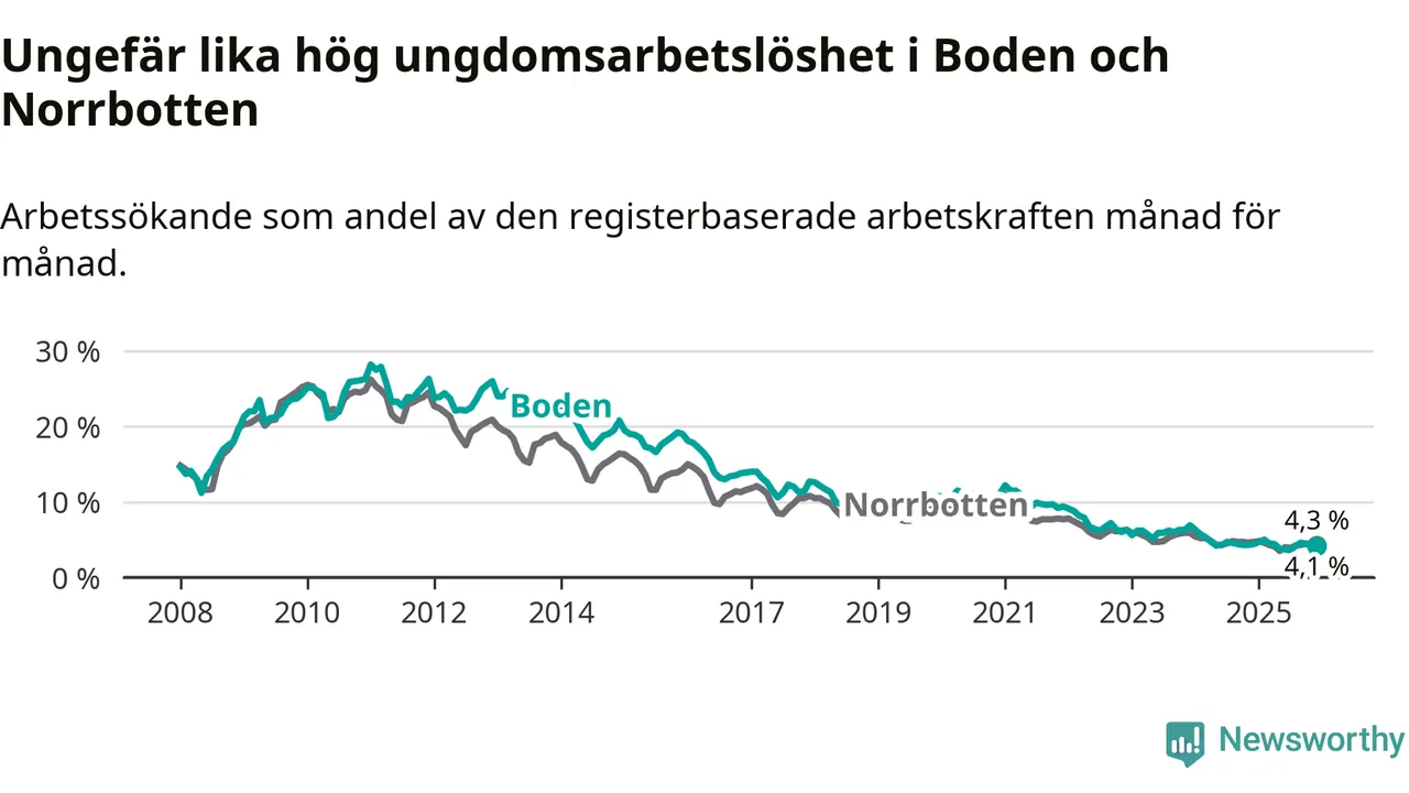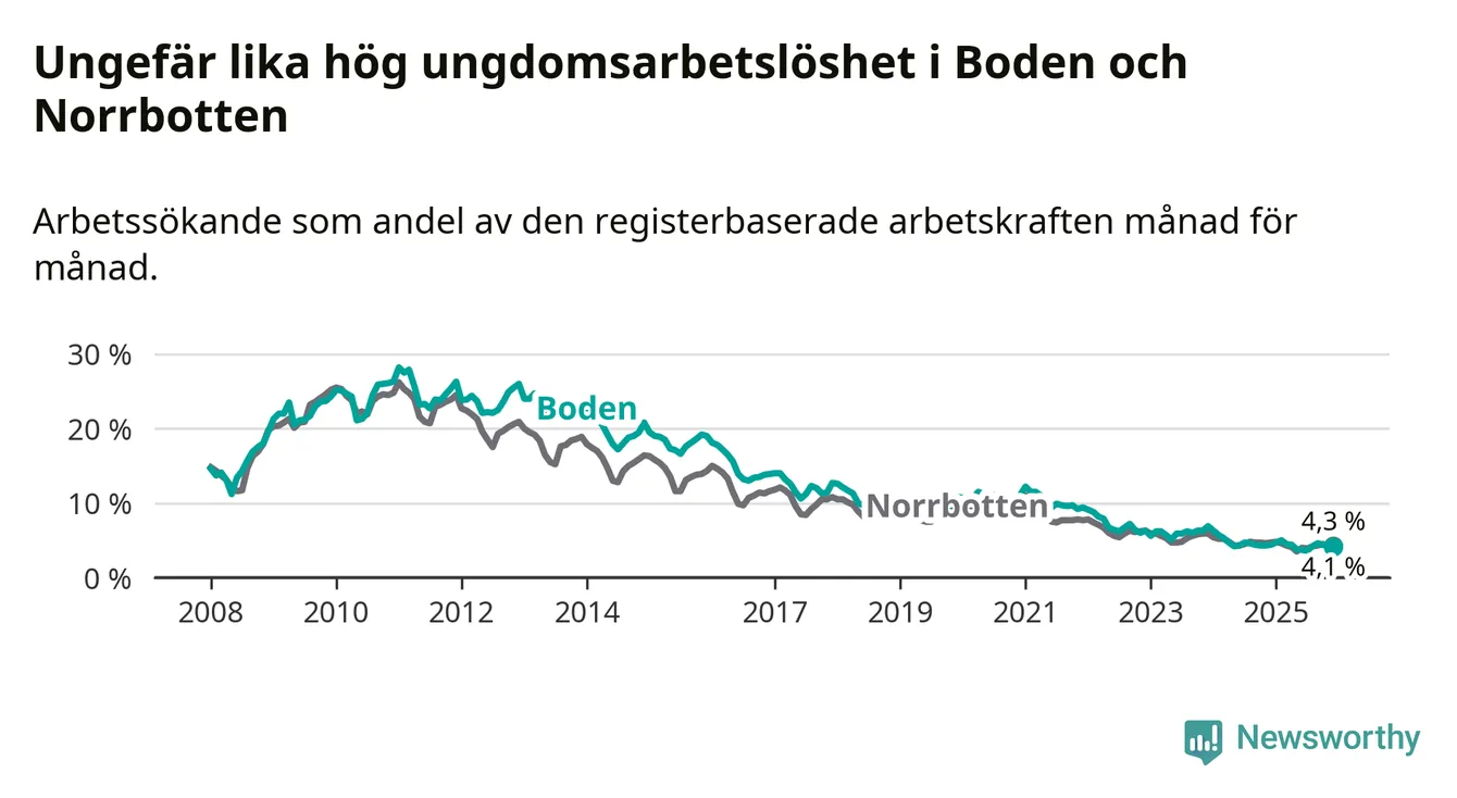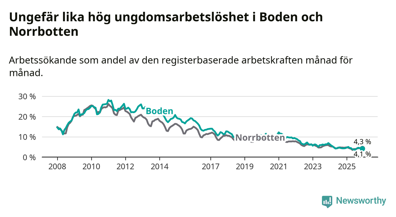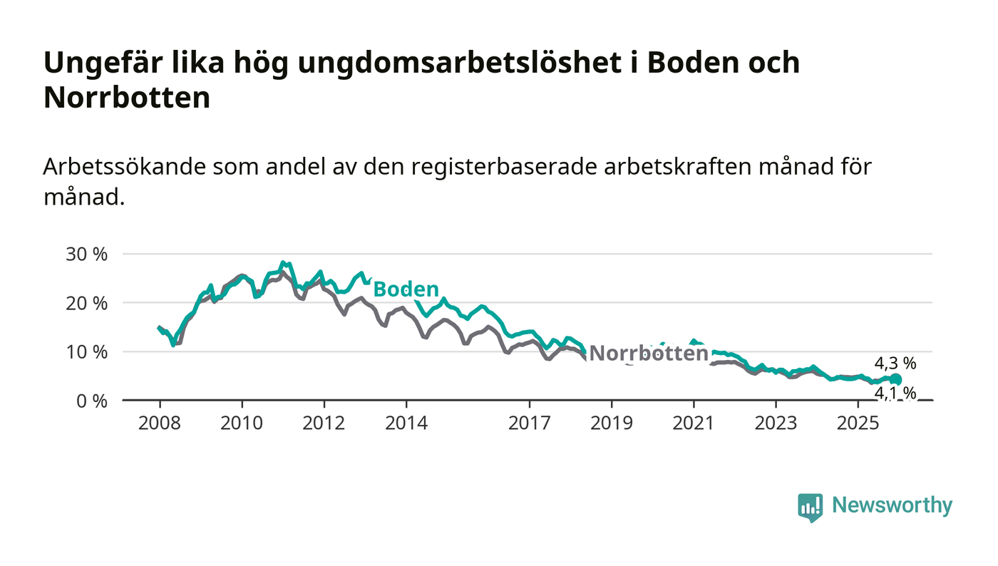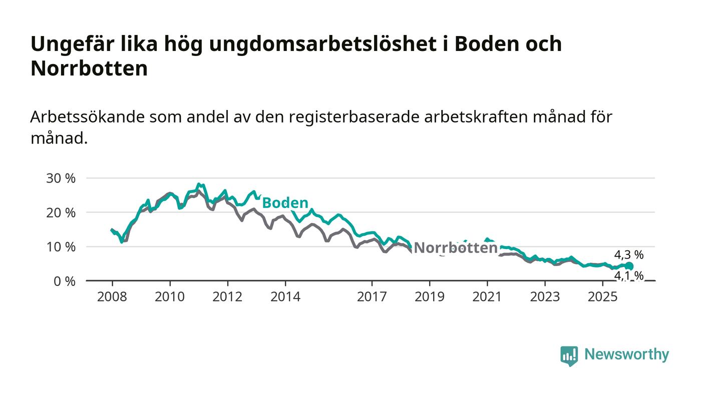 Precis som den totala arbetslösheten ligger ungdomsarbetslösheten i Boden på i stort sett samma nivå som i Norrbotten som helhet.