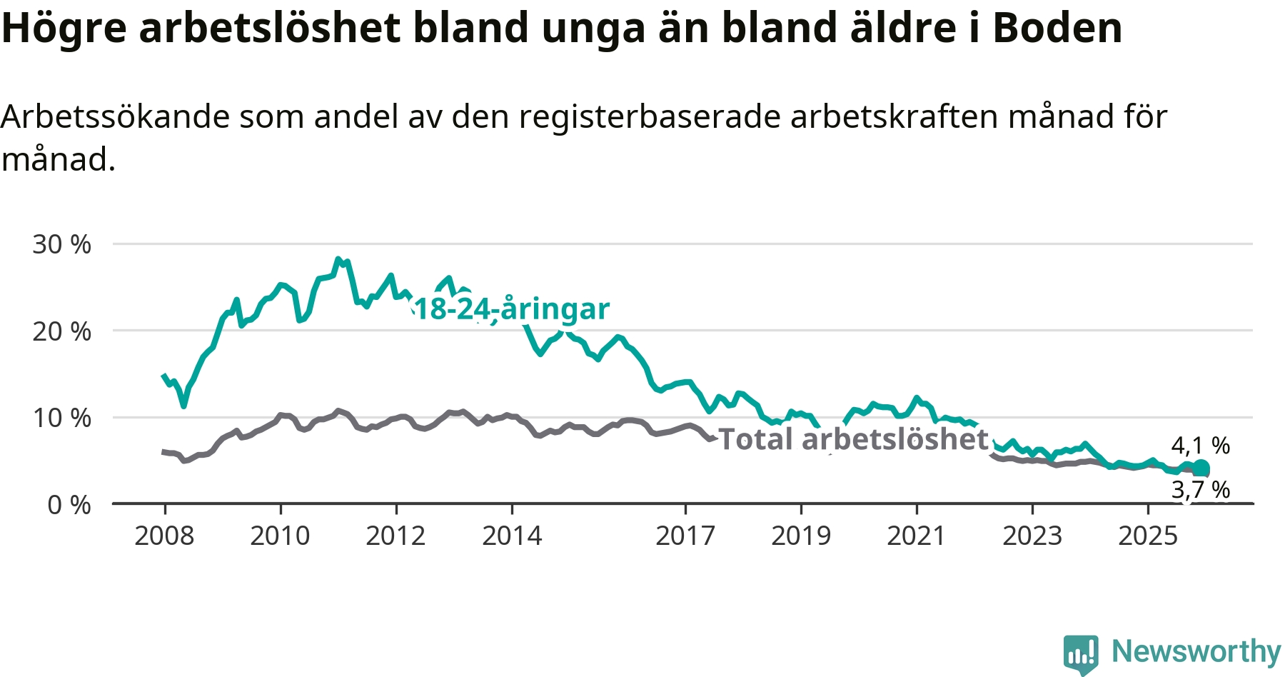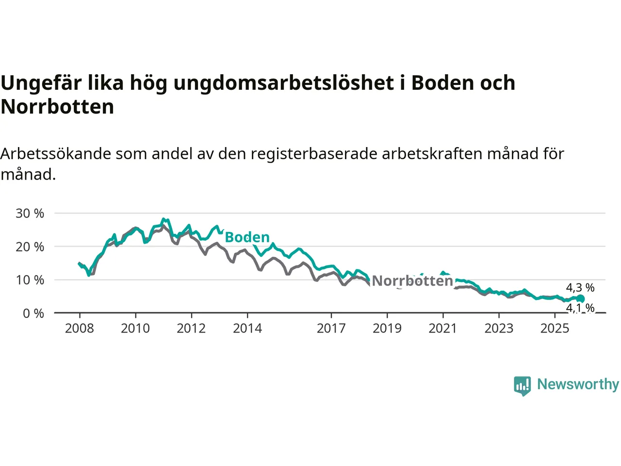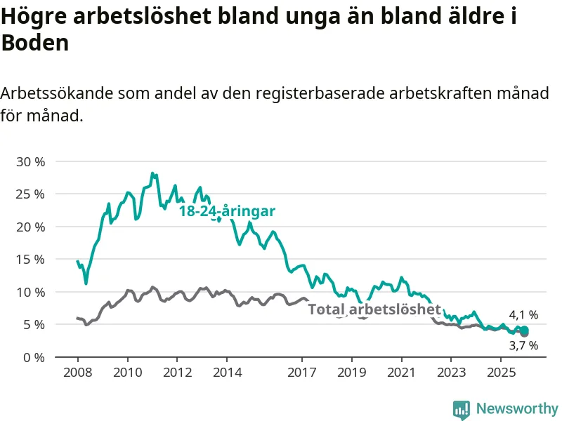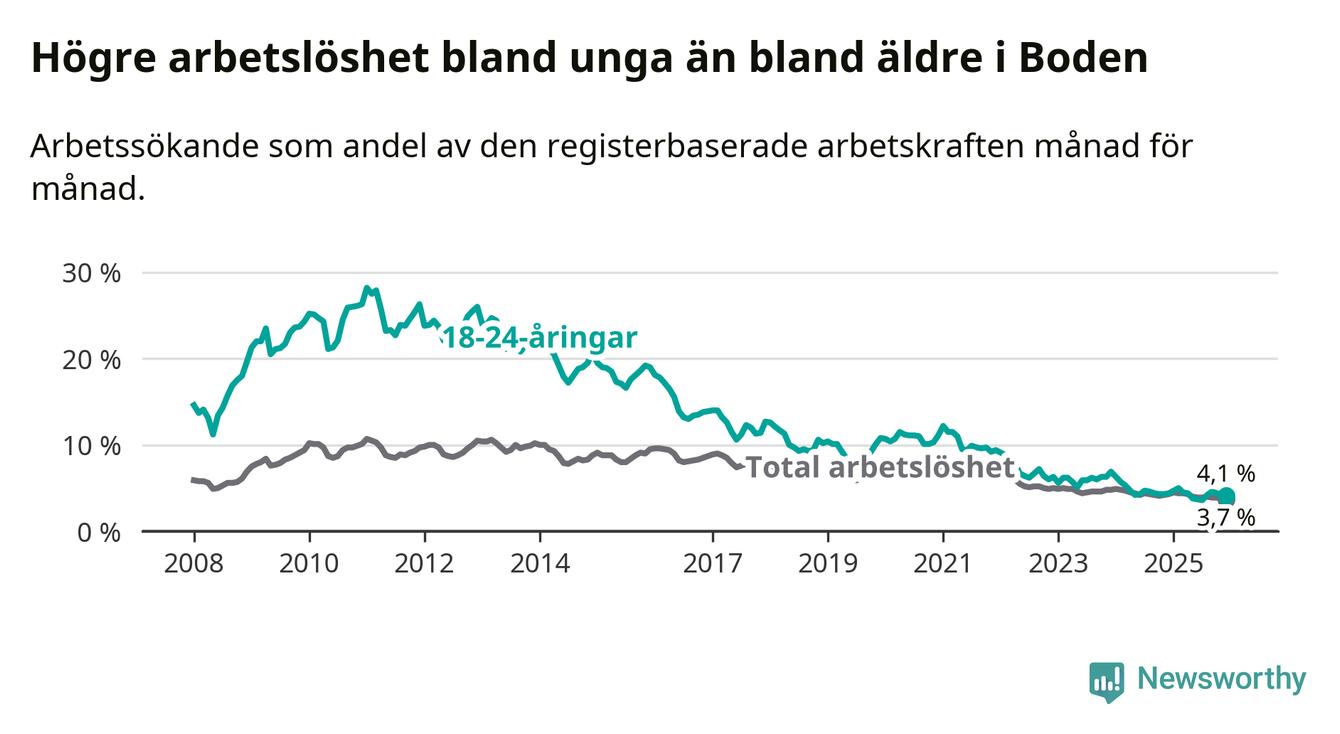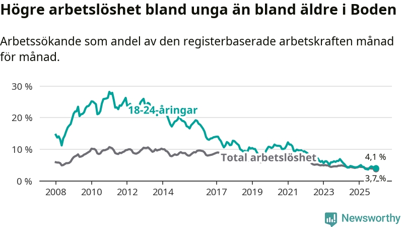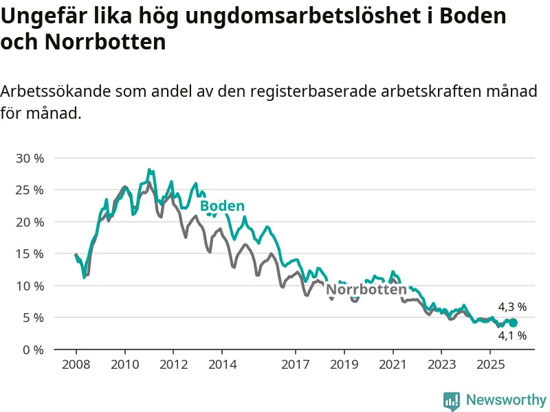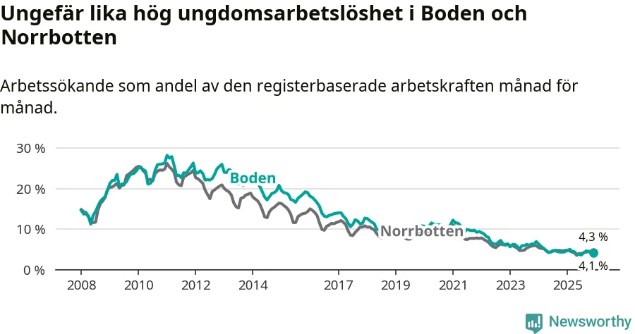 Precis som den totala arbetslösheten ligger ungdomsarbetslösheten i Boden på i stort sett samma nivå som i Norrbotten som helhet.