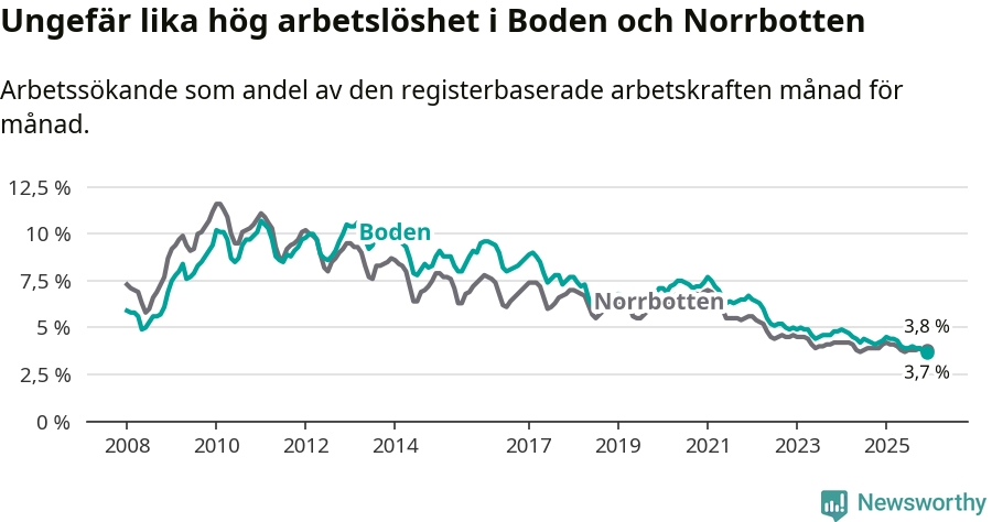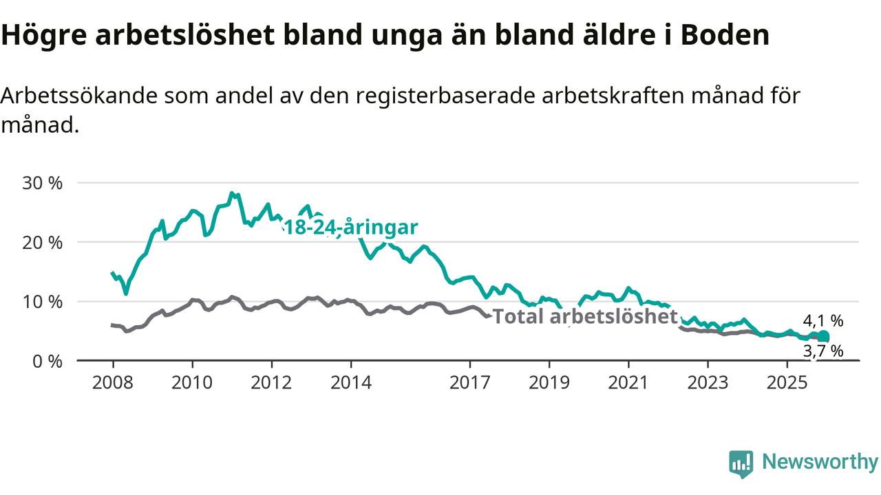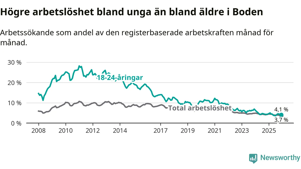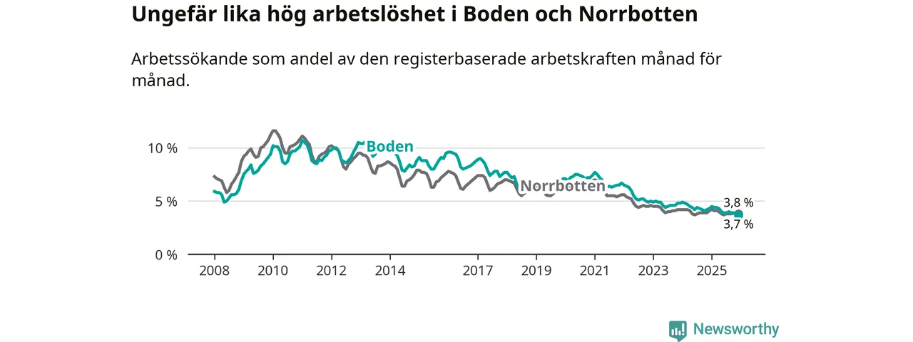 Det är 23:e månaden i följd som arbetslösheten i Boden är lägre än den var under samma tidpunkt året innan. Sedan januari 2024 har arbetslösheten gått ner från 4,9 till 3,7 procent.
