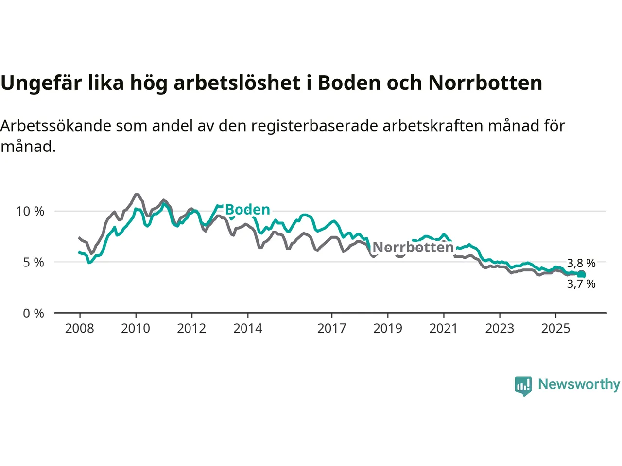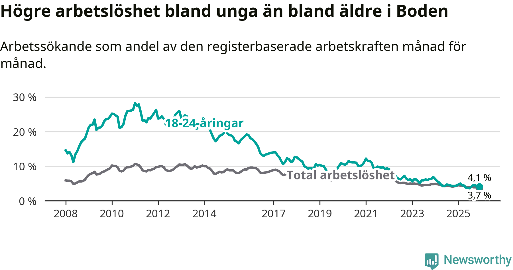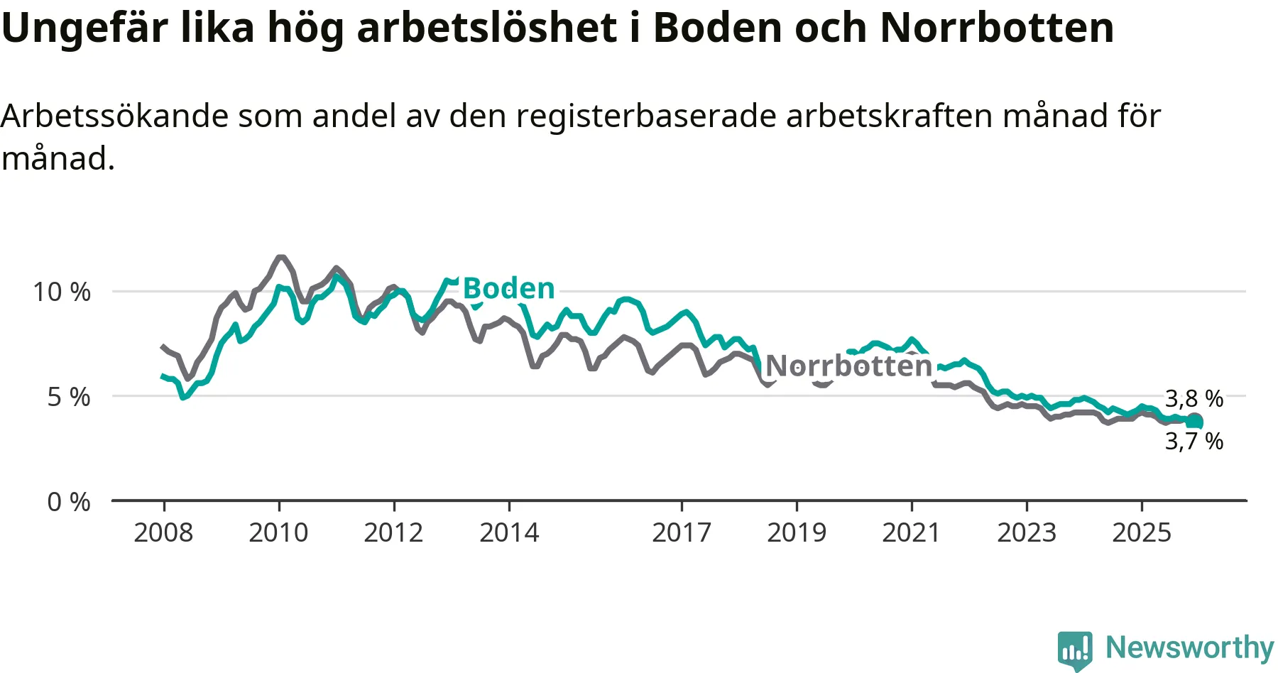 Det är 23:e månaden i följd som arbetslösheten i Boden är lägre än den var under samma tidpunkt året innan. Sedan januari 2024 har arbetslösheten gått ner från 4,9 till 3,7 procent.