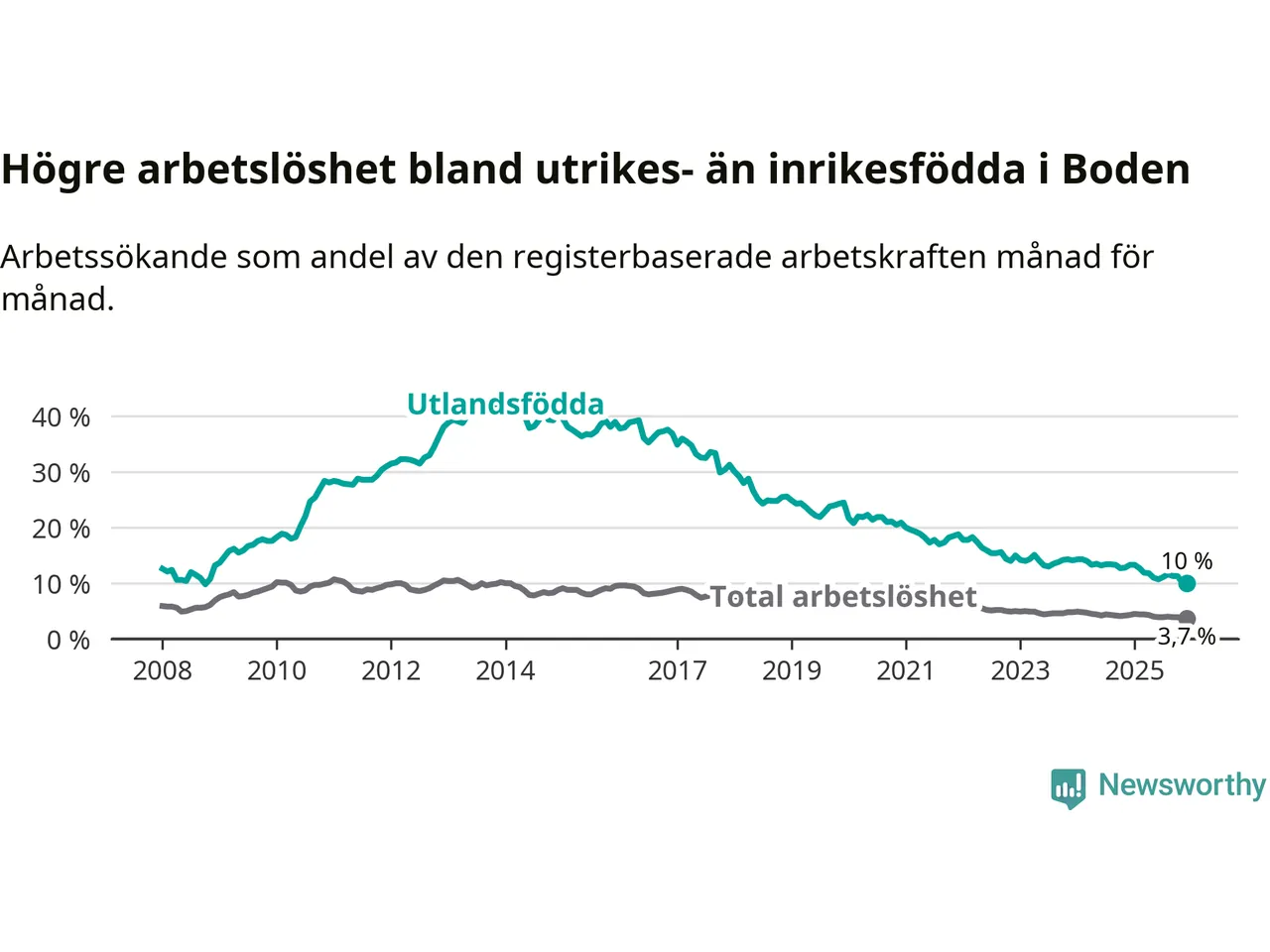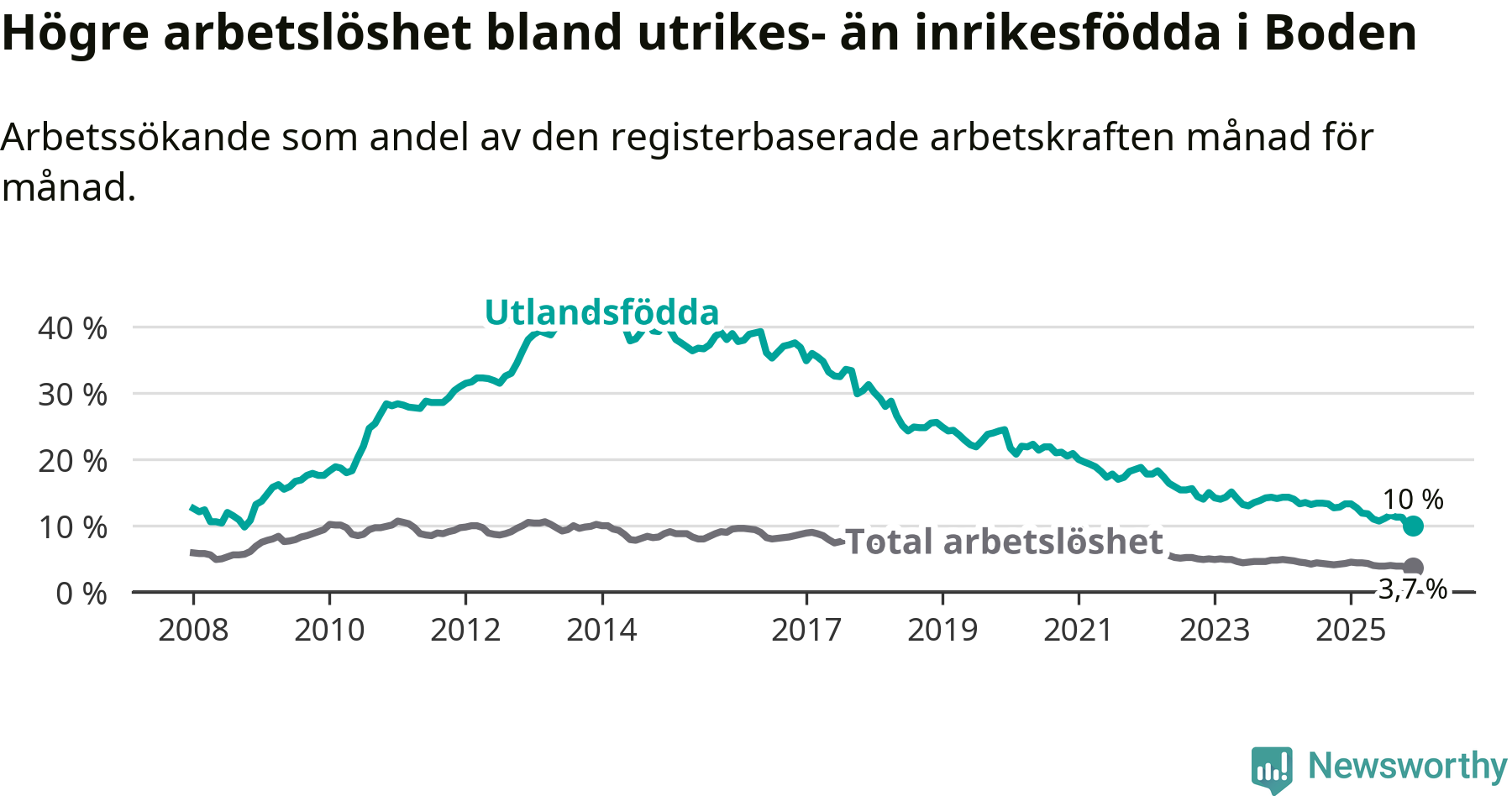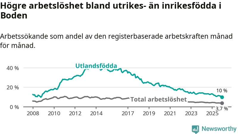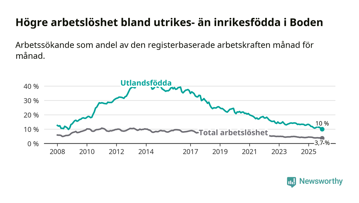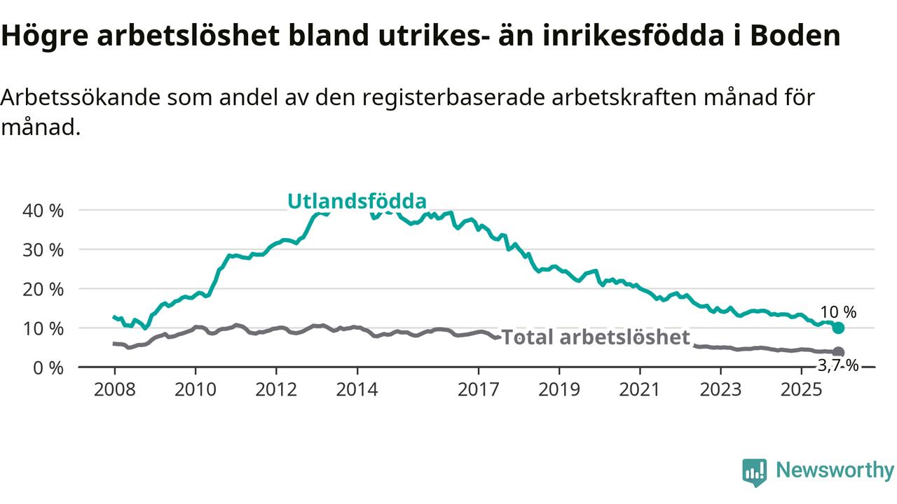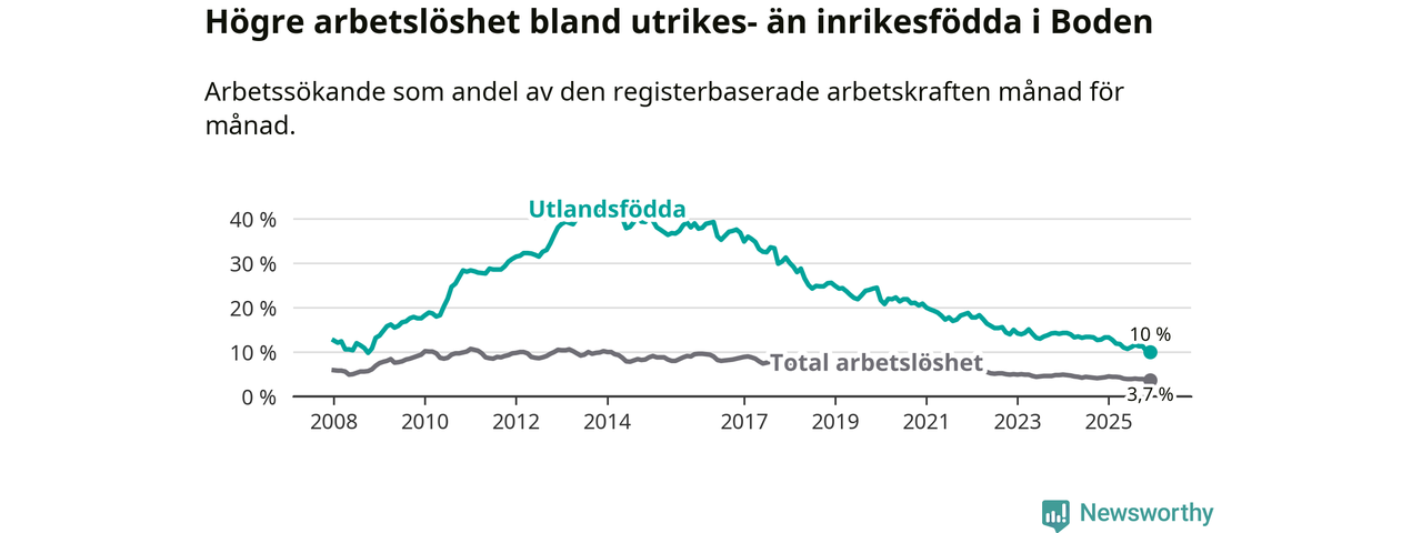 Arbetslösheten bland utlandsfödda var 10,0 procent i Boden under december månad, motsvarande 212 av 2 120 personer. Det är 3,3 procentenheter färre än vid samma tidpunkt i fjol (−38 om man räknar personer). Därmed är de utlandsföddas arbetslöshet lägre än vid samma tidpunkt i fjol för 17:e månaden i följd. Sedan juli 2024 har arbetslösheten bland utlandsfödda minskat från 13,4 till 10,0 procent. Den nuvarande arbetslöshetsnivån är den lägsta sedan oktober 2008.