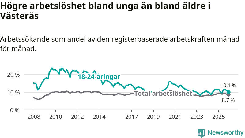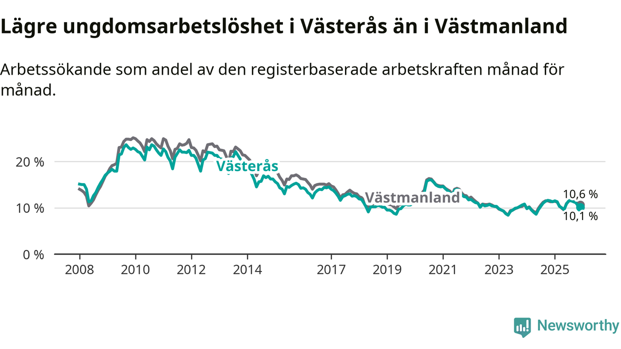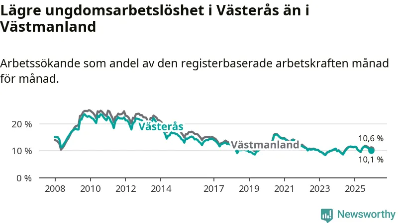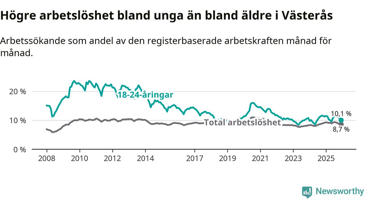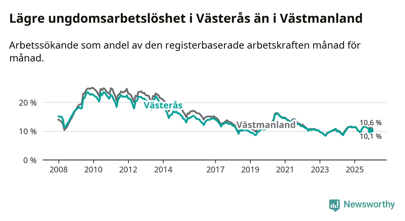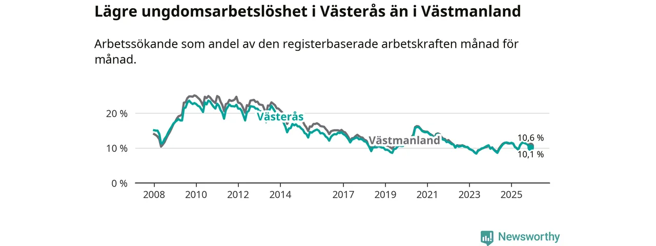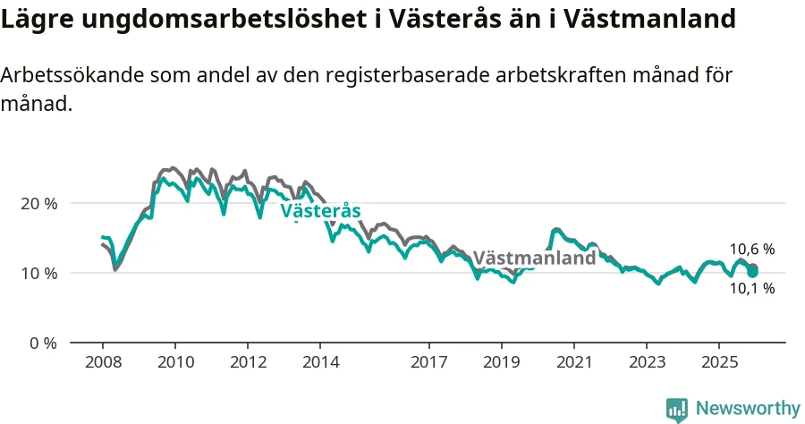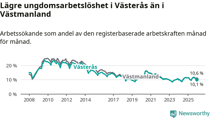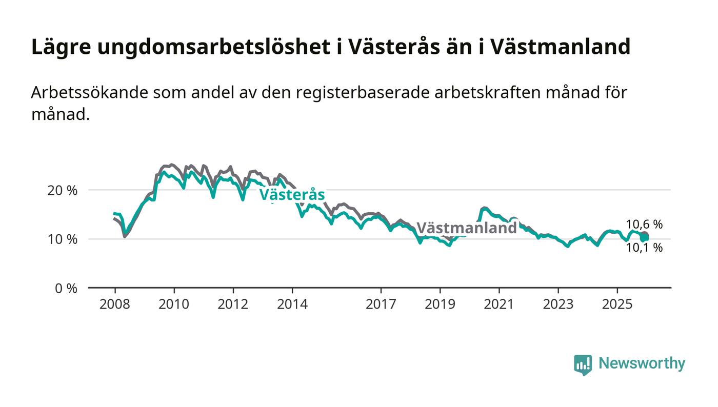 Medan Västerås har högre total arbetslöshet än Västmanland, ligger ungdomsarbetslösheten 0,5 procentenheter lägre i Västerås.