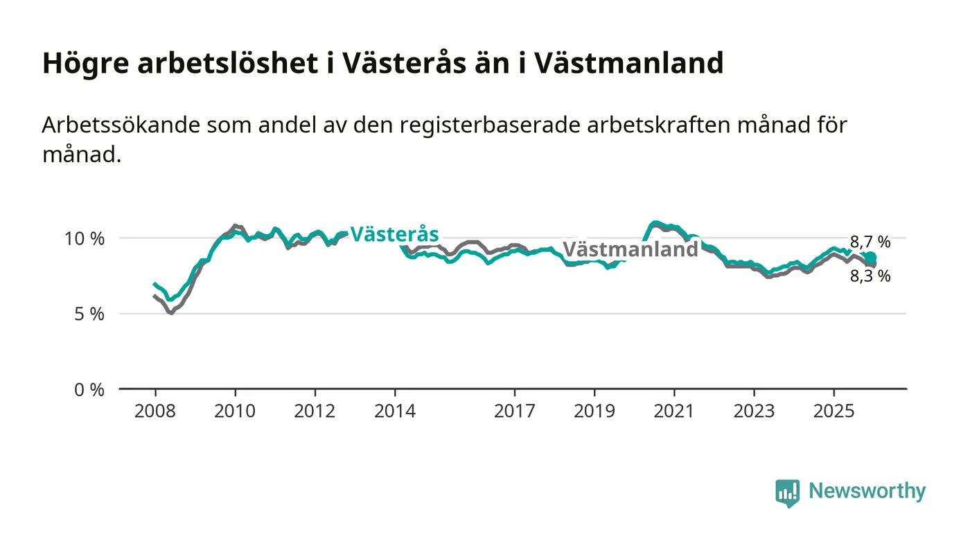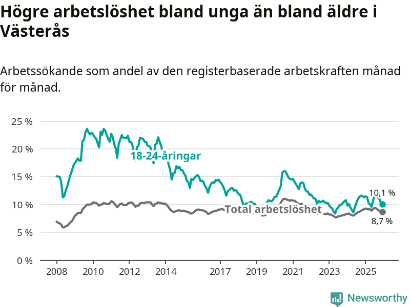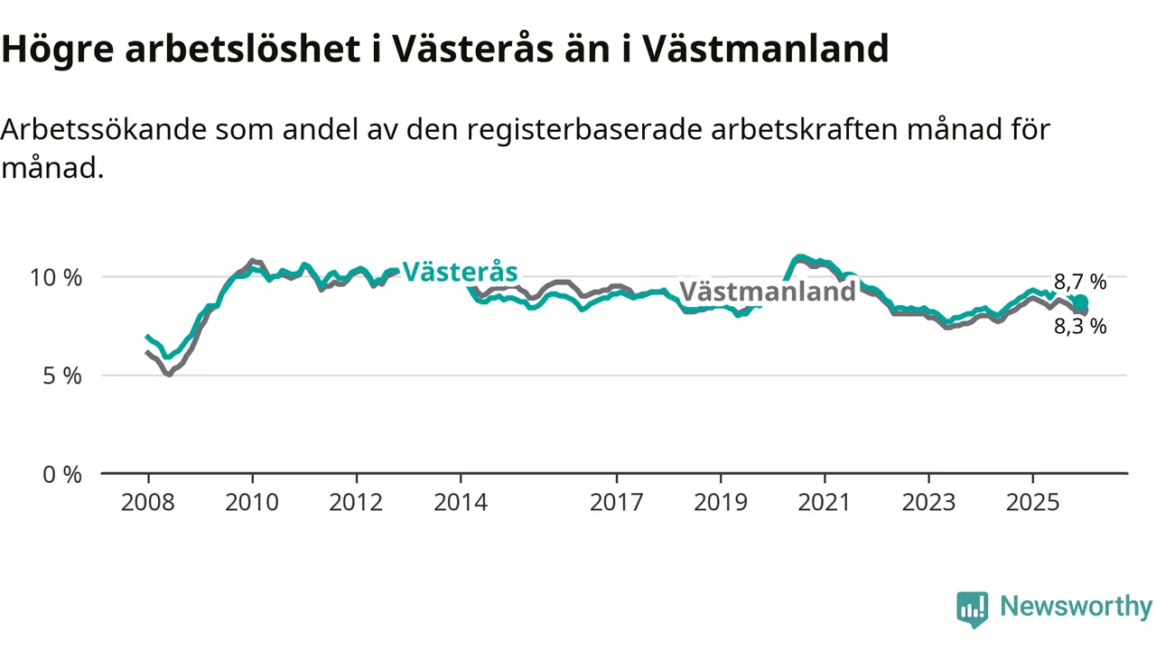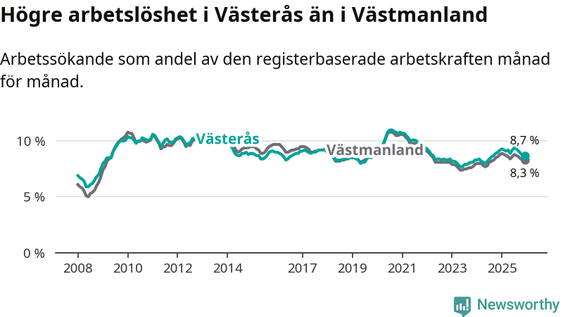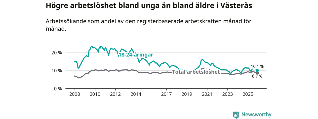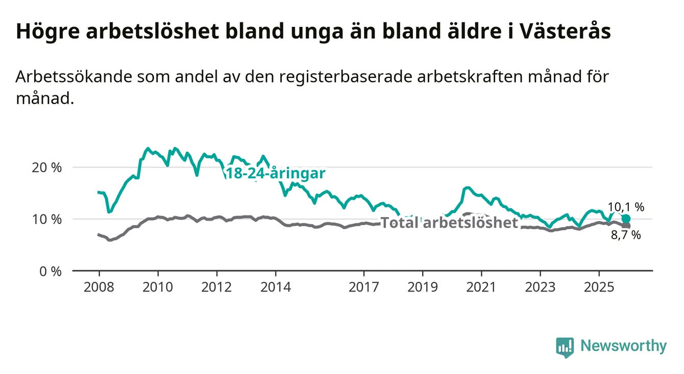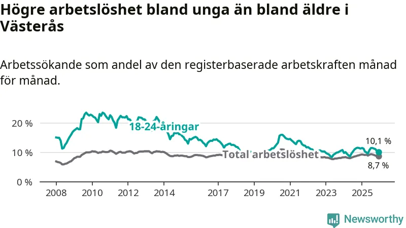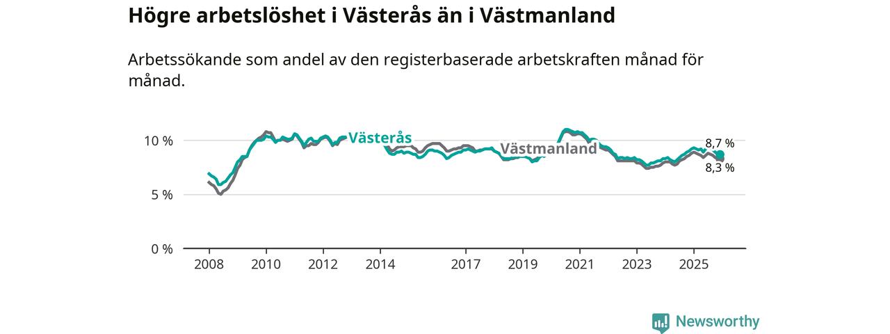 Medan Västerås har högre total arbetslöshet än Västmanland, ligger ungdomsarbetslösheten 0,5 procentenheter lägre i Västerås.