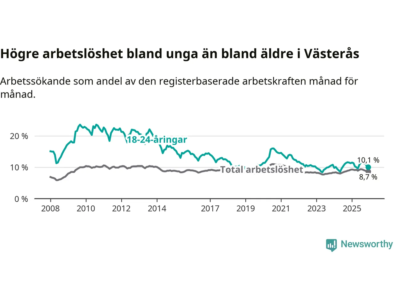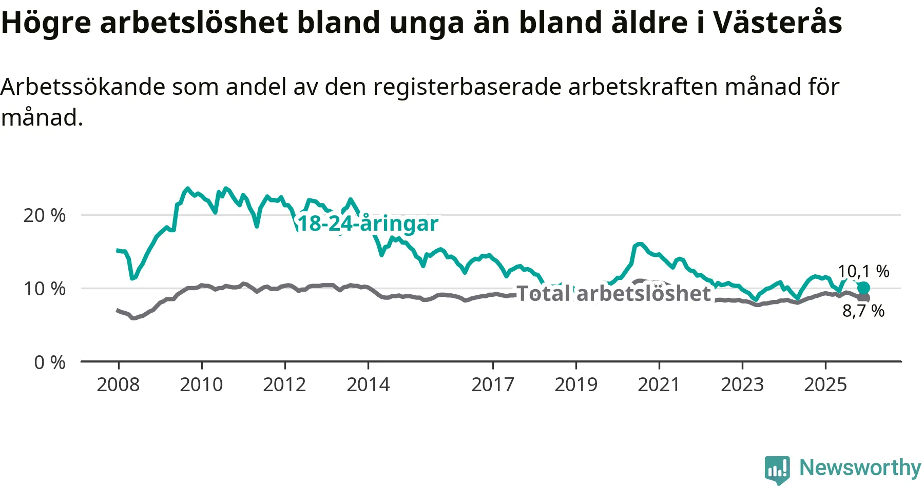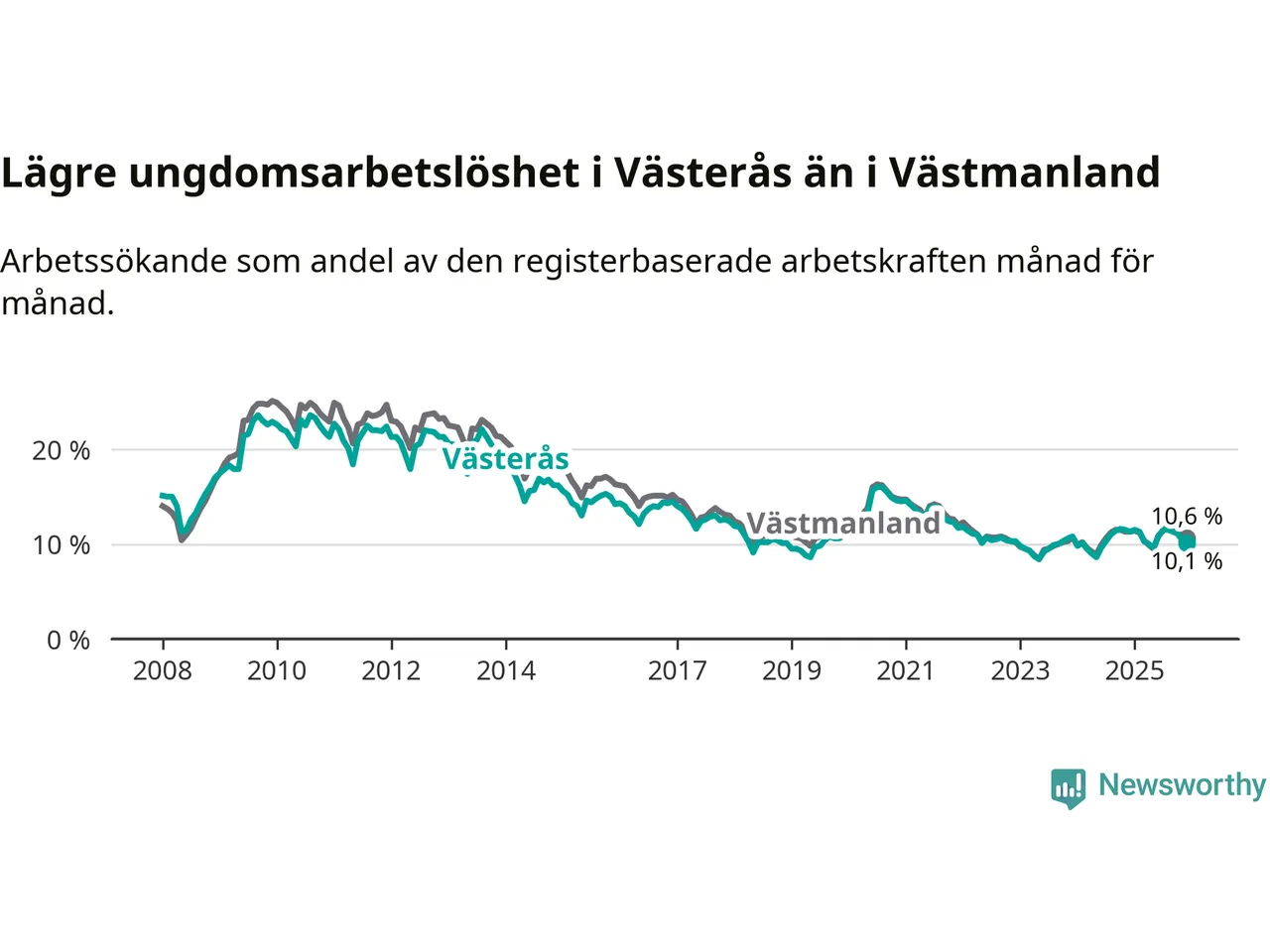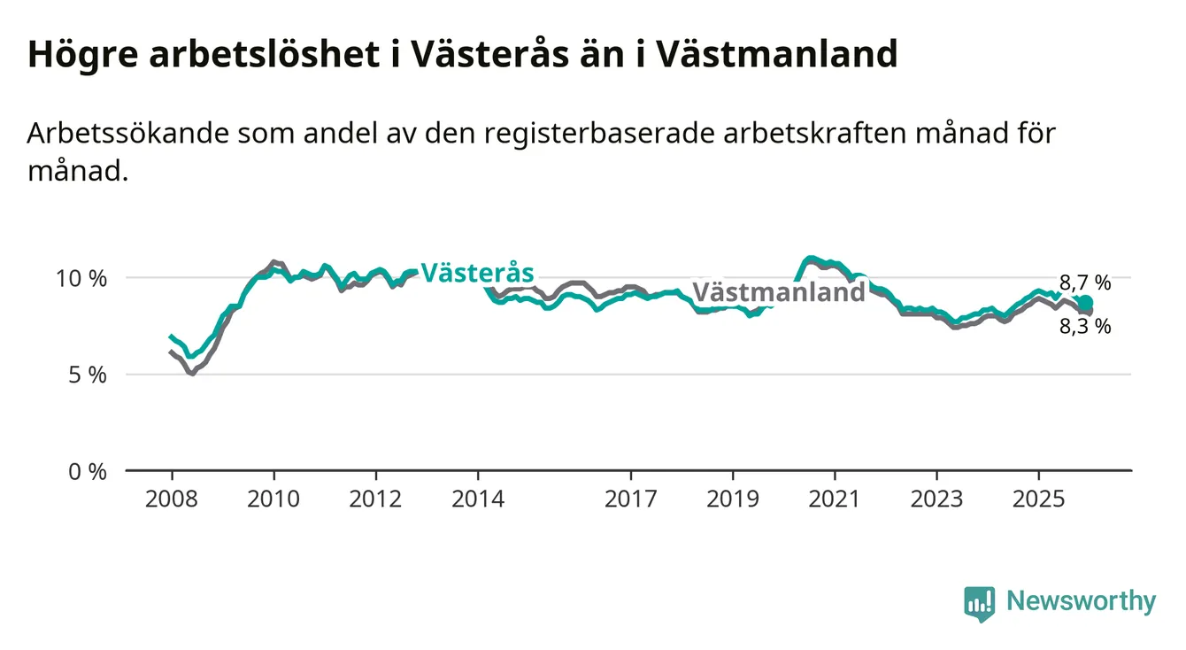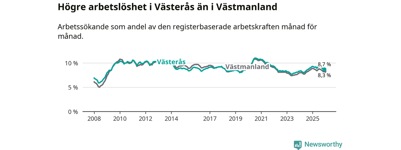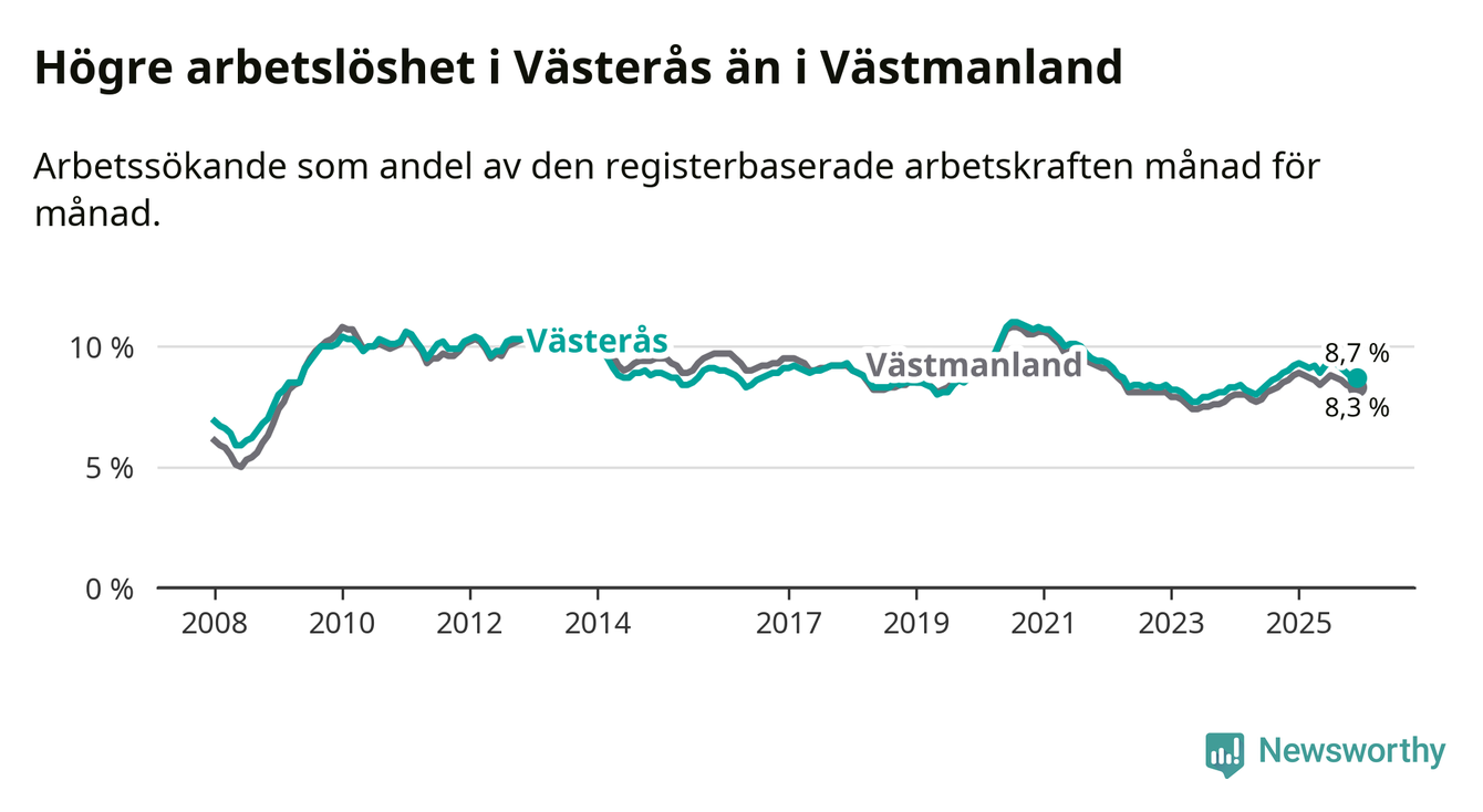 Medan Västerås har högre total arbetslöshet än Västmanland, ligger ungdomsarbetslösheten 0,5 procentenheter lägre i Västerås.