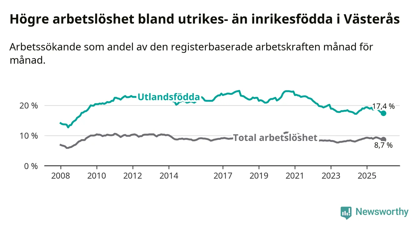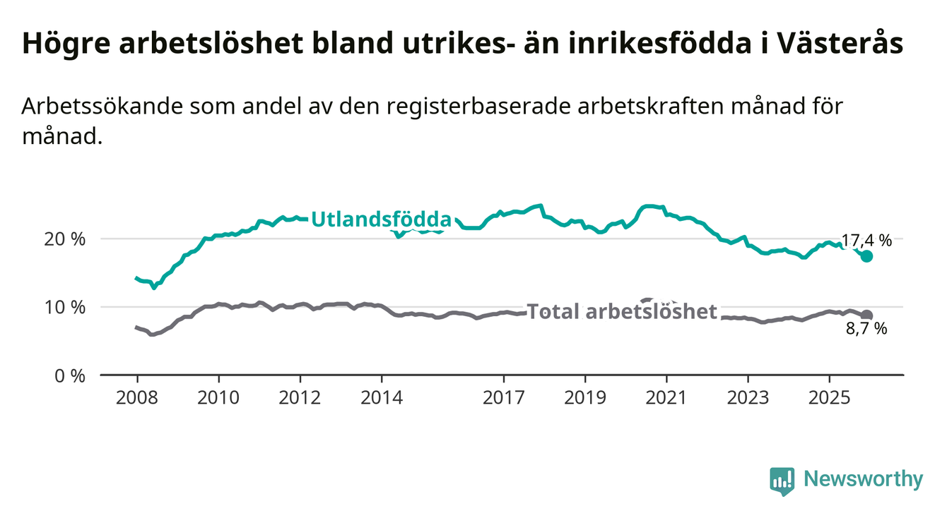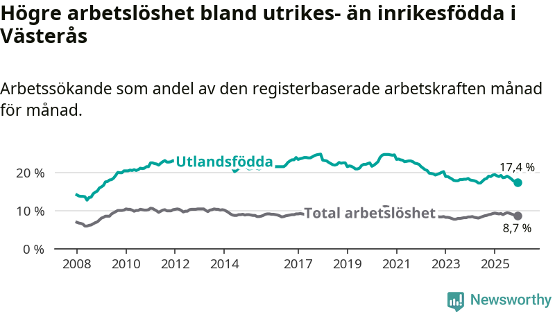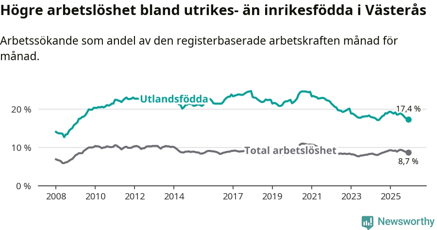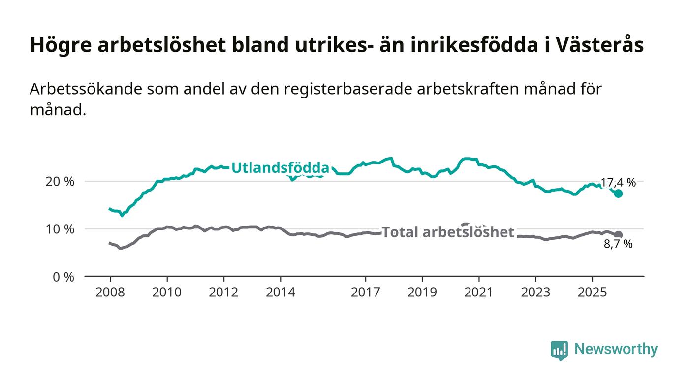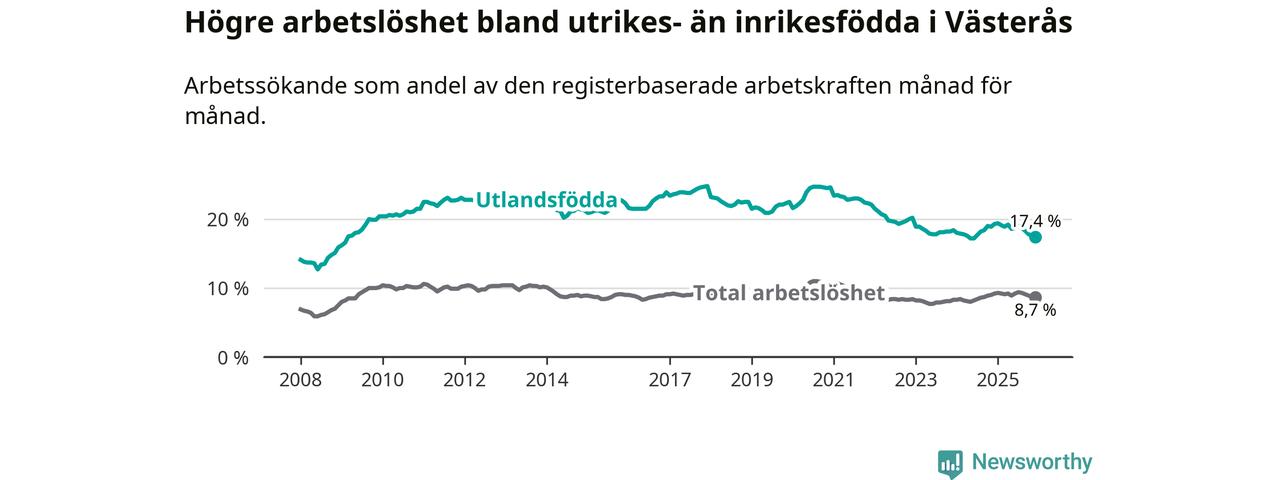 Skillnaden i arbetslöshet mellan utrikesfödda och hela befolkningen är 8,7 procentenheter i Västerås. Det är en mindre skillnad än för ett år sedan (−1,4 procentenheter).