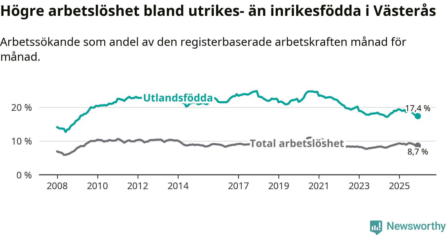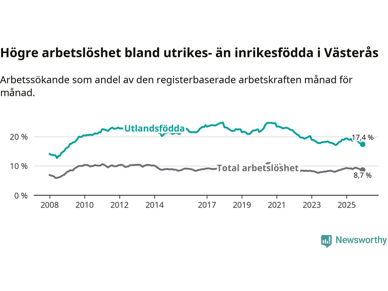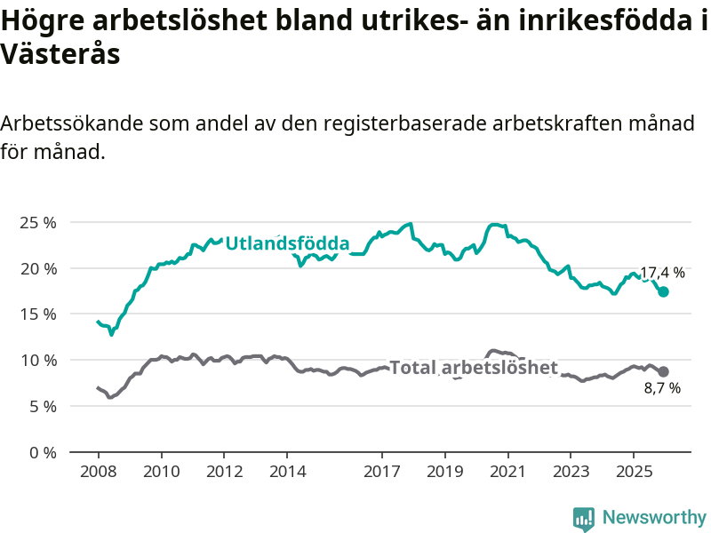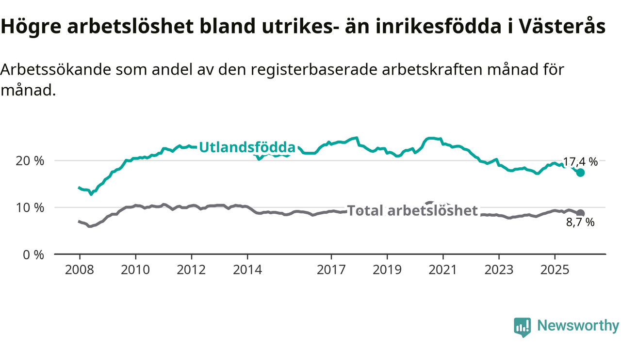 Skillnaden i arbetslöshet mellan utrikesfödda och hela befolkningen är 8,7 procentenheter i Västerås. Det är en mindre skillnad än för ett år sedan (−1,4 procentenheter).