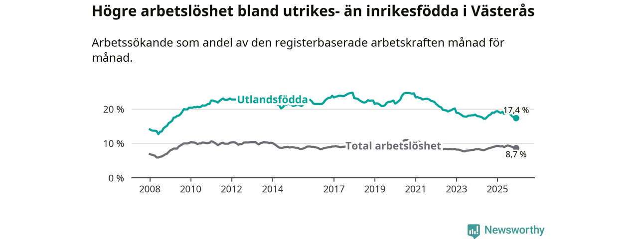 Arbetslösheten bland utlandsfödda var 17,4 procent i Västerås under december månad, motsvarande 4 327 av 24 868 personer. Det är 1,9 procentenheter färre än vid samma tidpunkt i fjol (−348 om man räknar personer).