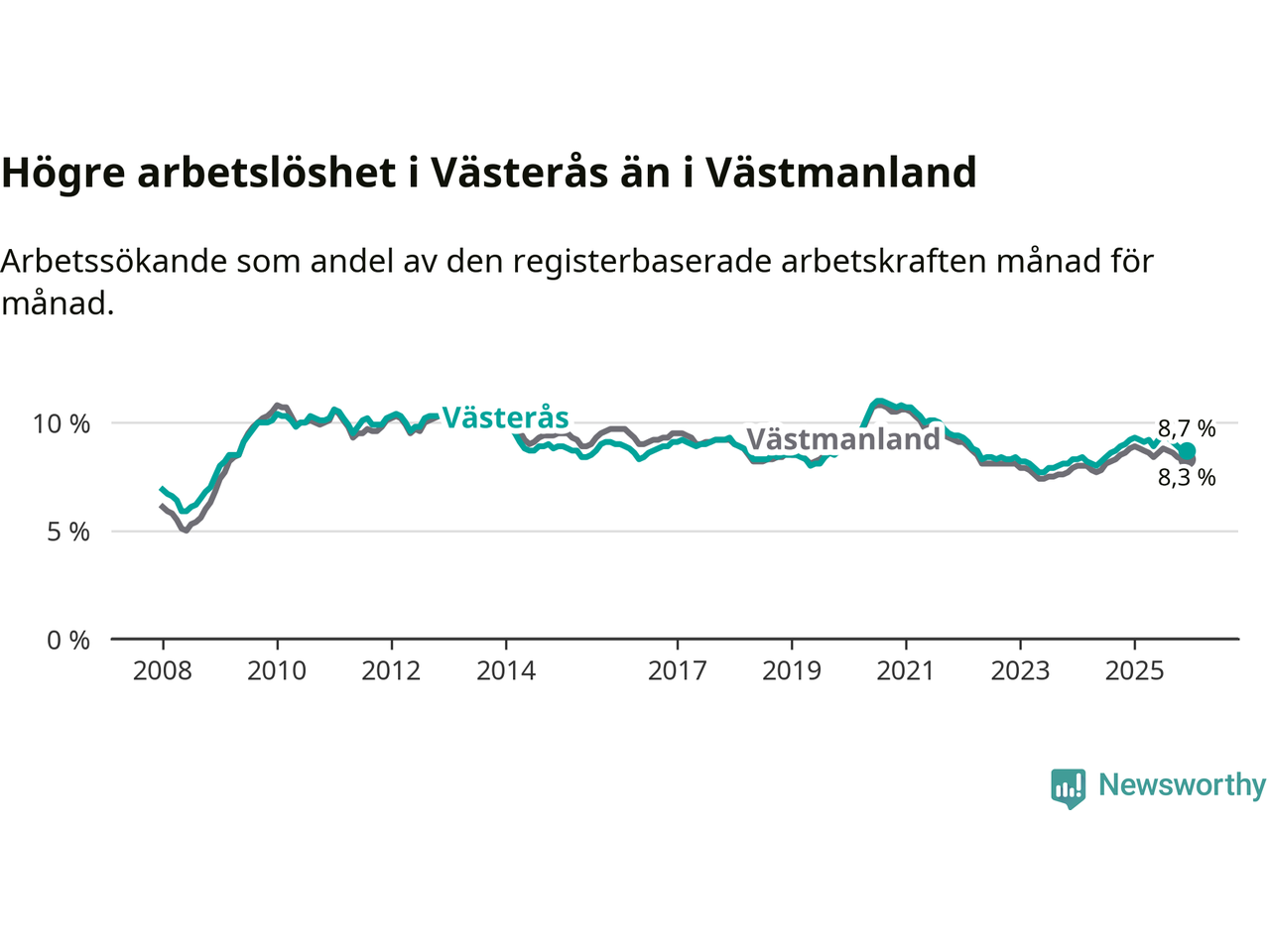 Även om arbetslösheten i Västerås alltså minskar, så ligger den fortfarande över snittet i hela Västmanlands län (8,7 procent i kommunen, jämfört med 8,3 procent i hela länet). Surahammar har den lägsta arbetslösheten i länet (6,5 procent), medan Fagersta har den högsta (9,8 procent). För att Västerås skulle komma ner i samma arbetslöshetsnivå som Surahammar skulle 1 798 personer behöva sysselsättas.