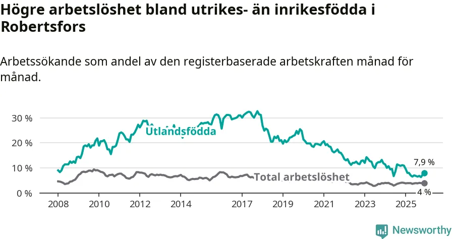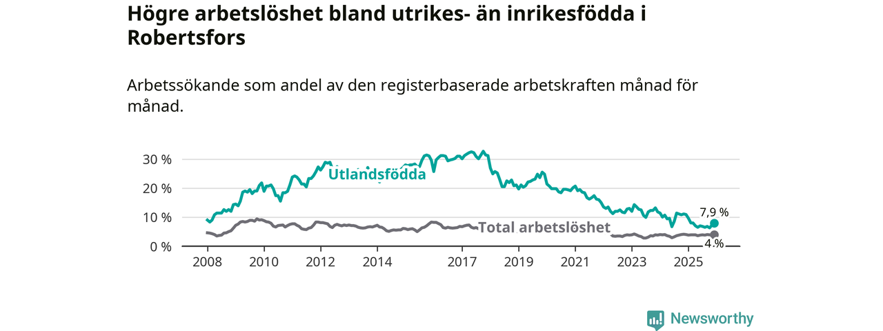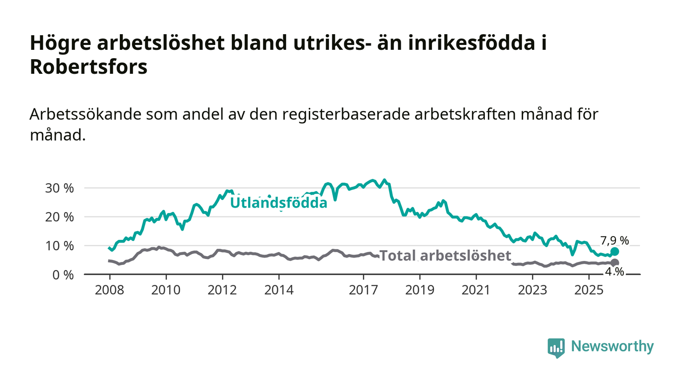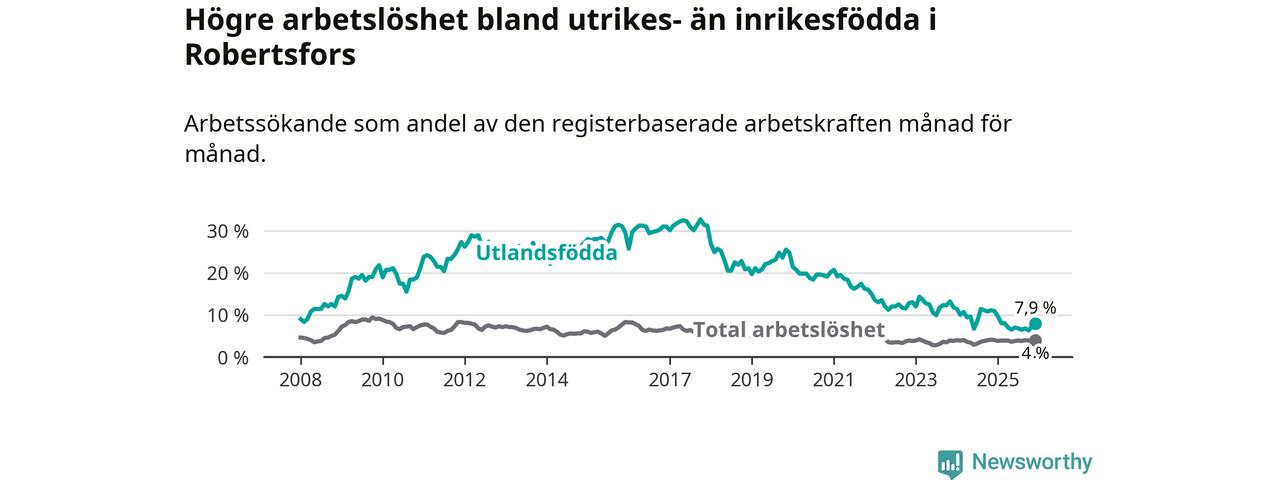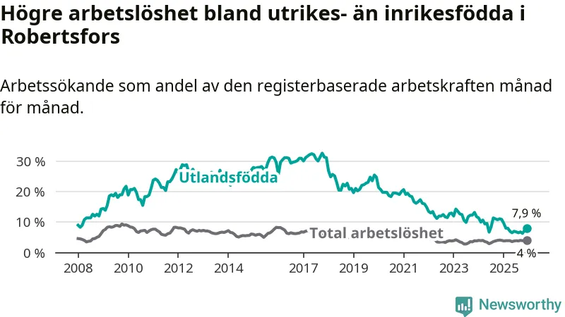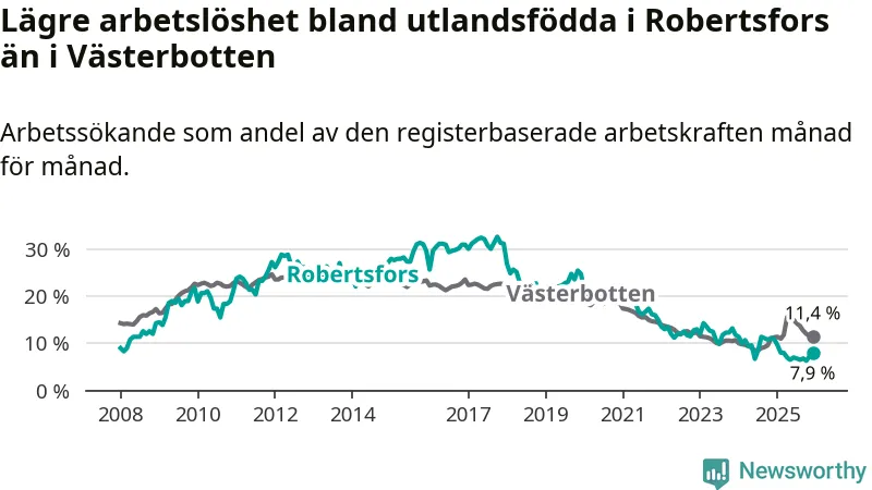 Skillnaden i arbetslöshet mellan utrikesfödda och hela befolkningen är 3,9 procentenheter i Robertsfors. Det är en betydligt mindre skillnad än för ett år sedan (−3,0 procentenheter).