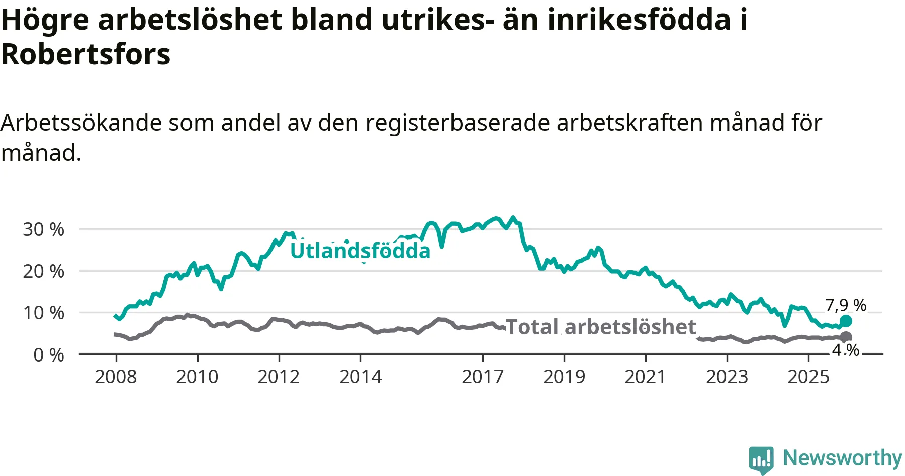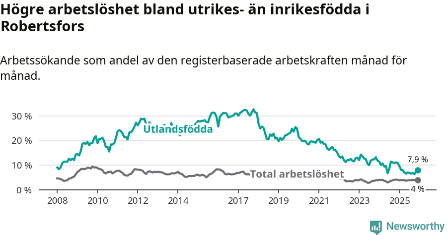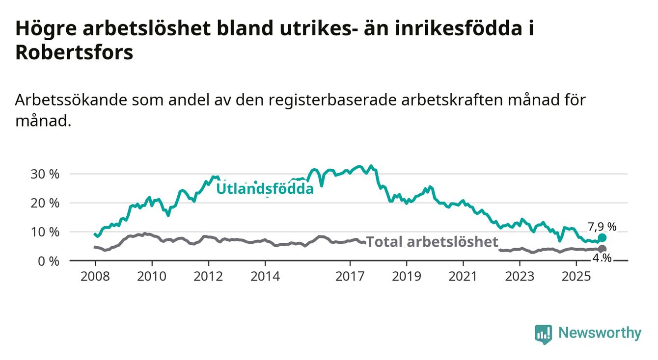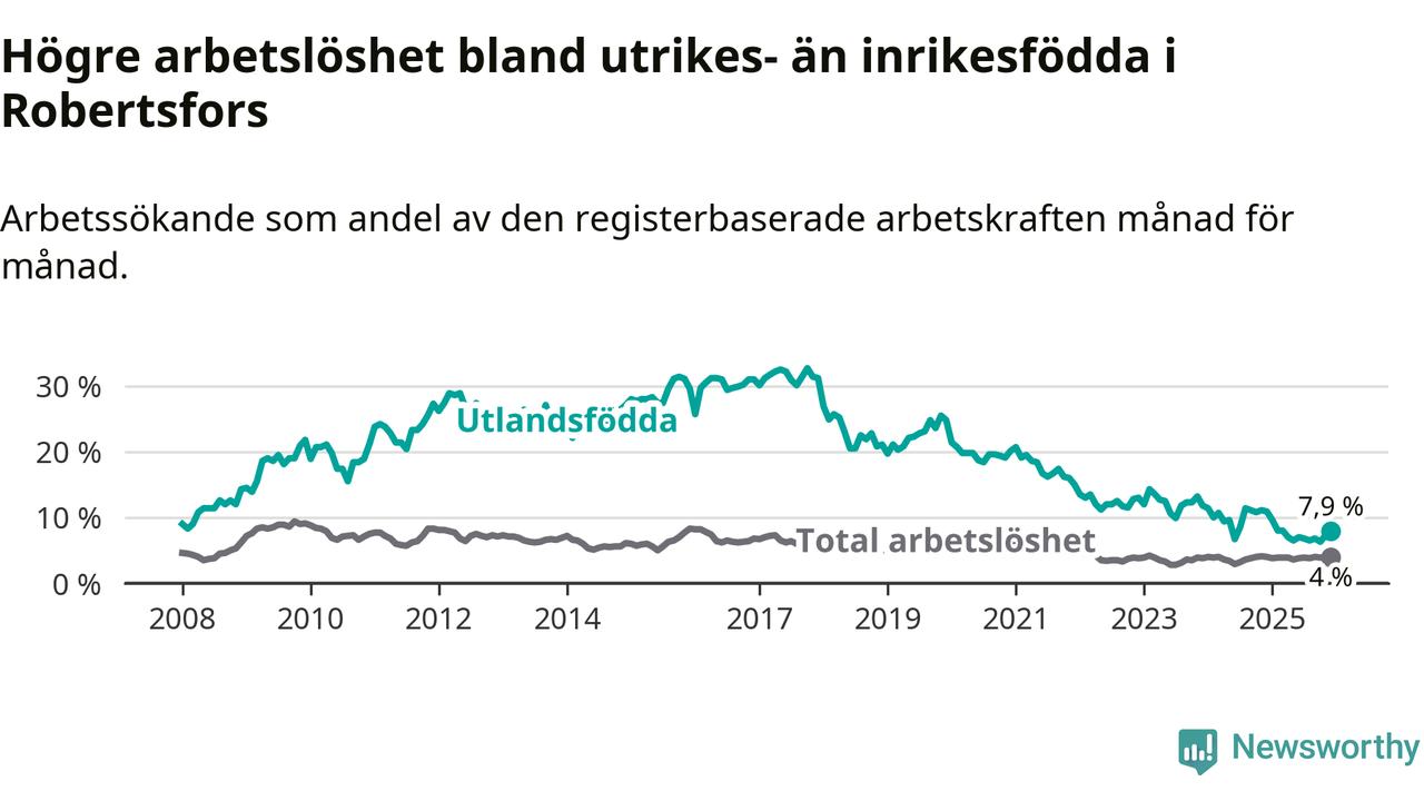 Skillnaden i arbetslöshet mellan utrikesfödda och hela befolkningen är 3,9 procentenheter i Robertsfors. Det är en betydligt mindre skillnad än för ett år sedan (−3,0 procentenheter).