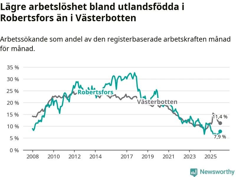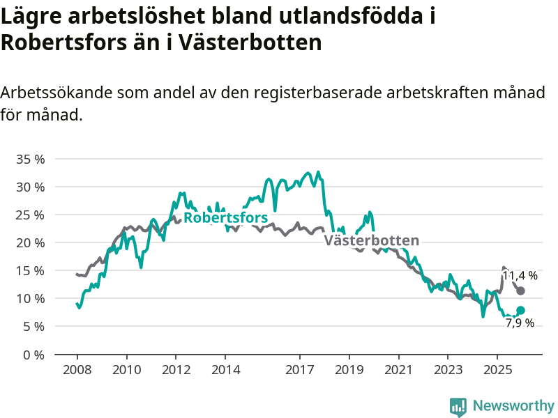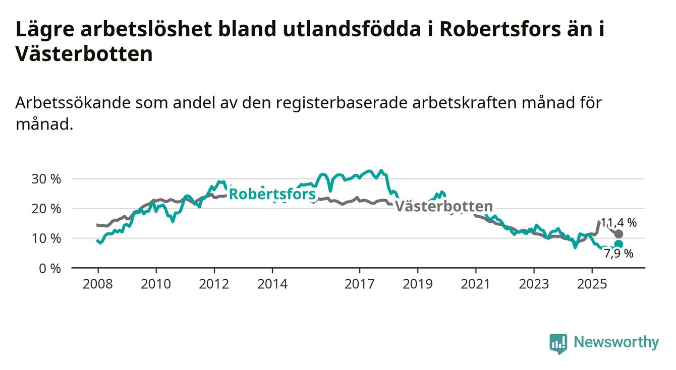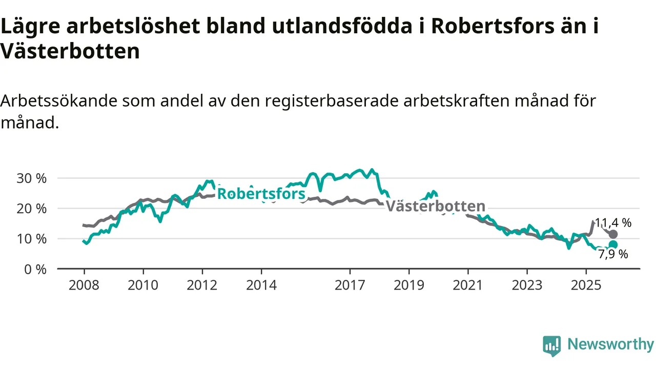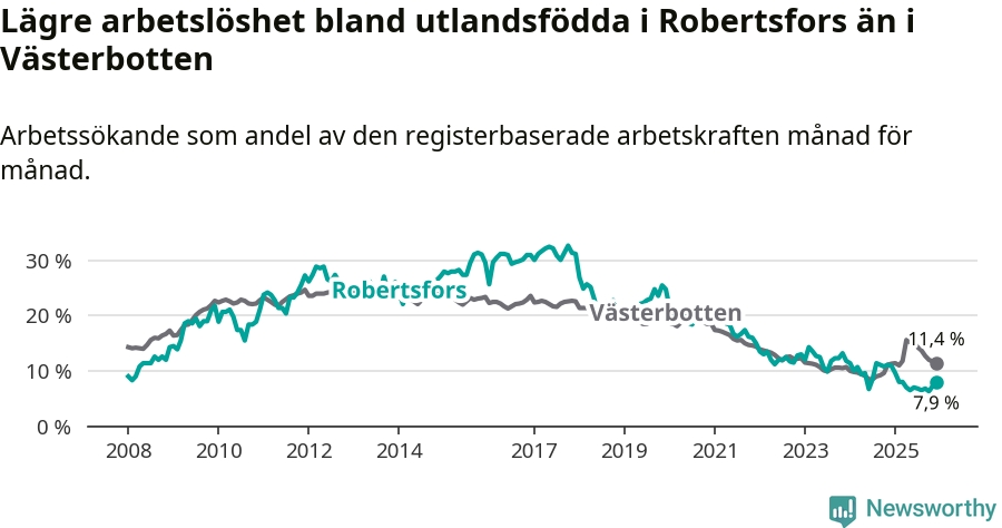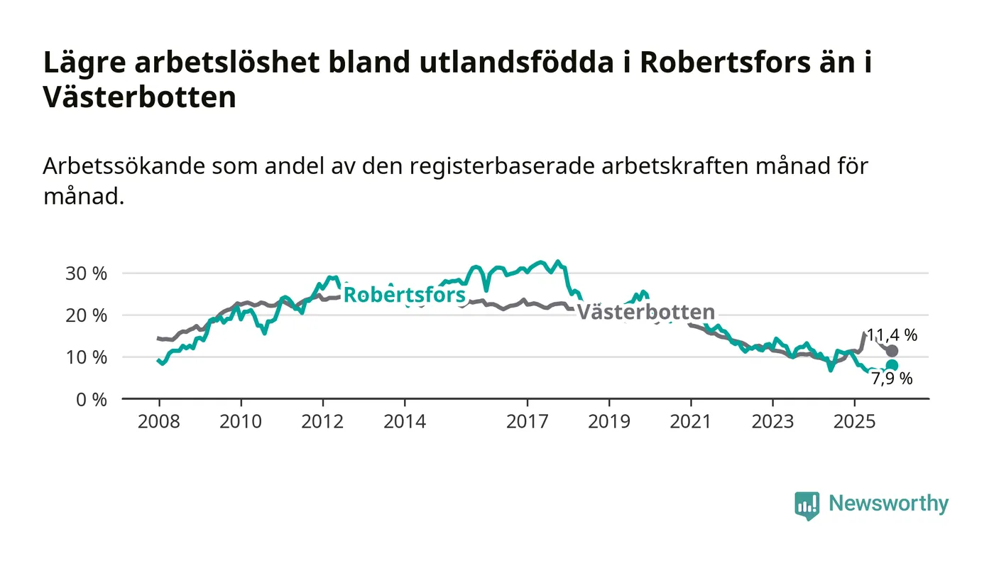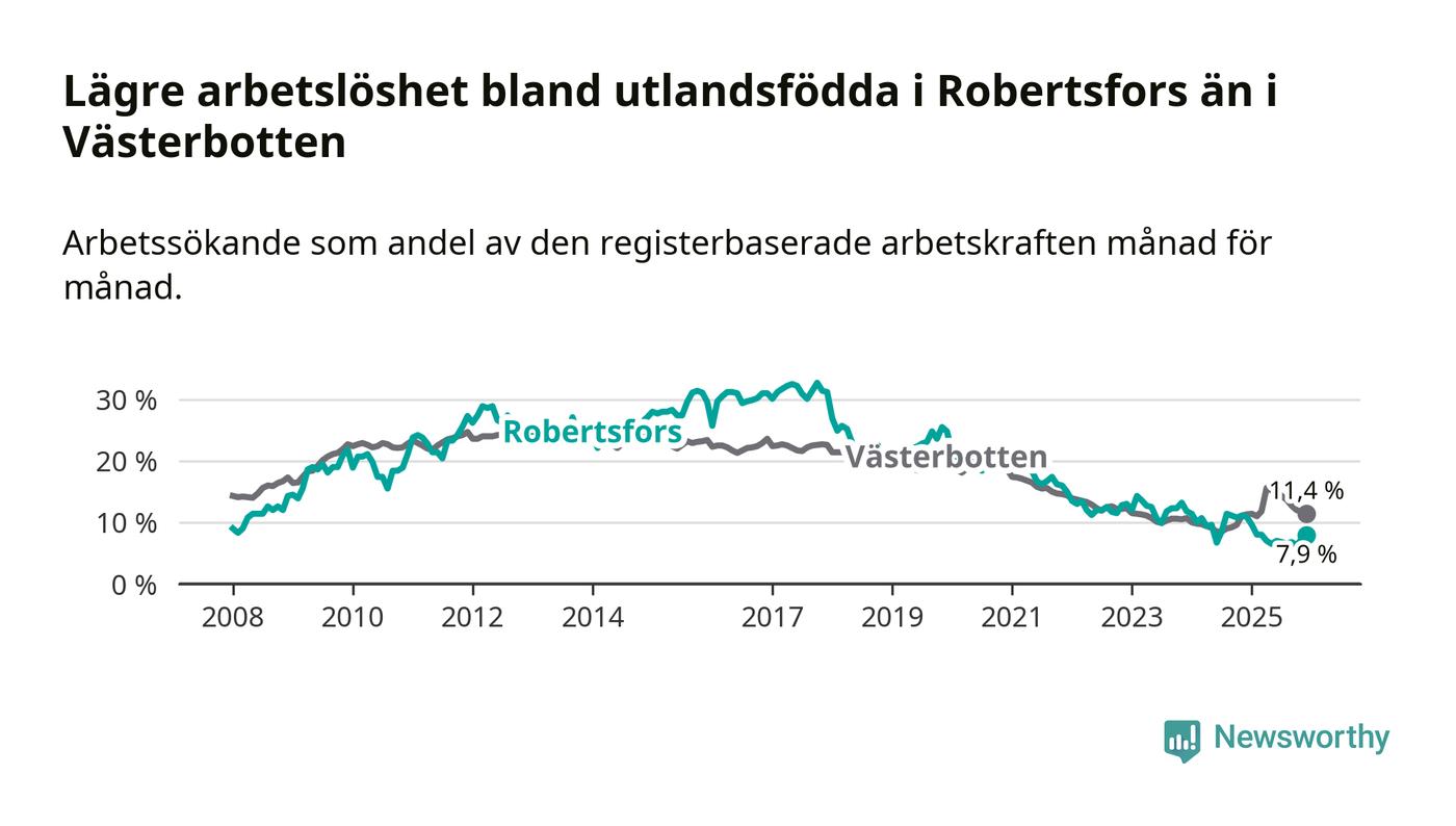 Arbetslösheten bland utlandsfödda var 7,9 procent i Robertsfors under december månad, motsvarande 30 av 380 personer. Det är 3,0 procentenheter färre än vid samma tidpunkt i fjol (−12 om man räknar personer). Därmed är de utlandsföddas arbetslöshet lägre än vid samma tidpunkt i fjol för sjätte månaden i följd.