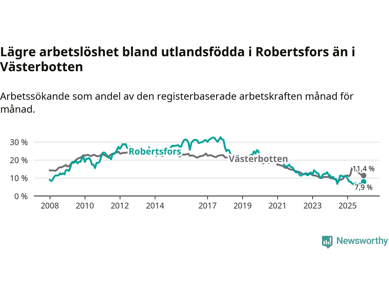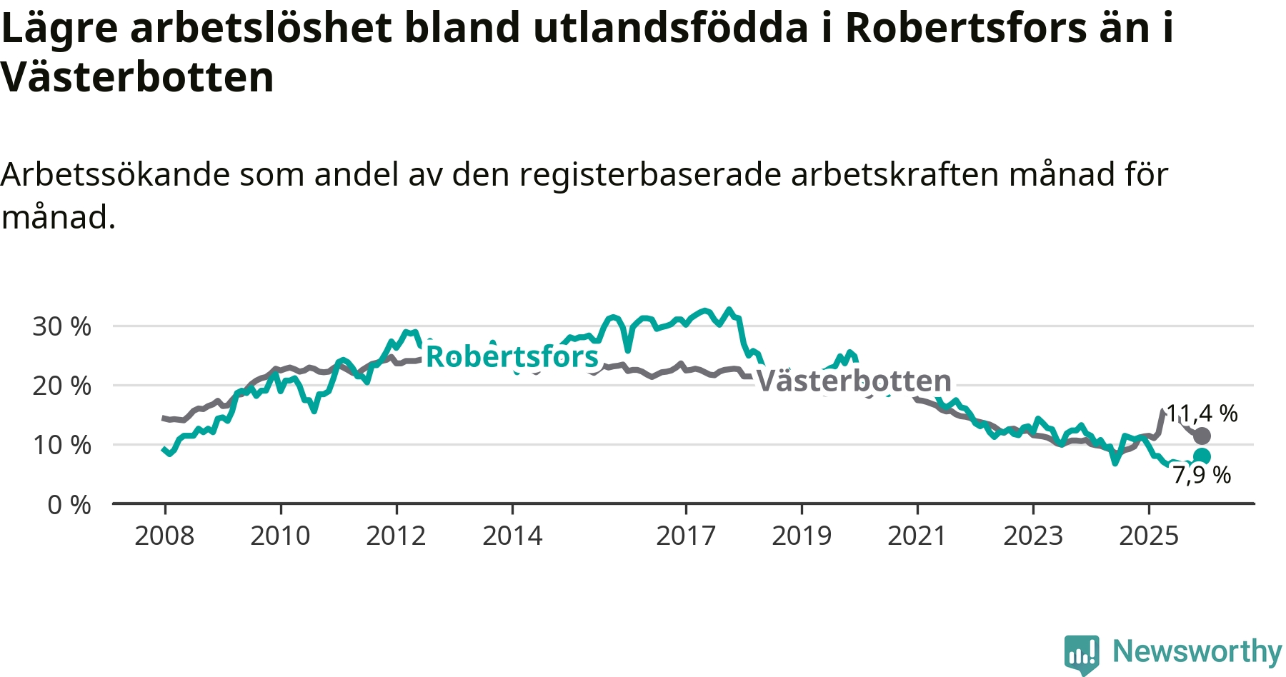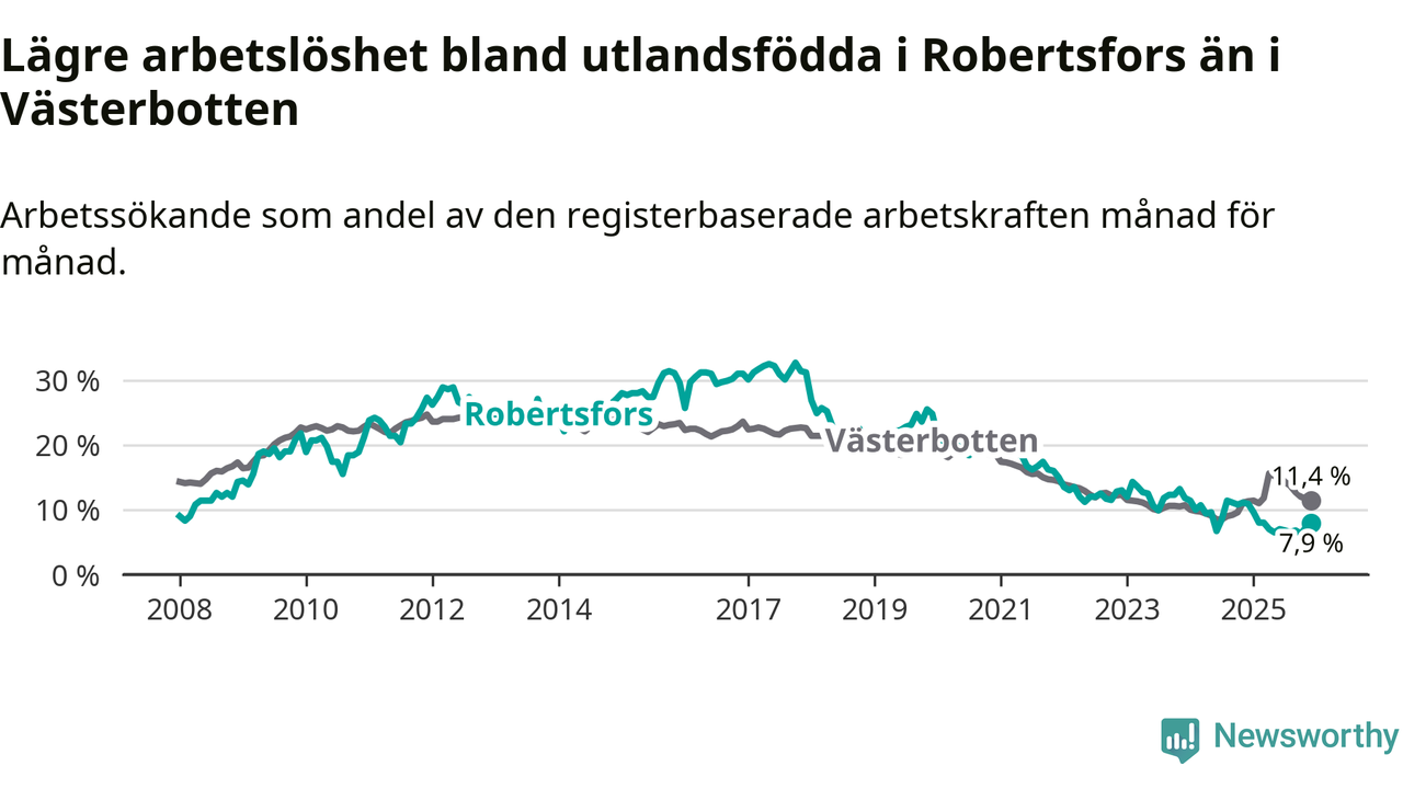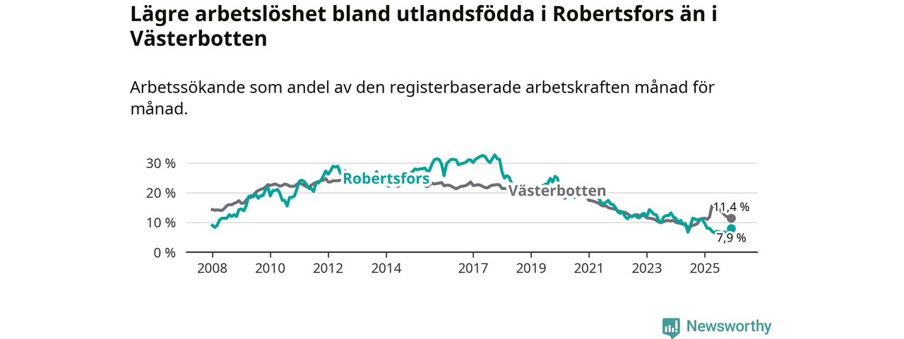 Medan arbetslösheten bland utlandsfödda alltså minskar i Robertsfors så ökar den i Västerbotten. Jämfört med december förra året har andelen arbetslösa utlandsfödda i länet ökat med 0,1 procentenheter (till 11,4 procent).