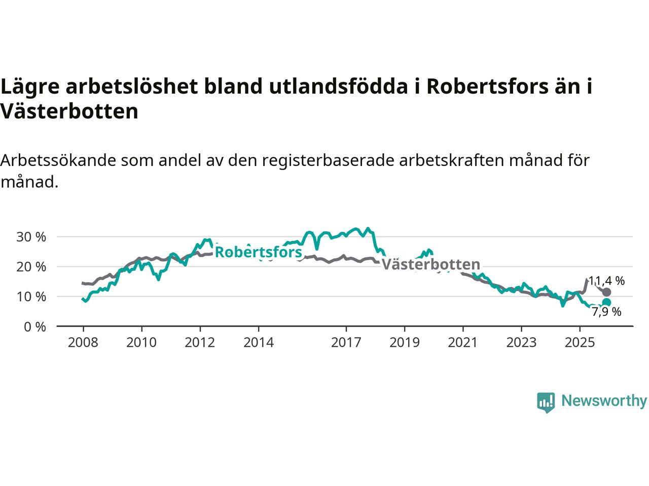 Graf: Arbetslöshet bland utrikesfödda i Robertsfors kommun och Västerbottens län