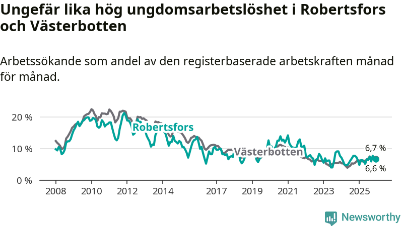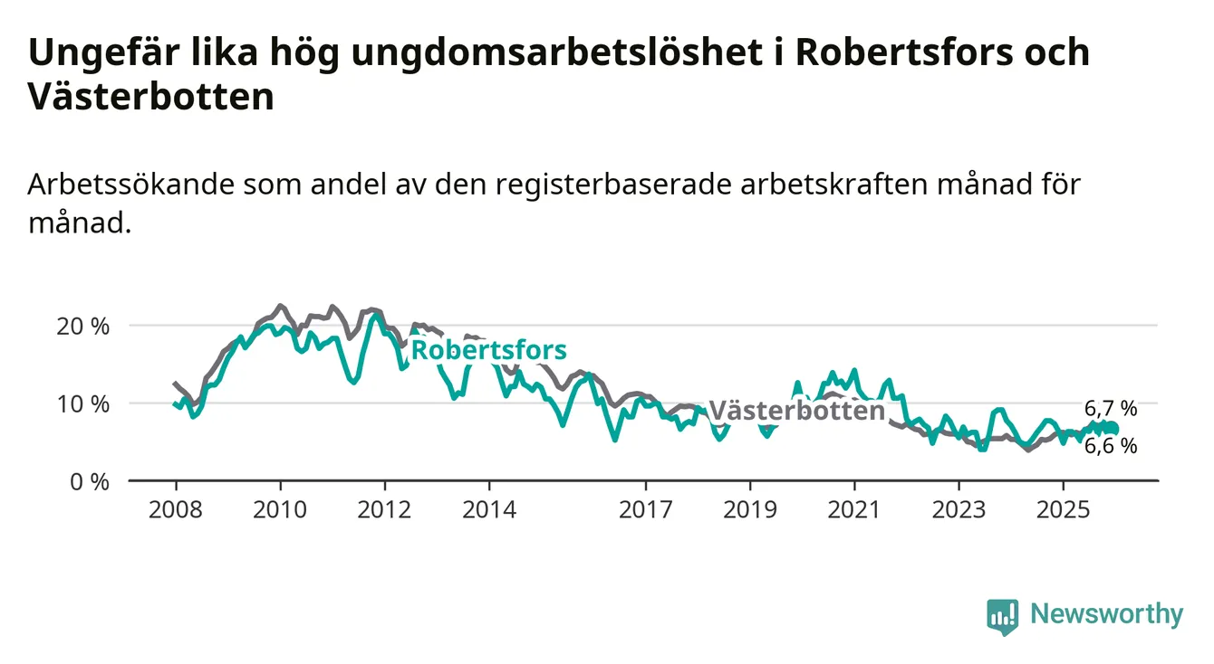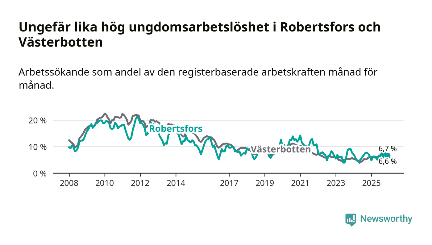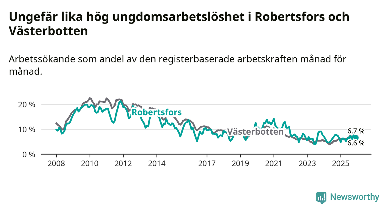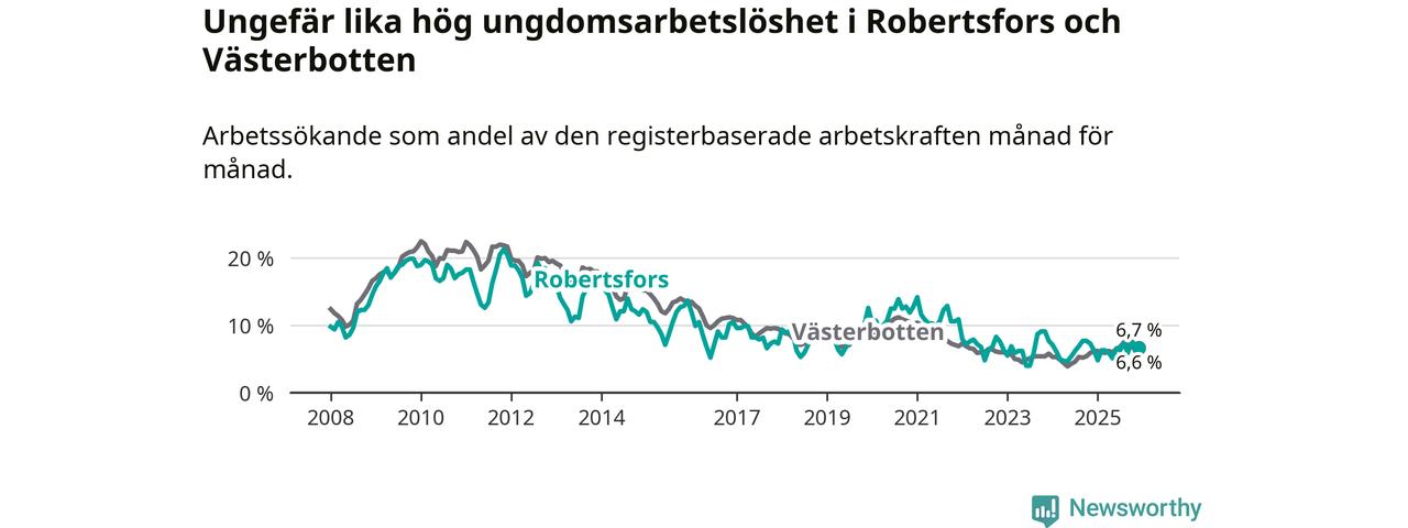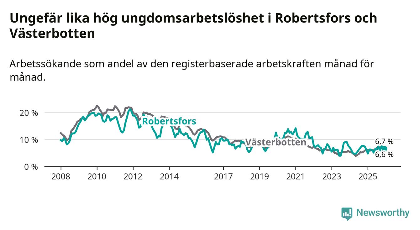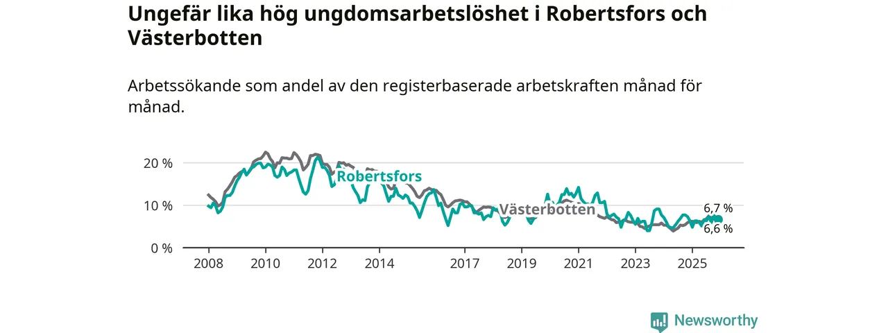 Medan Robertsfors har lägre total arbetslöshet än Västerbotten, ligger ungdomsarbetslösheten på i stort sett samma nivå.