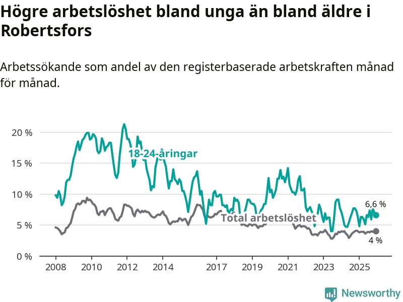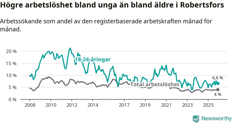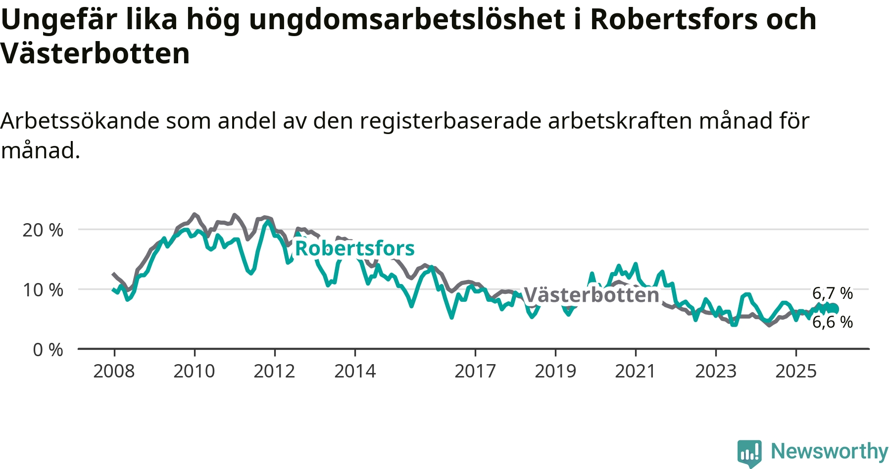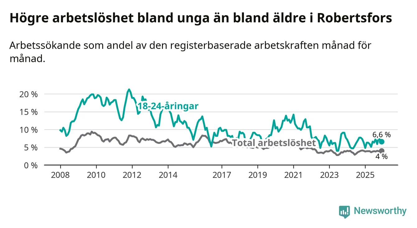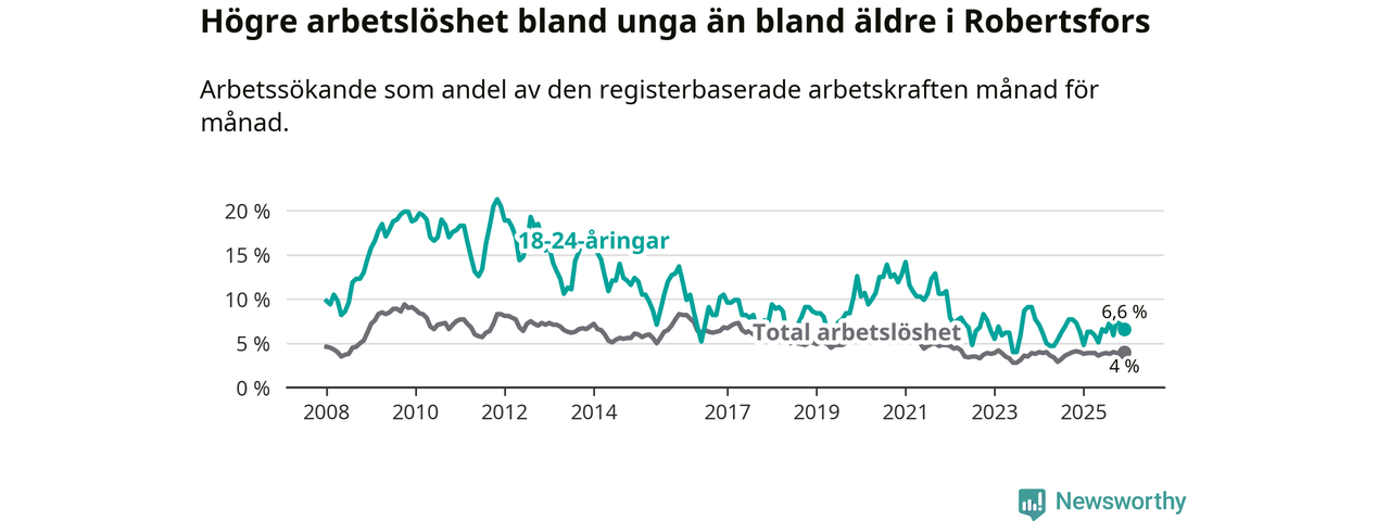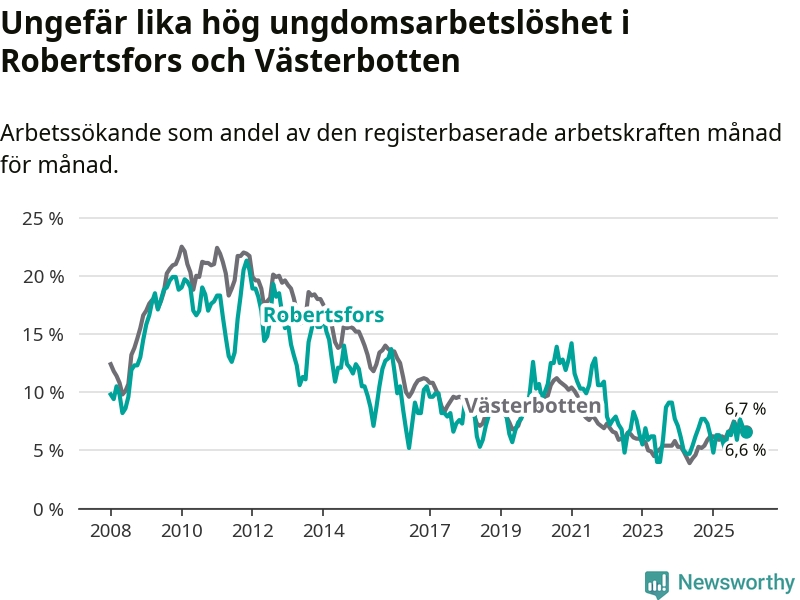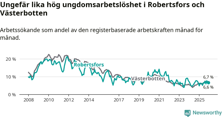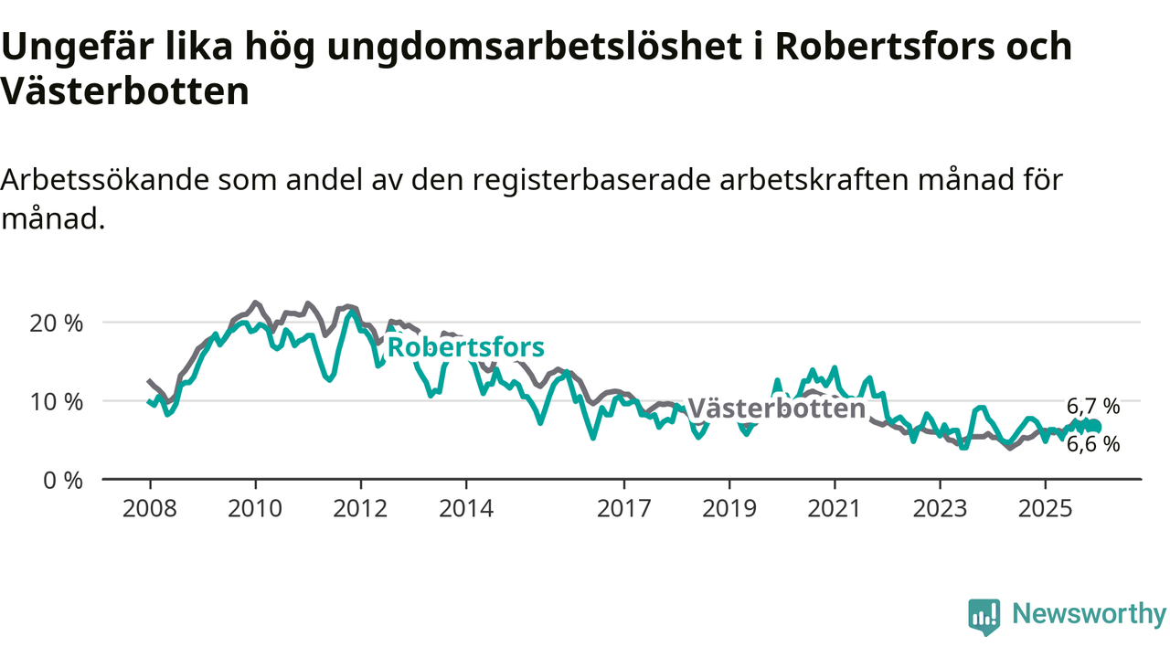 Medan Robertsfors har lägre total arbetslöshet än Västerbotten, ligger ungdomsarbetslösheten på i stort sett samma nivå.