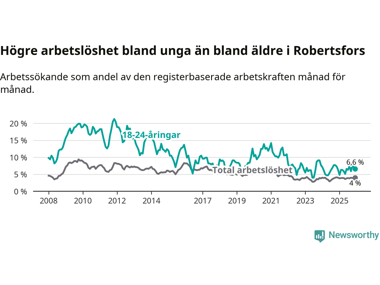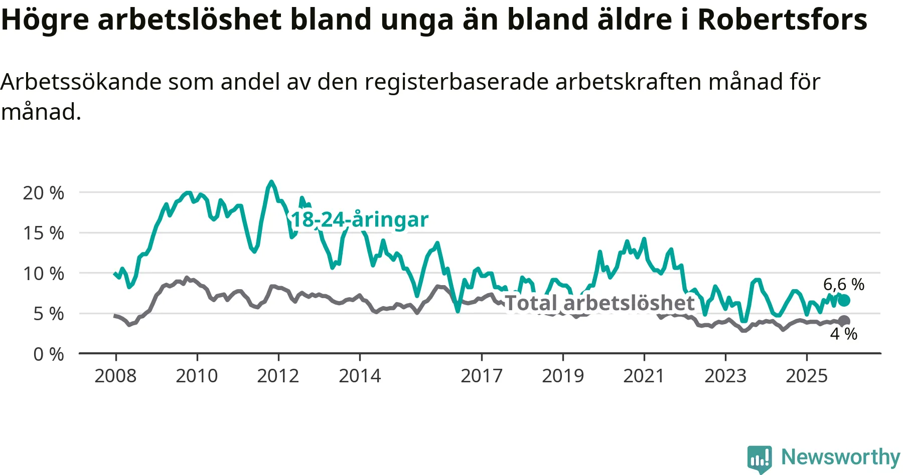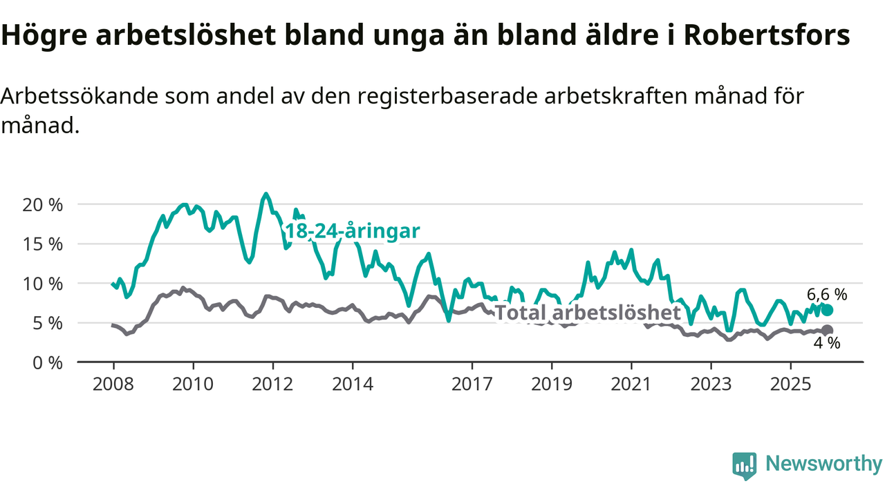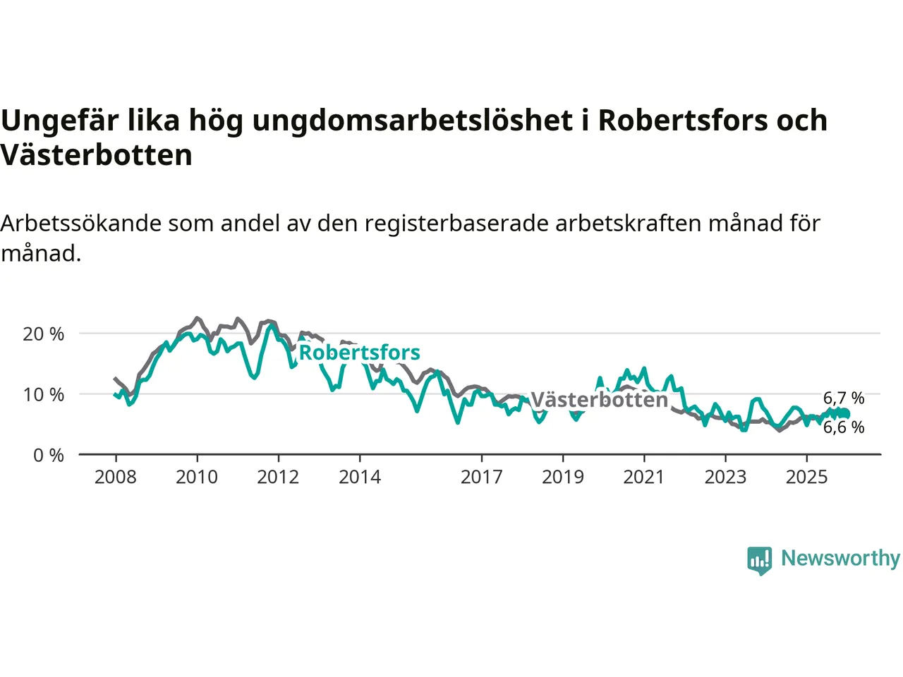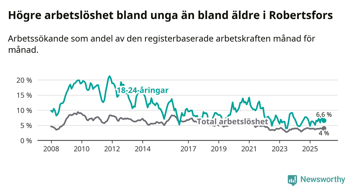 Medan Robertsfors har lägre total arbetslöshet än Västerbotten, ligger ungdomsarbetslösheten på i stort sett samma nivå.
