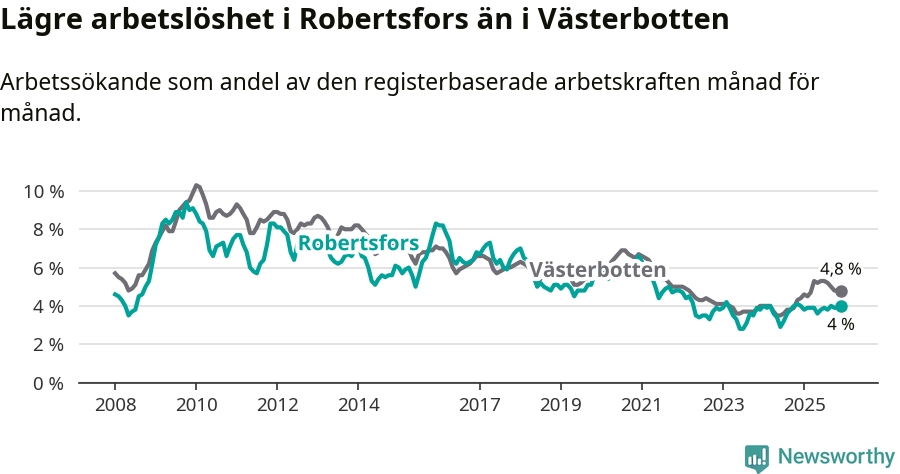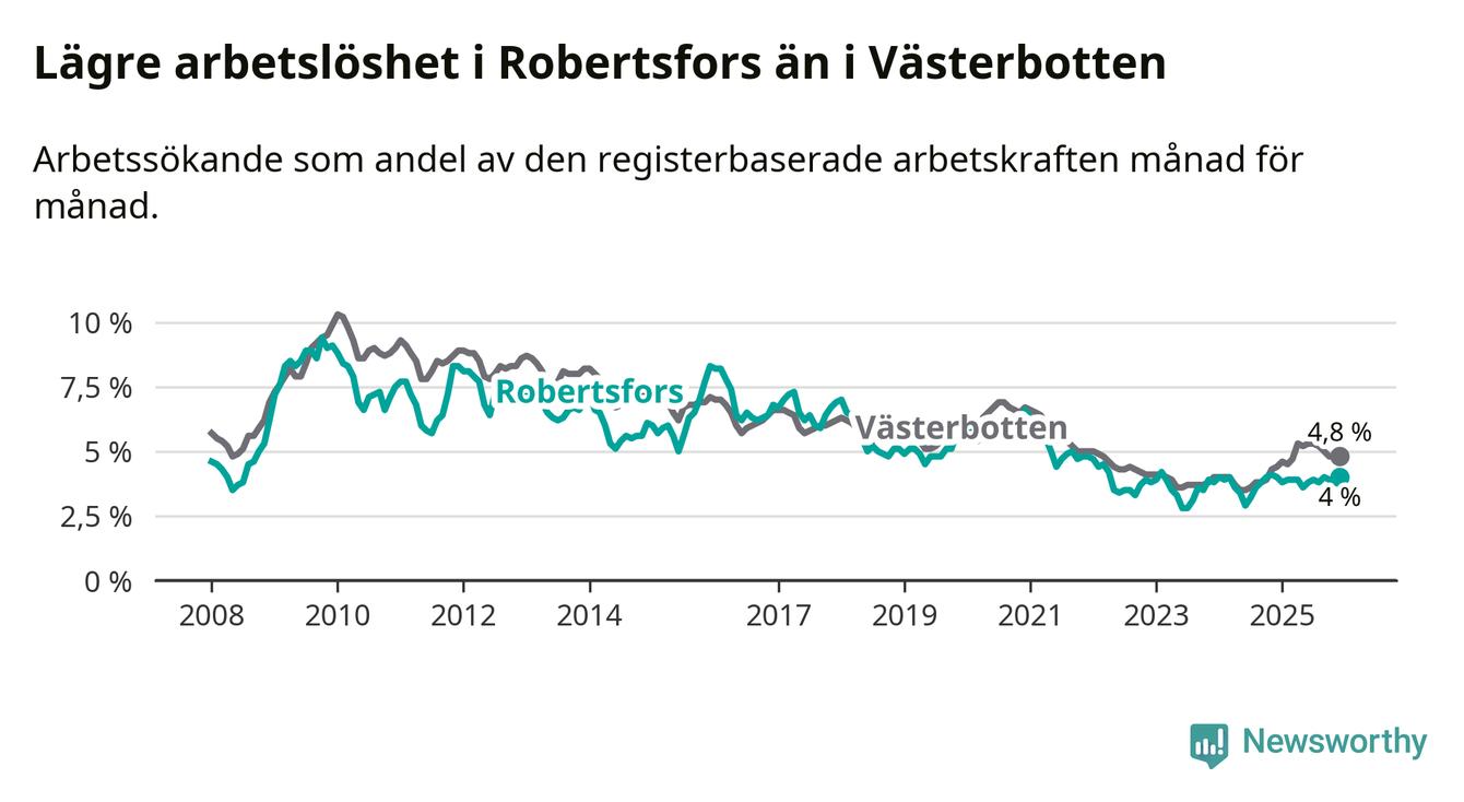 Graf: Arbetslöshet i Robertsfors kommun och Västerbottens län