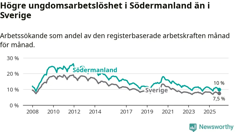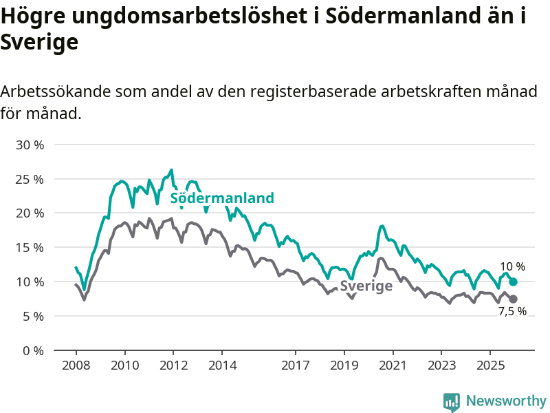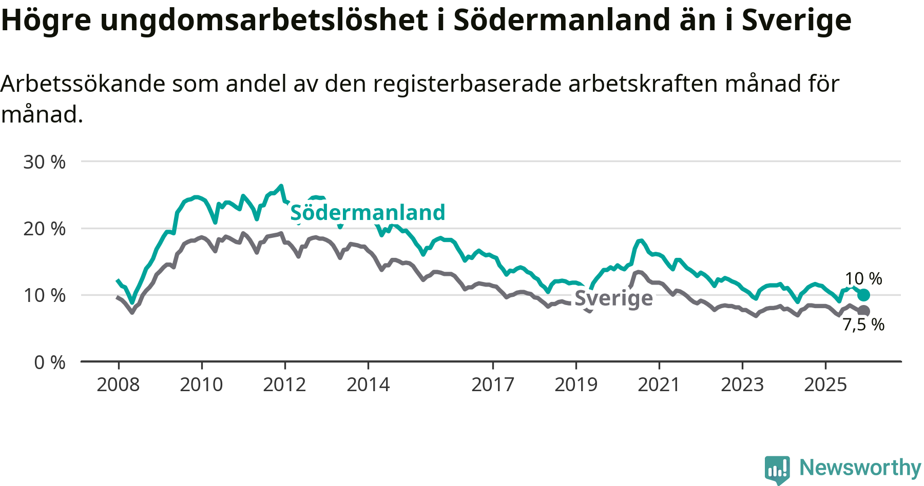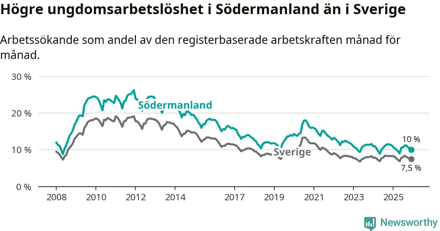 Precis som den totala arbetslösheten ligger ungdomsarbetslösheten i Södermanland högre än i Sverige som helhet. Skillnaden mellan länet och riket är 2,5 procentenheter.
