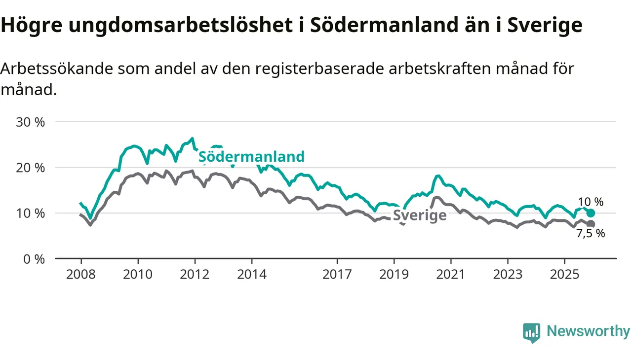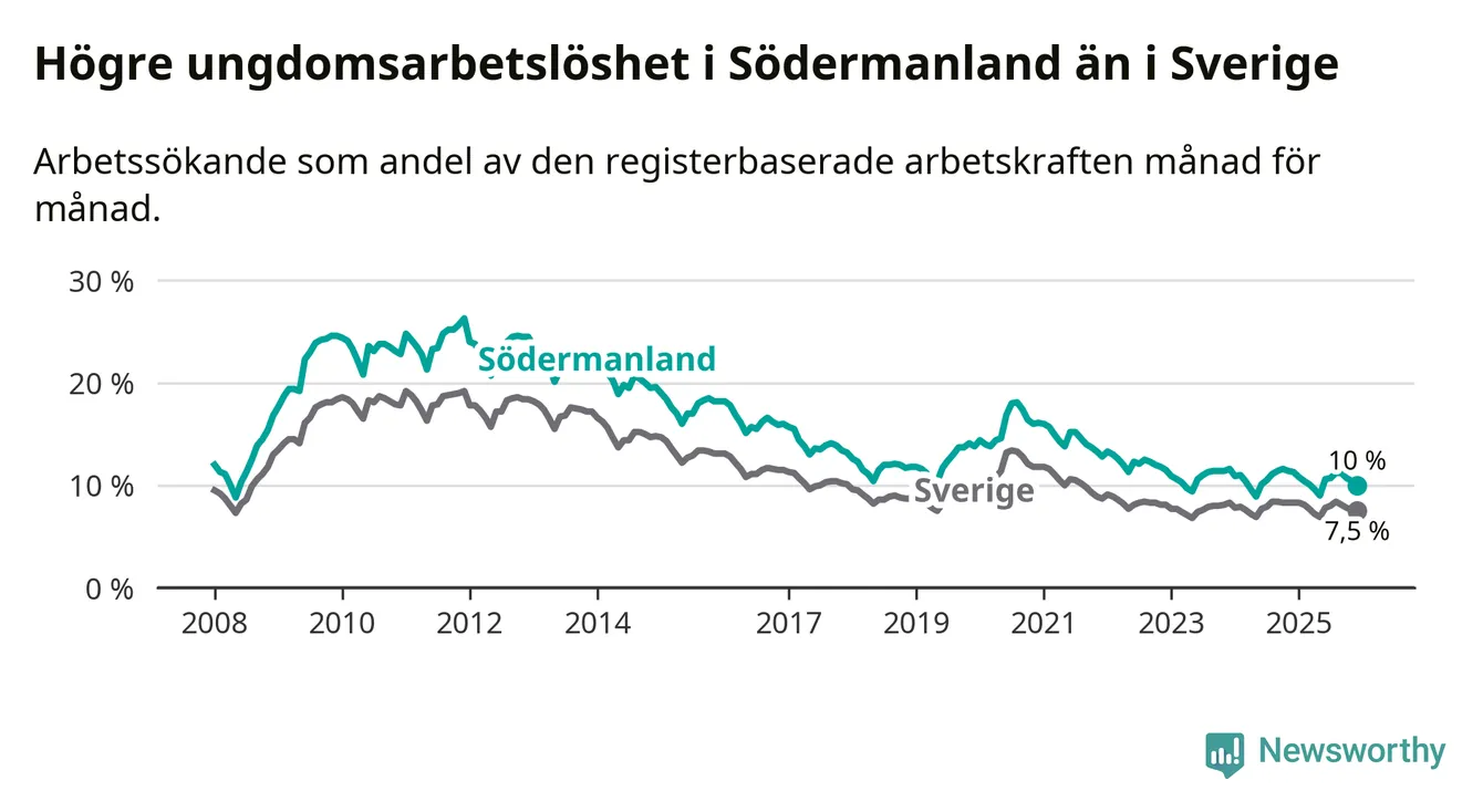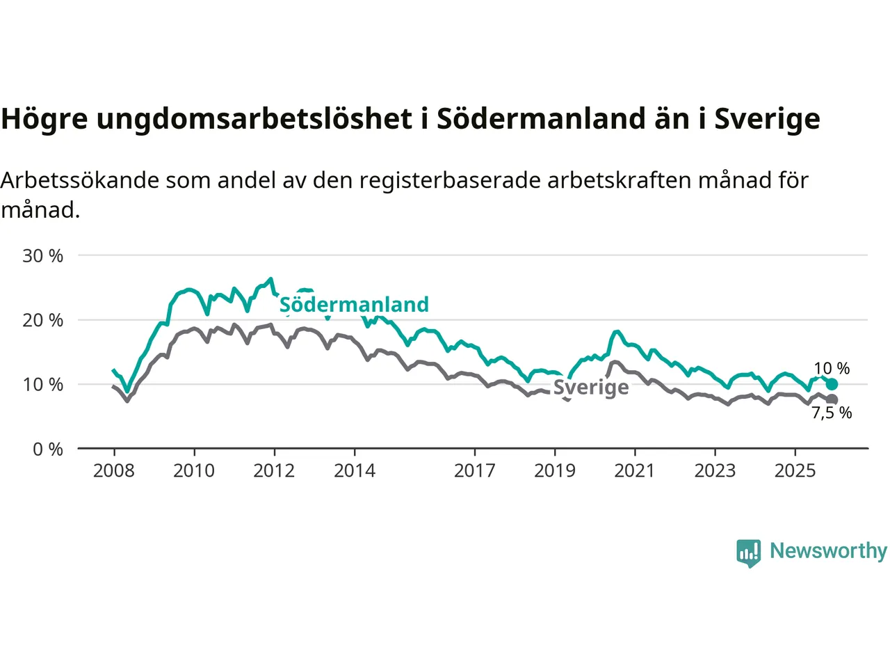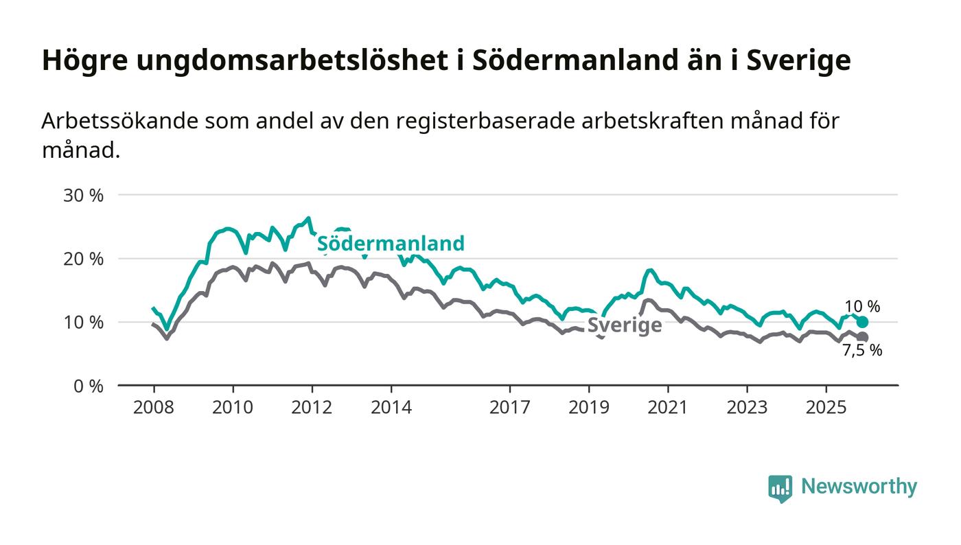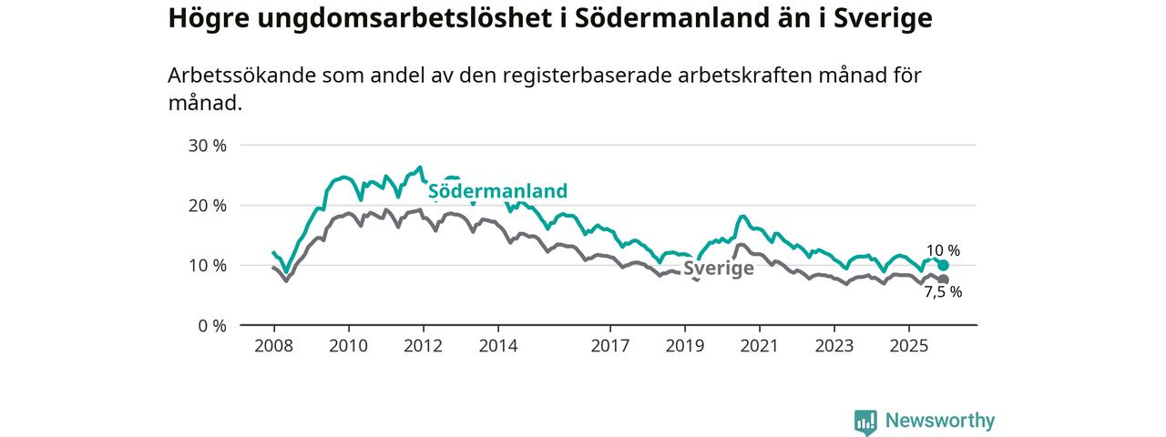 Graf: Arbetslöshet bland unga i Södermanlands län och Sverige