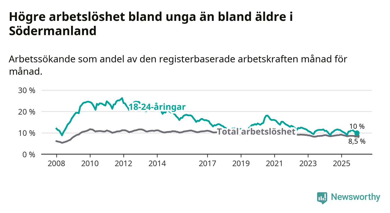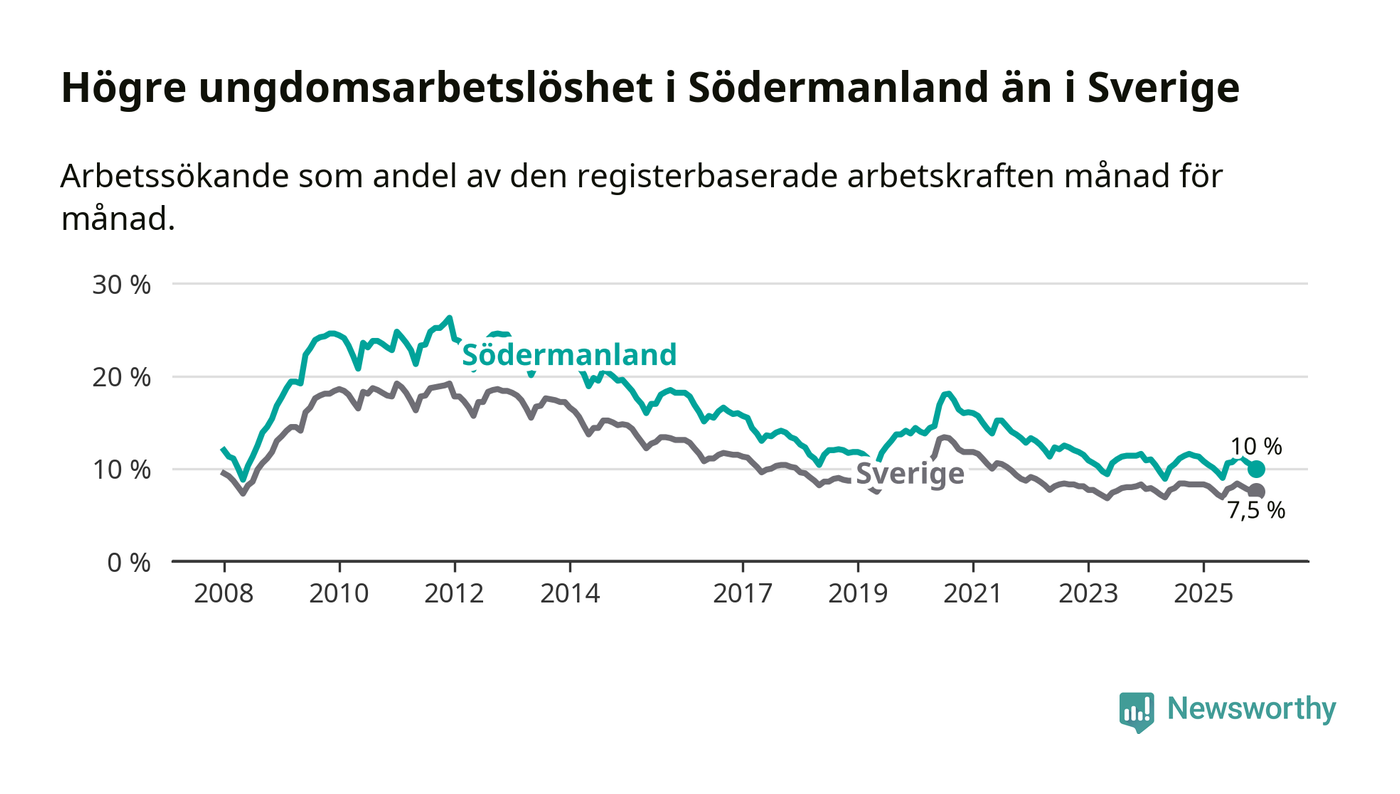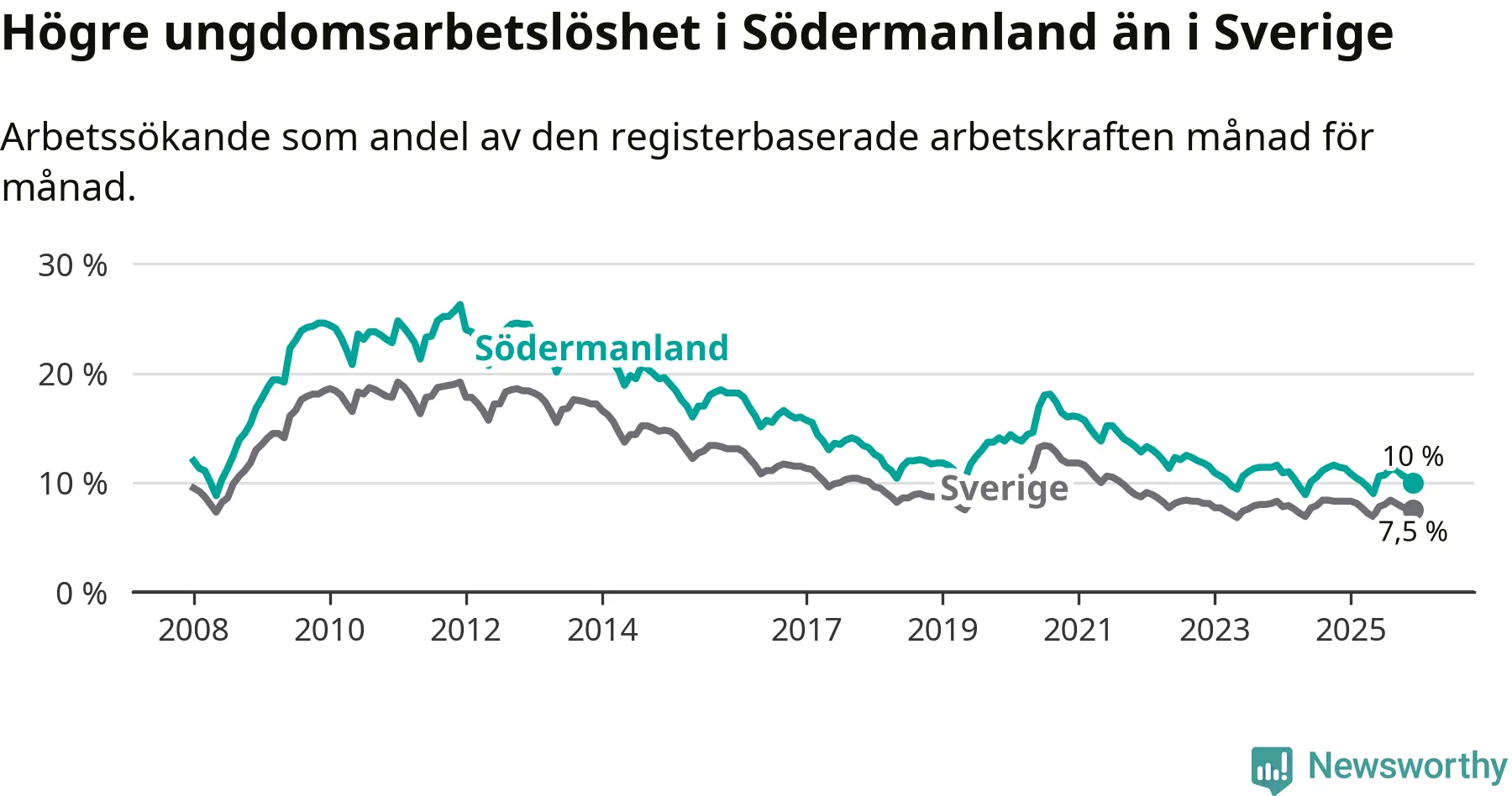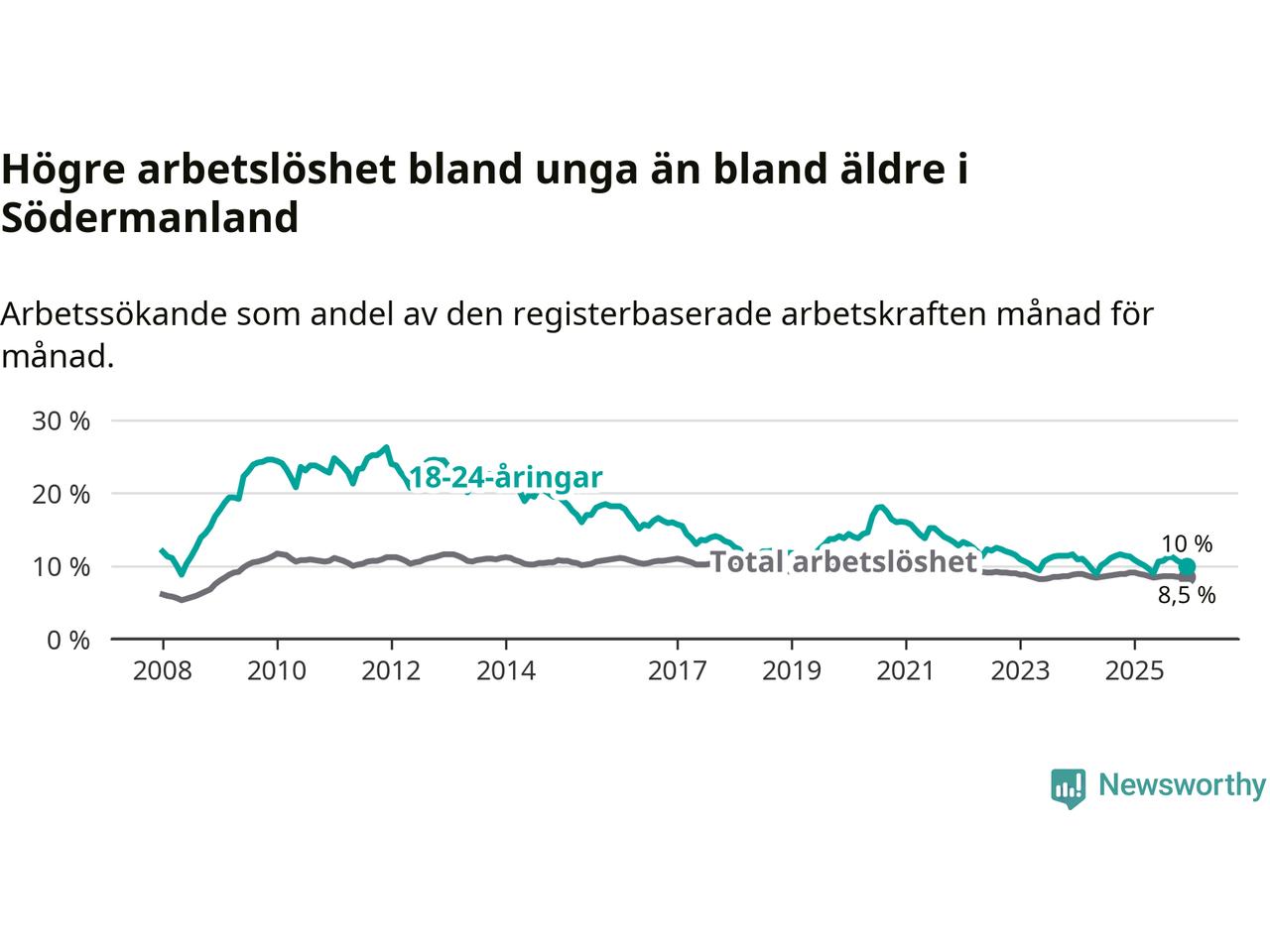 Graf: Arbetslöshet bland unga i Södermanlands län och Sverige