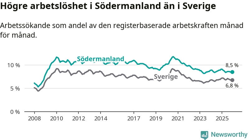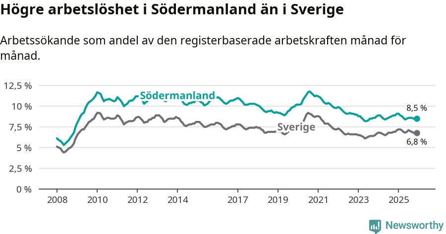 Under december månad rapporterade Södermanlands län en total arbetslöshet på 8,5 procent. Det är en minskning jämfört med samma tidpunkt i fjol (−0,6 procentenheter). Även i Sverige sjunker arbetslösheten .