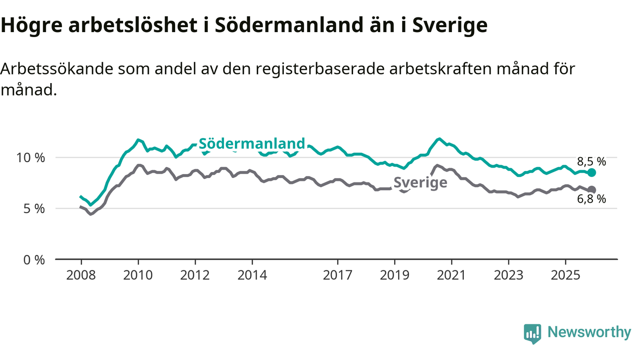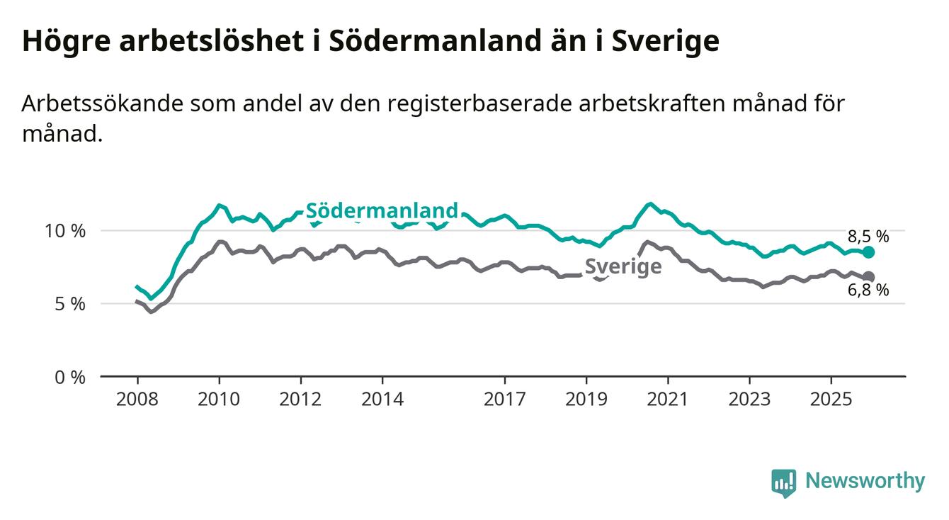Även om arbetslösheten i Södermanland alltså minskar, så ligger den fortfarande över snittet i hela Sverige (8,5 procent i länet, jämfört med 6,8 procent i hela riket). Norrbotten har den lägsta arbetslösheten i riket (3,8 procent), medan Skåne har den högsta (8,9 procent). För att Södermanland skulle komma ner i samma arbetslöshetsnivå som Norrbotten skulle 6 681 personer behöva sysselsättas.