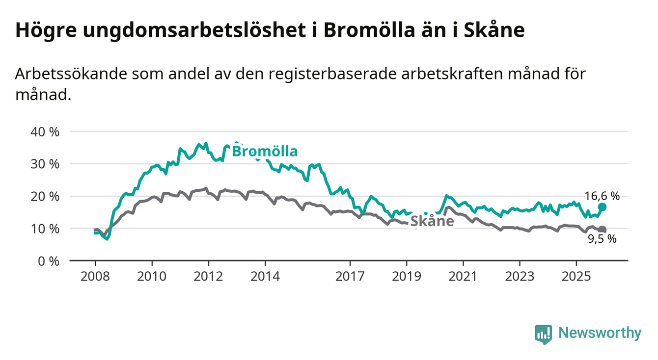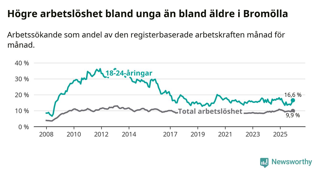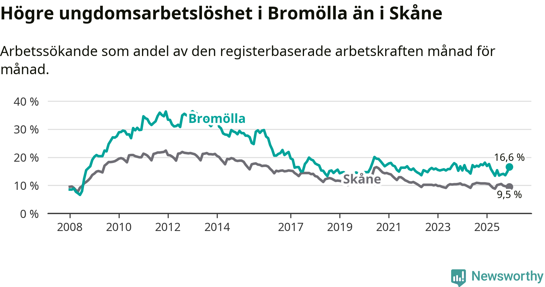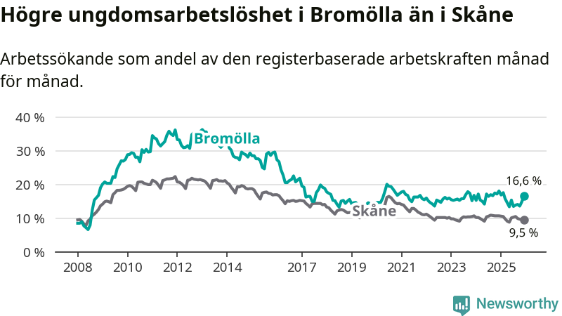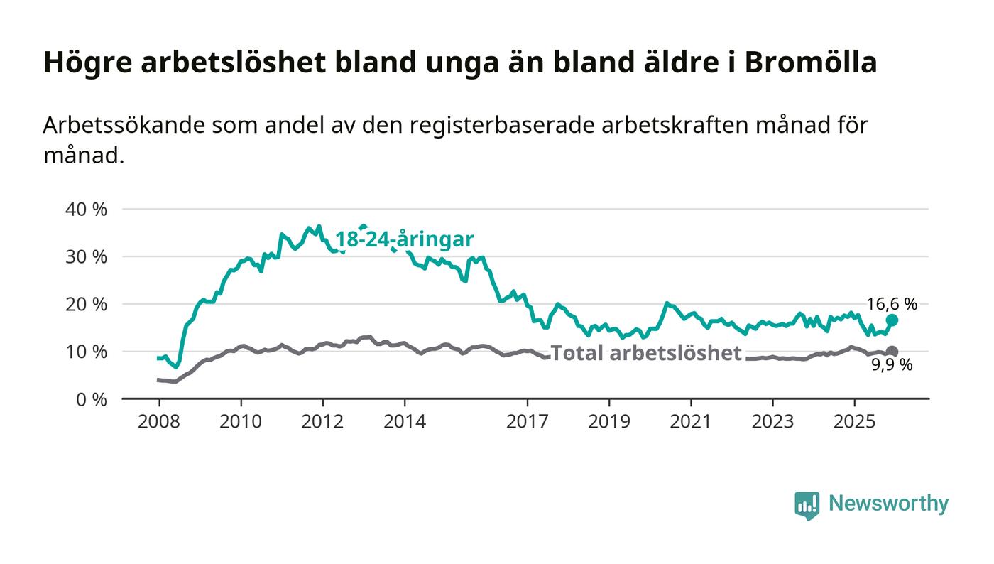 Precis som den totala arbetslösheten ligger ungdomsarbetslösheten i Bromölla högre än i Skåne som helhet. Skillnaden mellan kommunen och länet är 7,1 procentenheter.