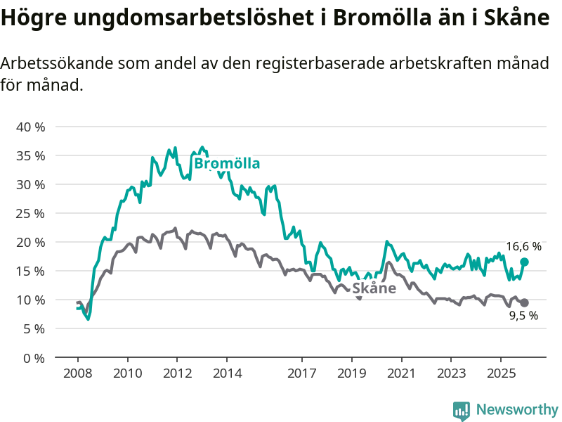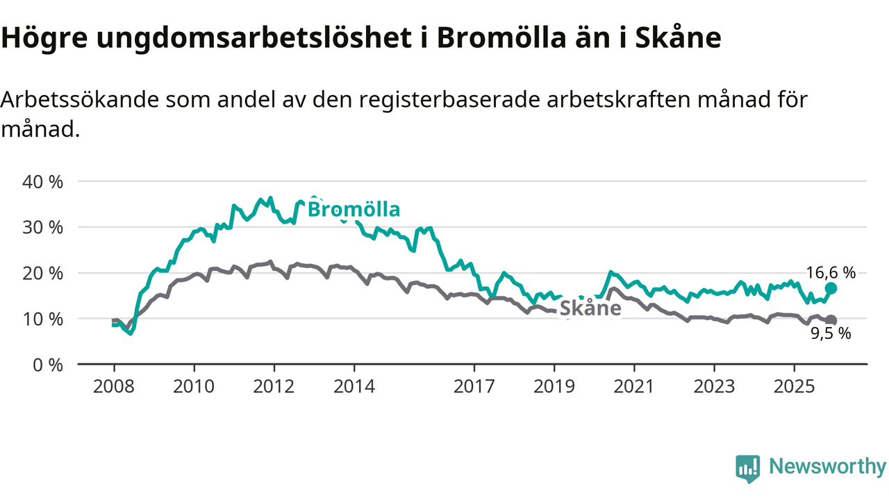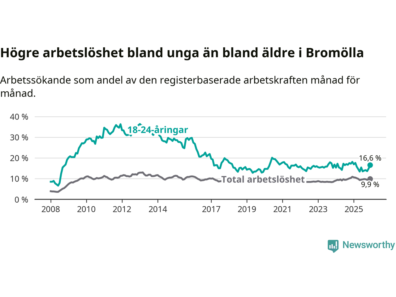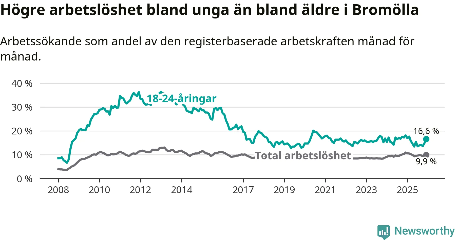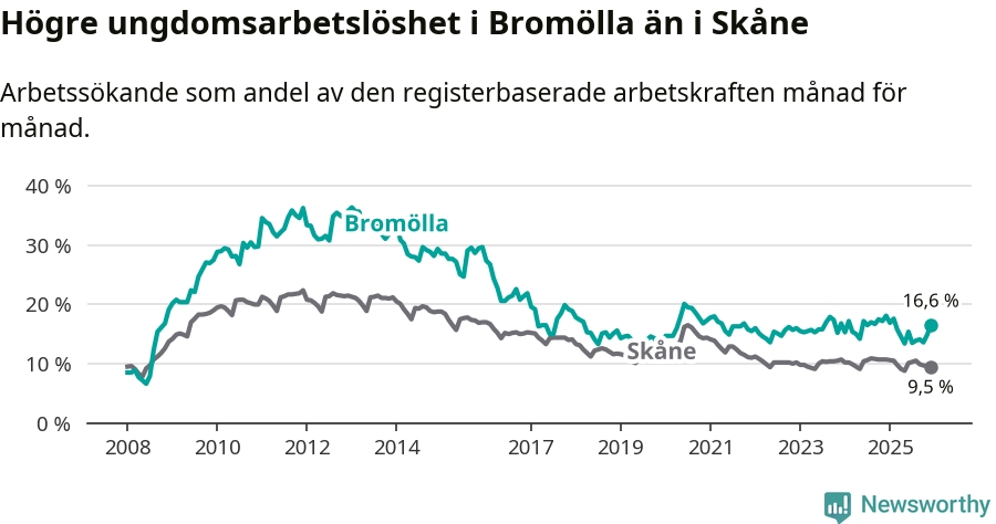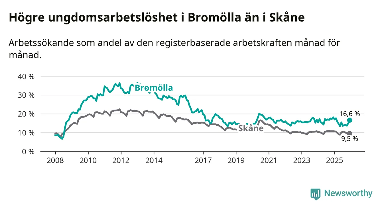 Precis som den totala arbetslösheten ligger ungdomsarbetslösheten i Bromölla högre än i Skåne som helhet. Skillnaden mellan kommunen och länet är 7,1 procentenheter.