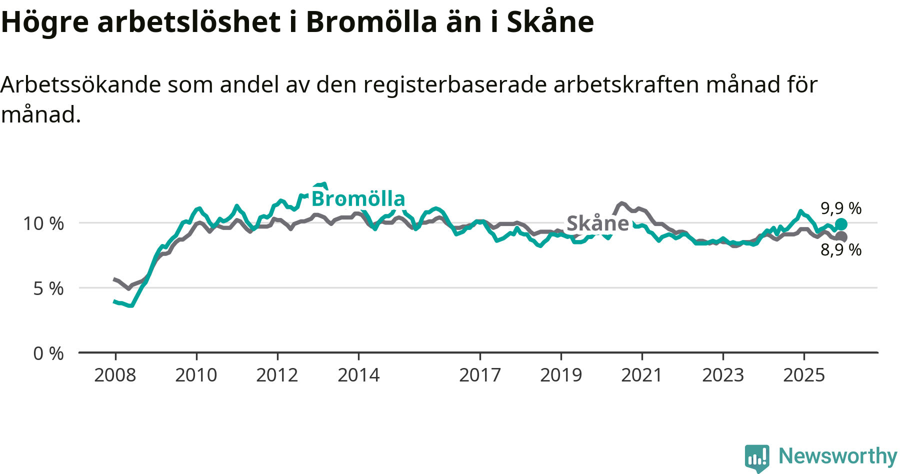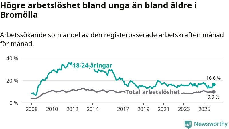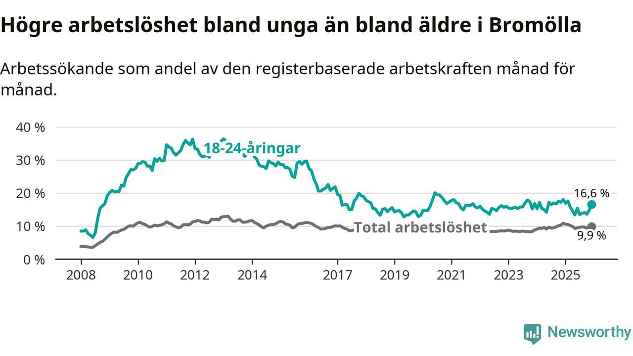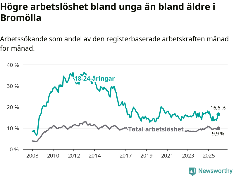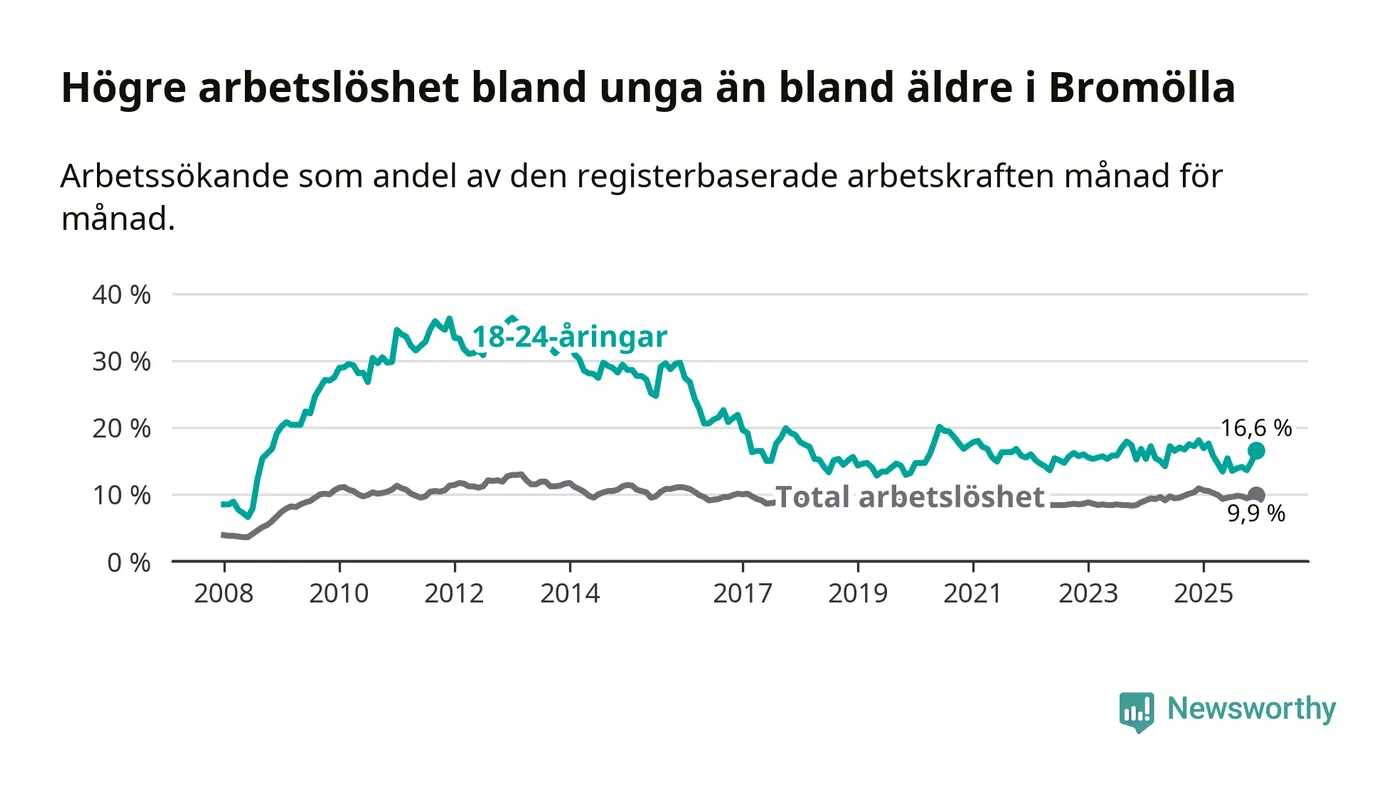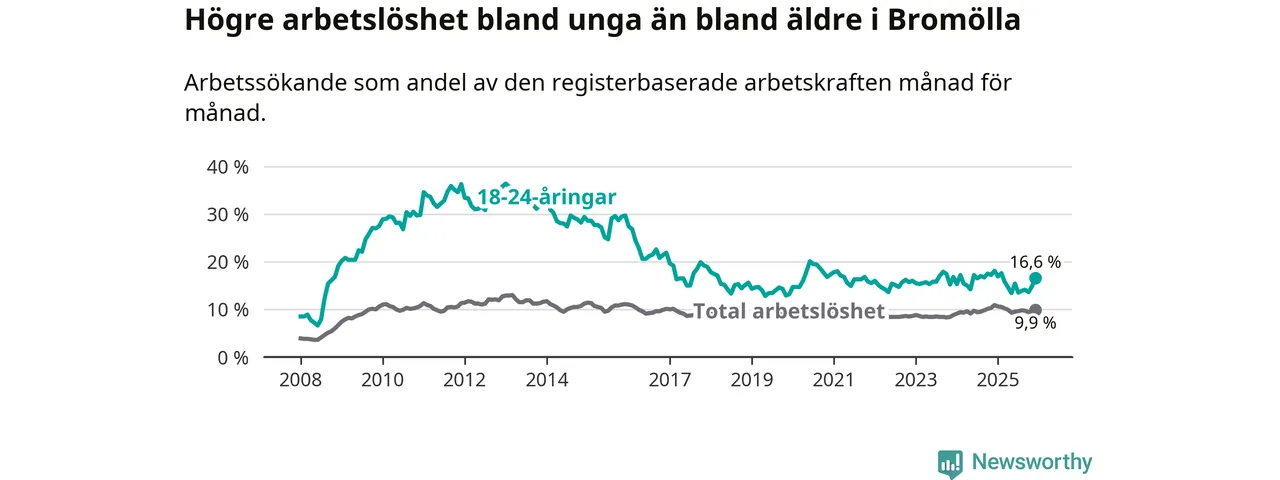 Precis som den totala arbetslösheten ligger ungdomsarbetslösheten i Bromölla högre än i Skåne som helhet. Skillnaden mellan kommunen och länet är 7,1 procentenheter.