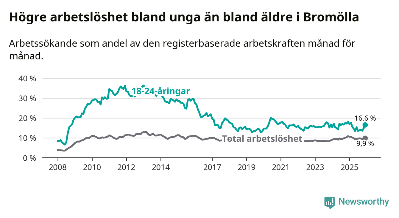 I och med den senaste månadens nedgång har de ungas arbetslöshet i Bromölla sjunkit nio månader i följd (ner från 15,8 procent i mars 2025 till 16,6 procent nu).