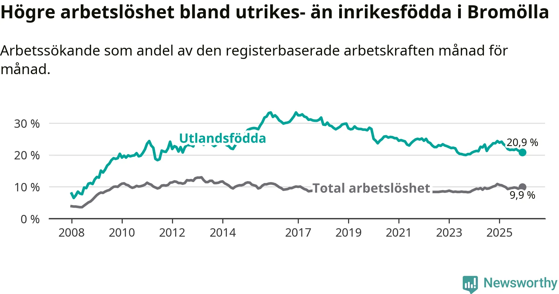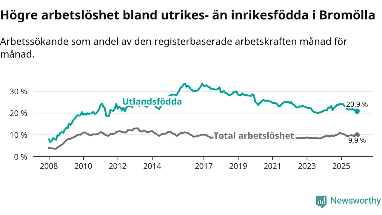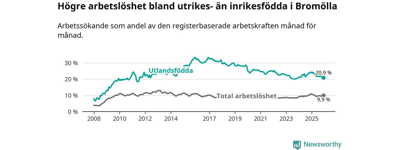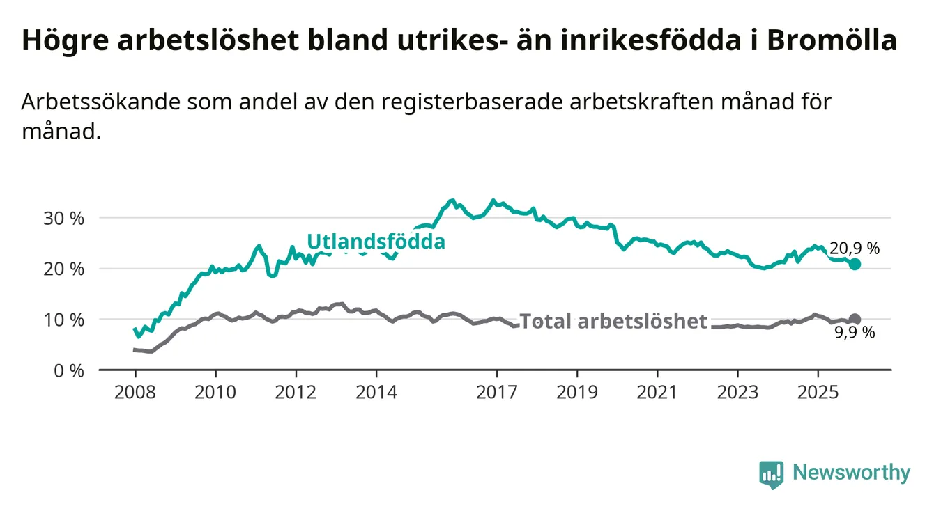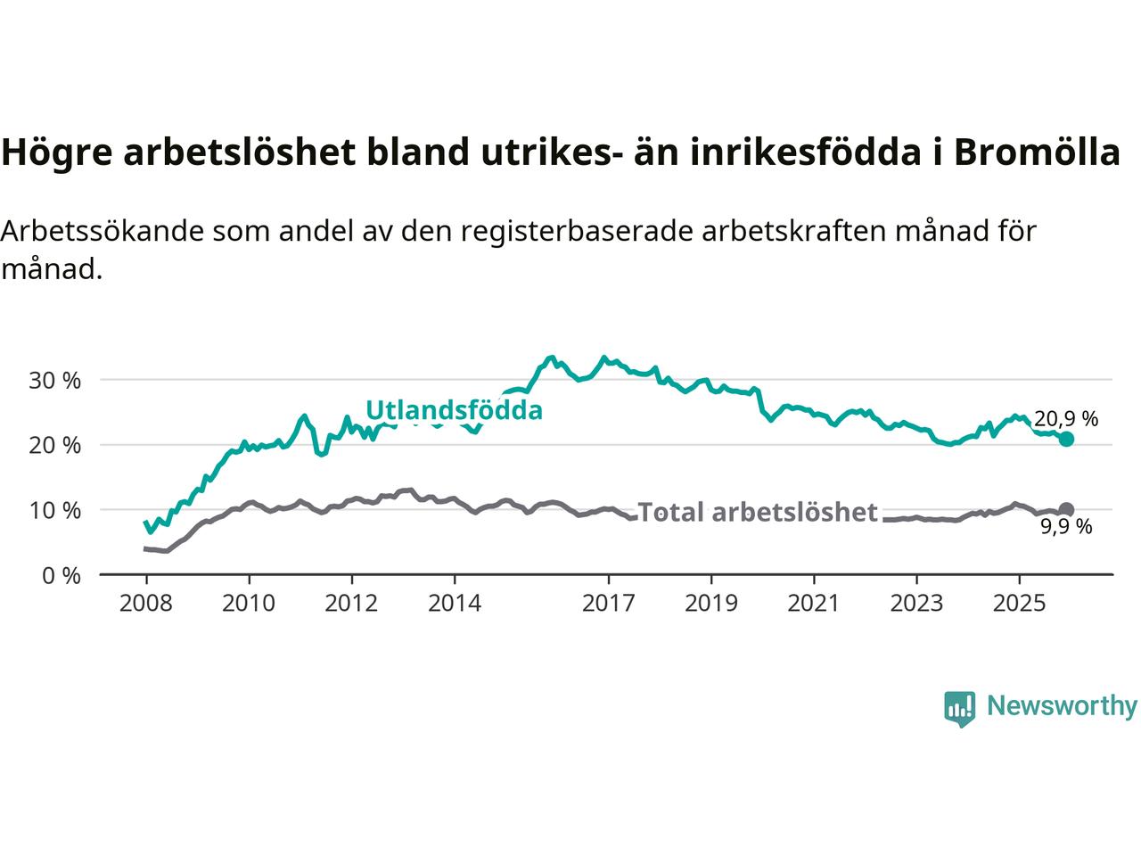 Skillnaden i arbetslöshet mellan utrikesfödda och hela befolkningen är 11,0 procentenheter i Bromölla. Det är en betydligt mindre skillnad än för ett år sedan (−2,5 procentenheter).