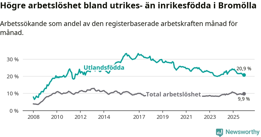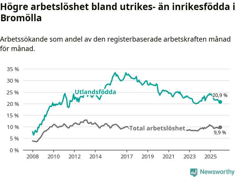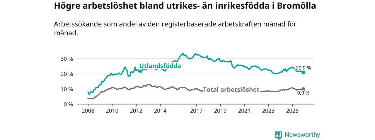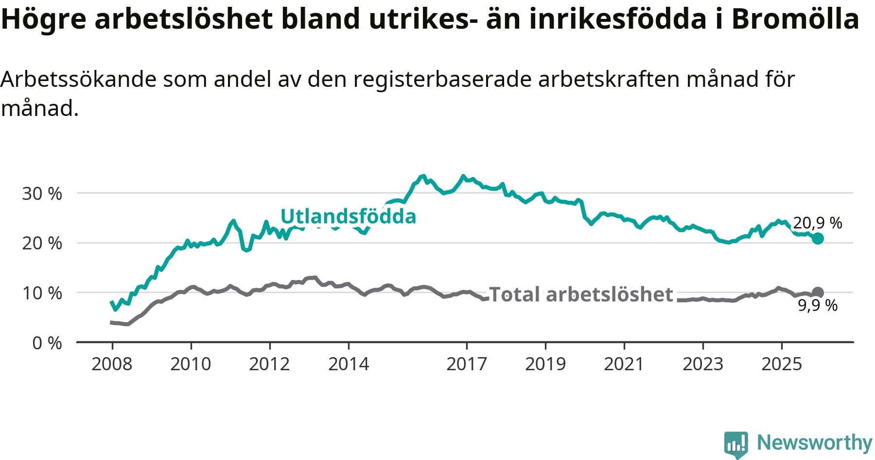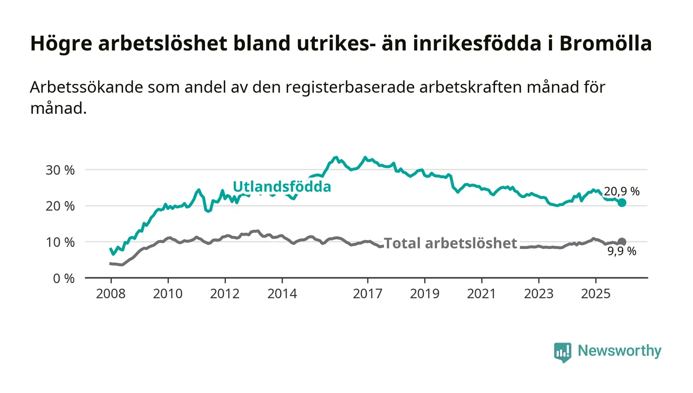 Skillnaden i arbetslöshet mellan utrikesfödda och hela befolkningen är 11,0 procentenheter i Bromölla. Det är en betydligt mindre skillnad än för ett år sedan (−2,5 procentenheter).