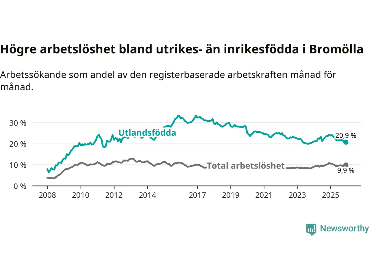 Arbetslösheten bland utlandsfödda var 20,9 procent i Bromölla under december månad, motsvarande 257 av 1 230 personer. Det är 3,5 procentenheter färre än vid samma tidpunkt i fjol (−38 om man räknar personer).