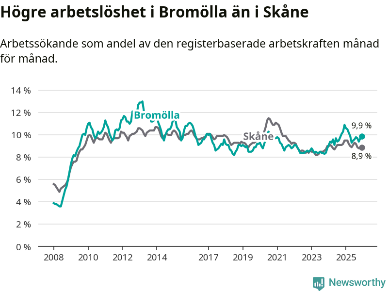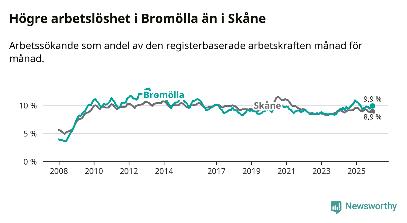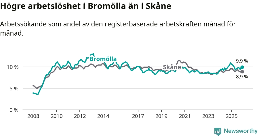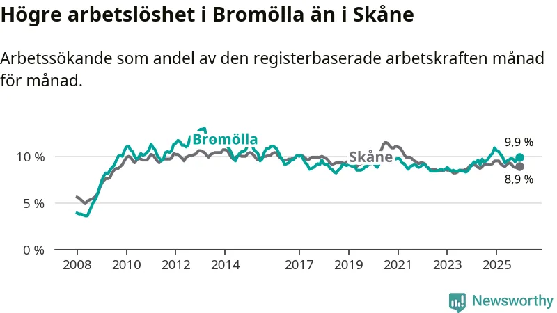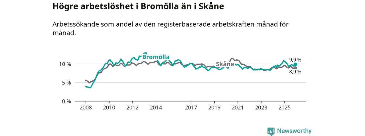 Under december månad rapporterade Bromölla kommun en total arbetslöshet på 9,9 procent. Det är en minskning jämfört med samma tidpunkt i fjol (−1,0 procentenheter). Även i Skåne län sjunker arbetslösheten .