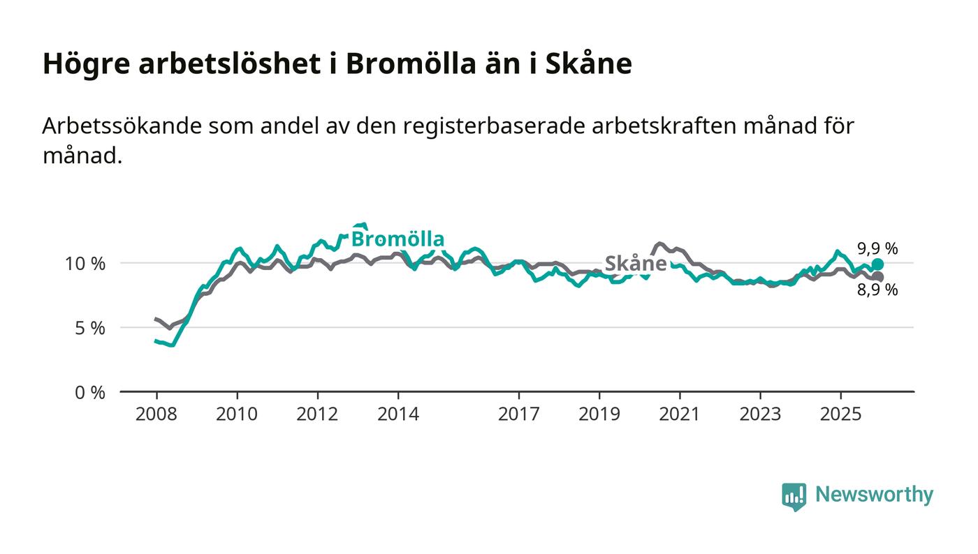 Även om arbetslösheten i Bromölla alltså minskar, så ligger den fortfarande över snittet i hela Skåne län (9,9 procent i kommunen, jämfört med 8,9 procent i hela länet). Lomma har den lägsta arbetslösheten i länet (4,0 procent), medan Perstorp har den högsta (13,3 procent). För att Bromölla skulle komma ner i samma arbetslöshetsnivå som Lomma skulle 348 personer behöva sysselsättas.