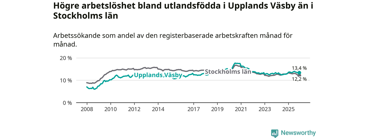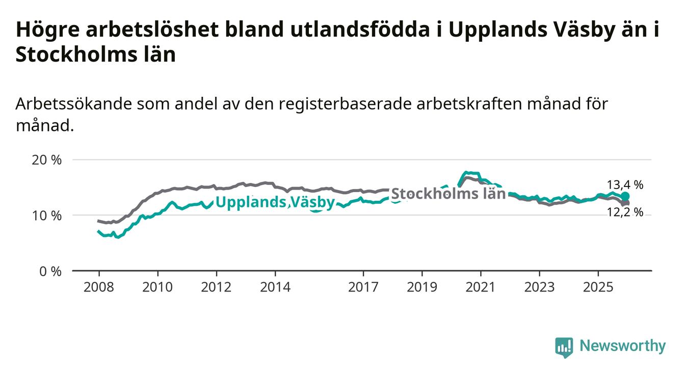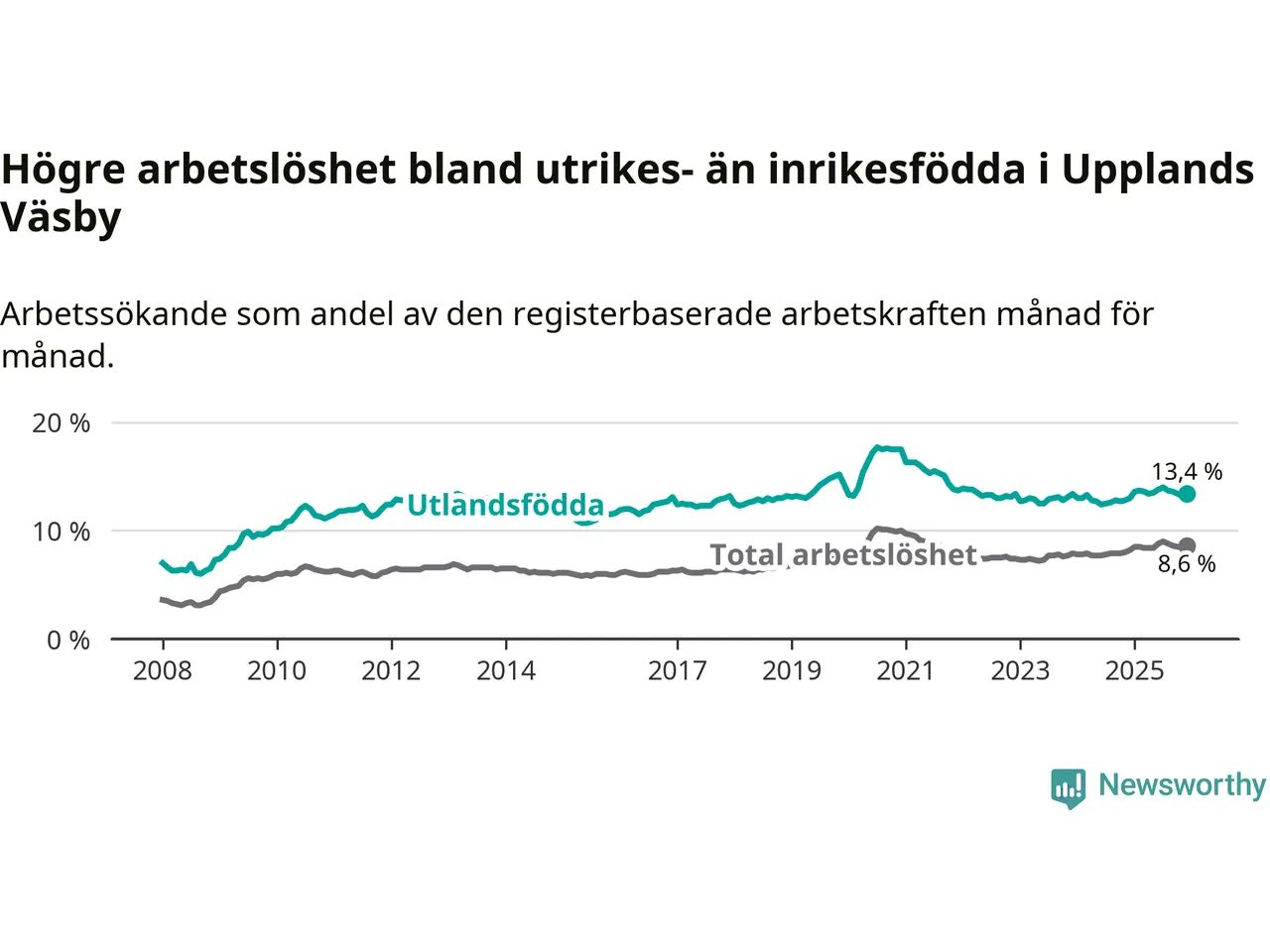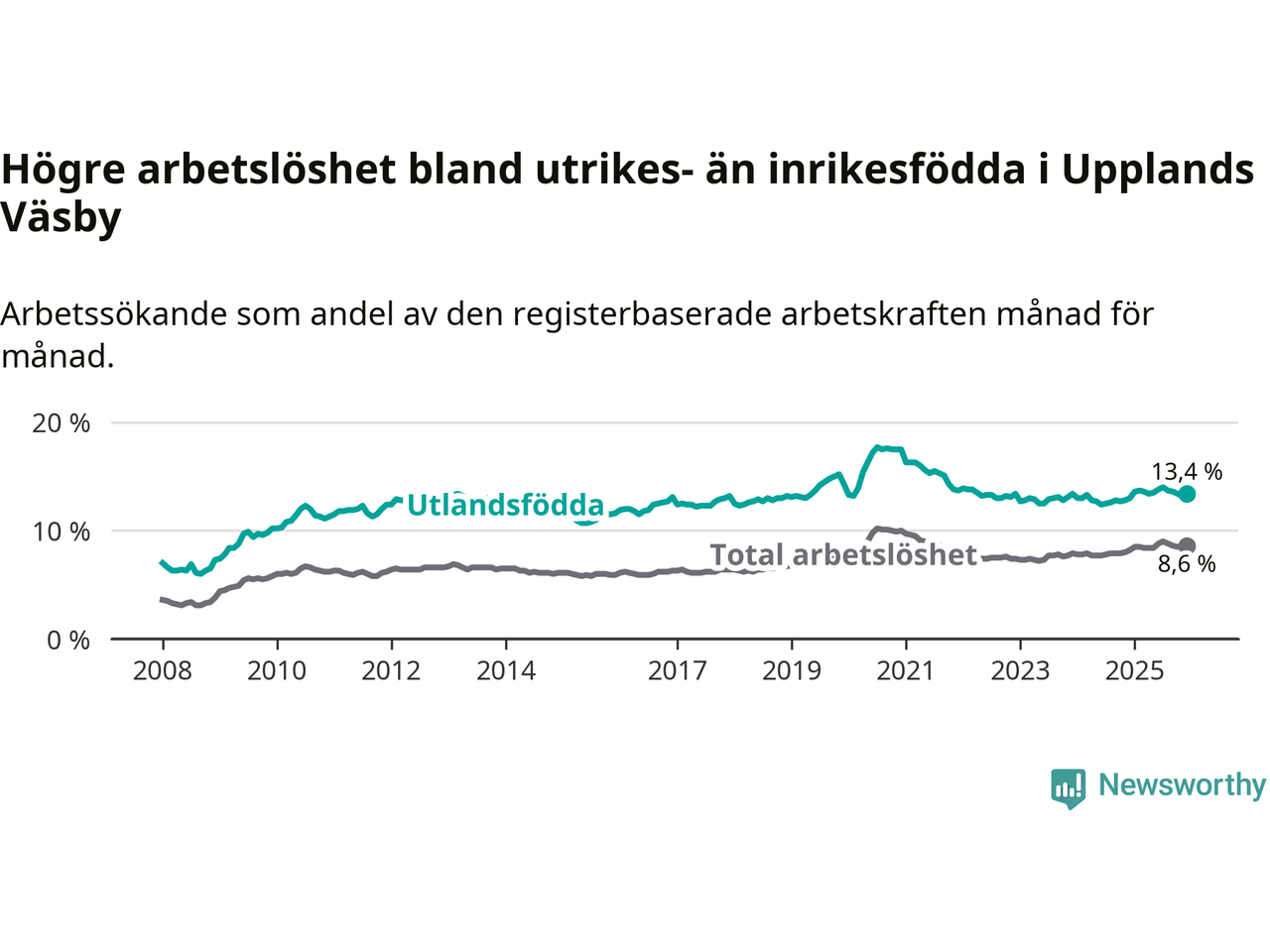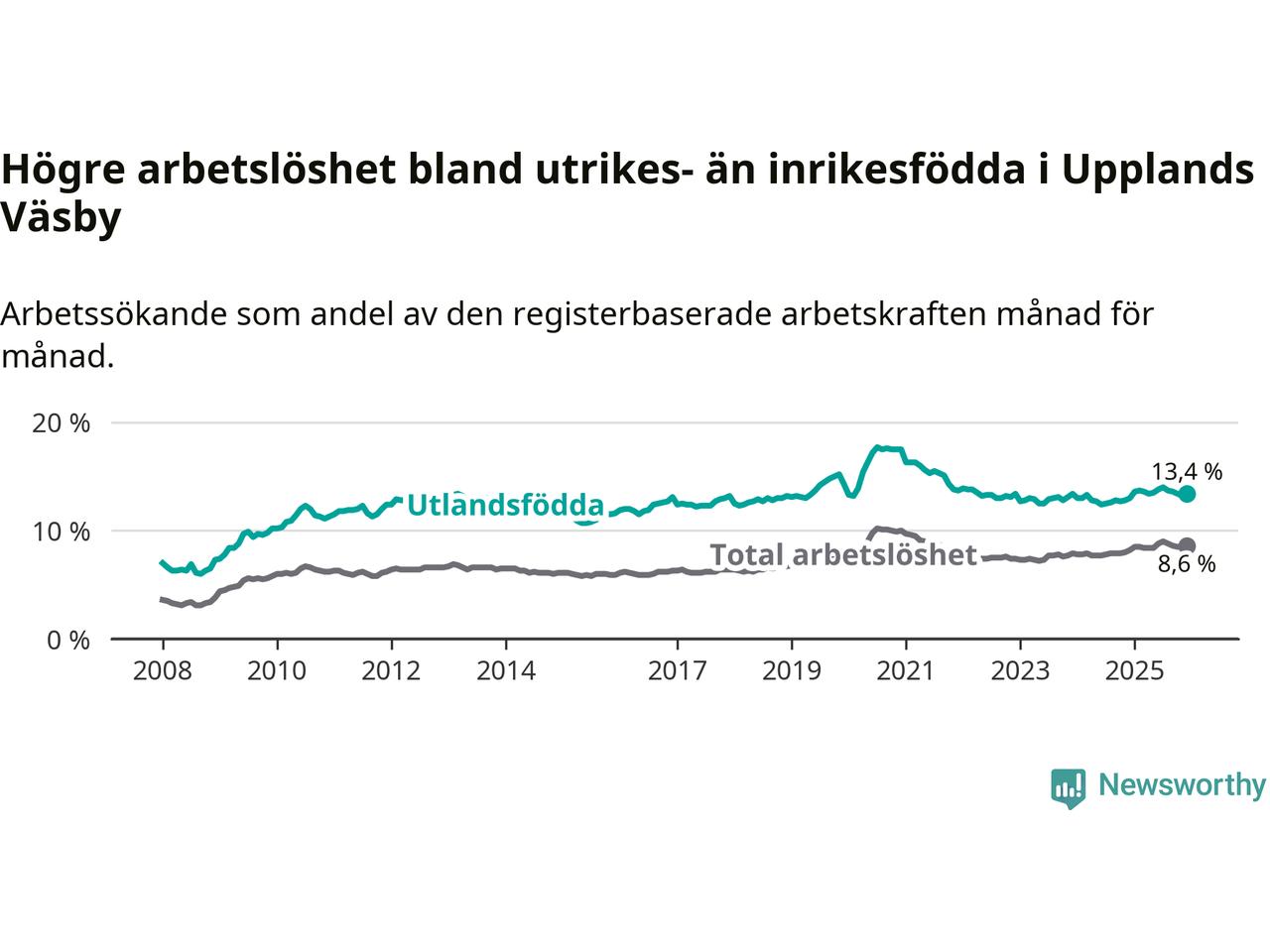 Arbetslösheten bland utlandsfödda var 13,4 procent i Upplands Väsby under december månad, motsvarande 1 533 av 11 440 personer. Det är 0,4 procentenheter fler än vid samma tidpunkt i fjol (+78 om man räknar personer). Därmed är de utlandsföddas arbetslöshet högre än vid samma tidpunkt i fjol för tolfte månaden i följd.
