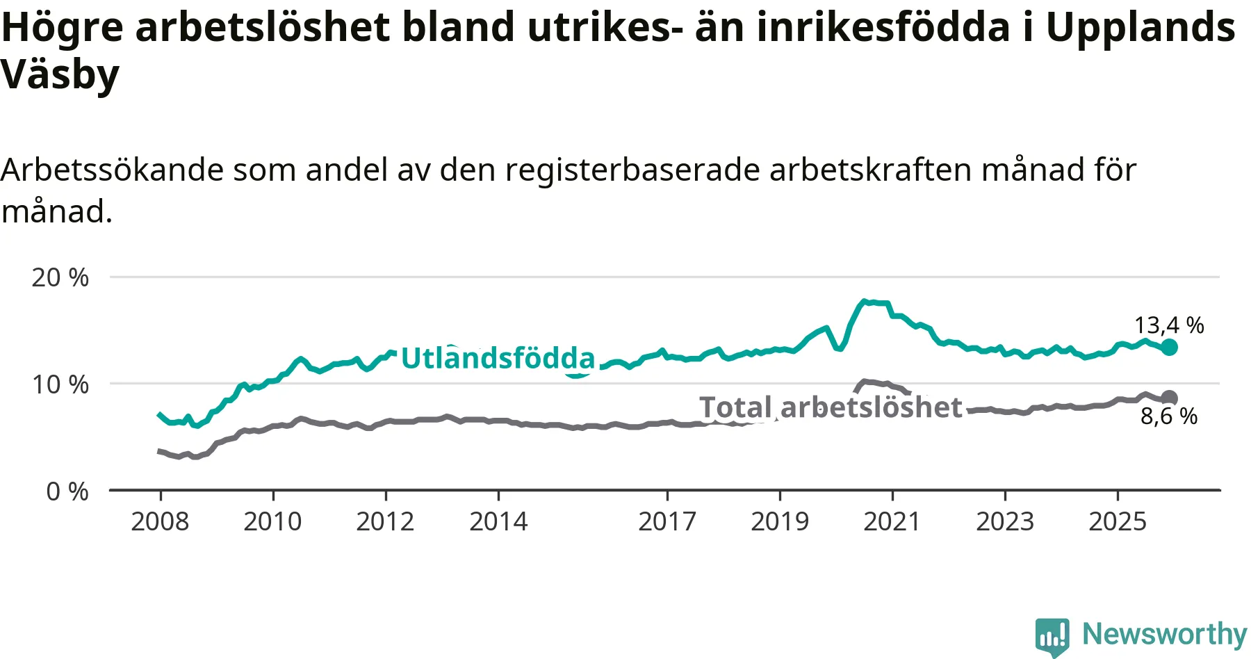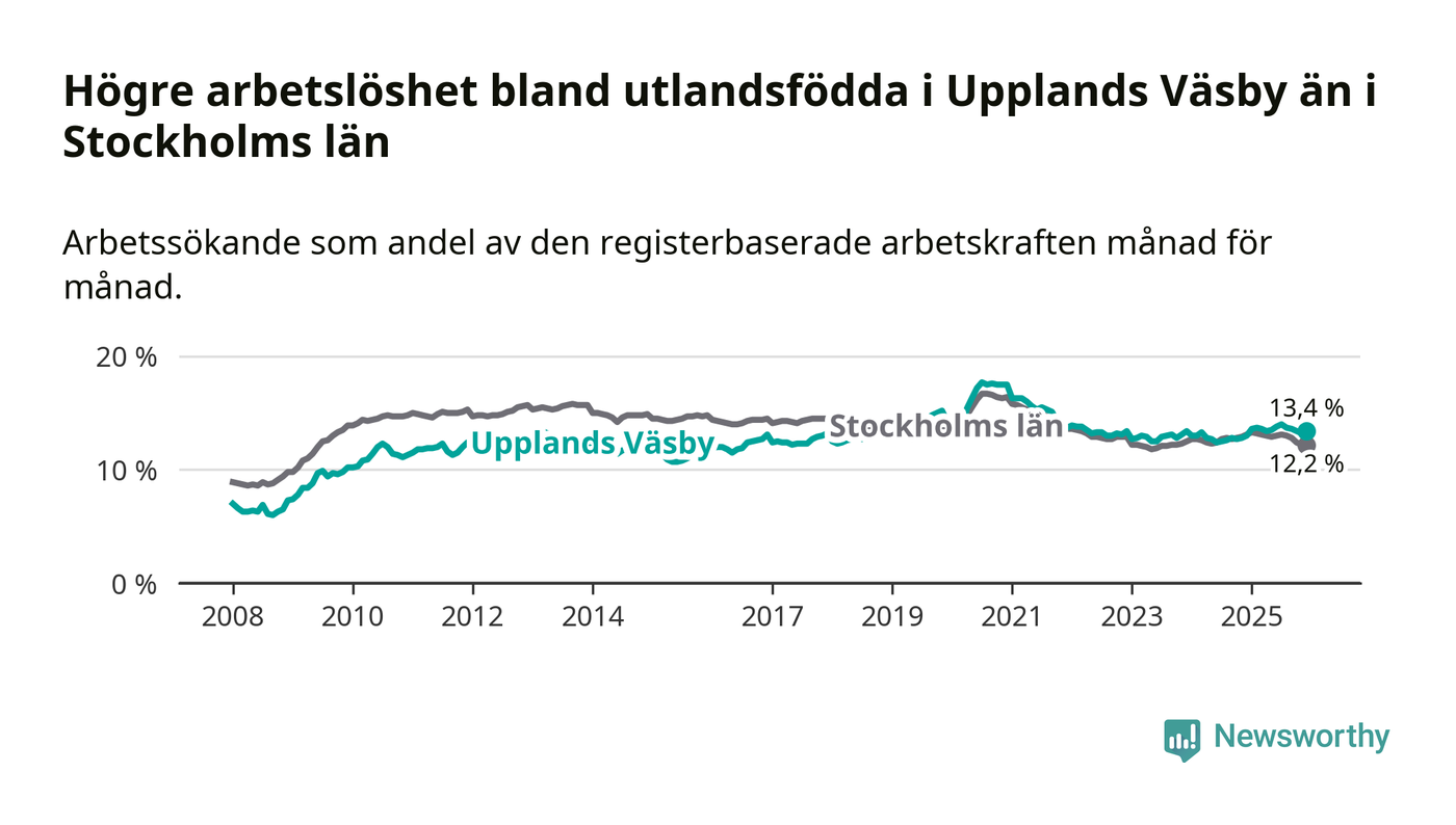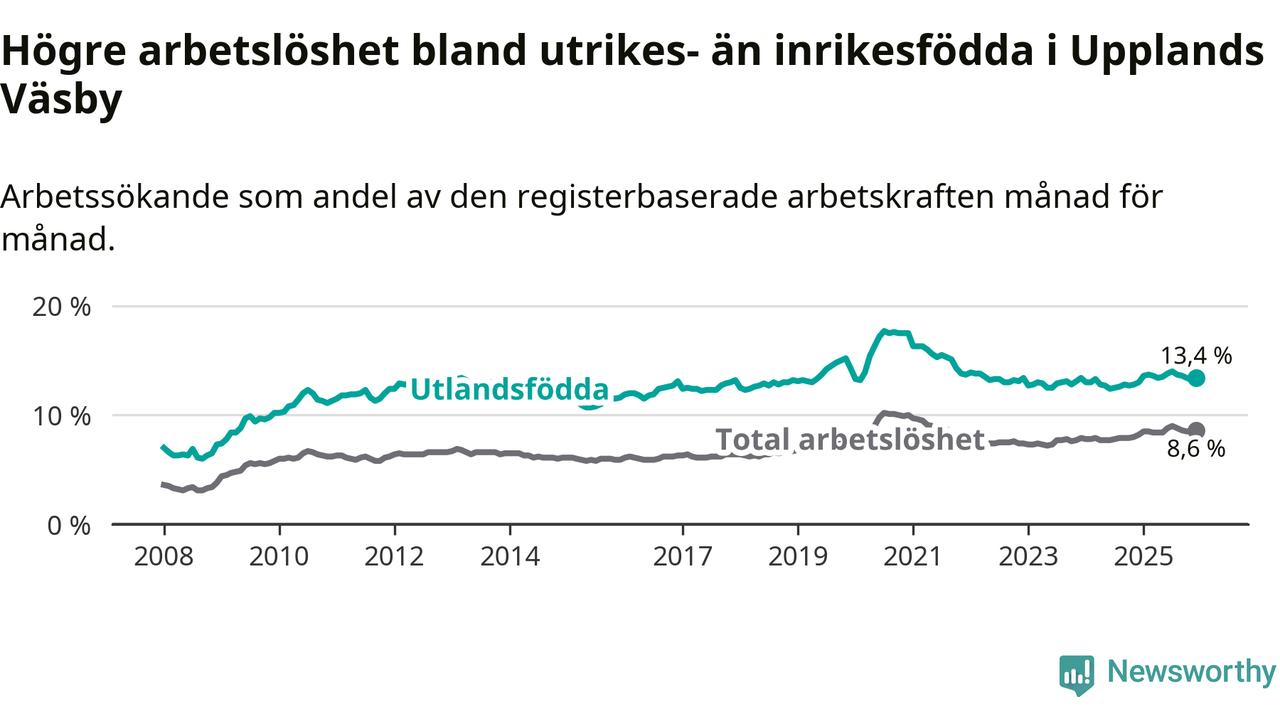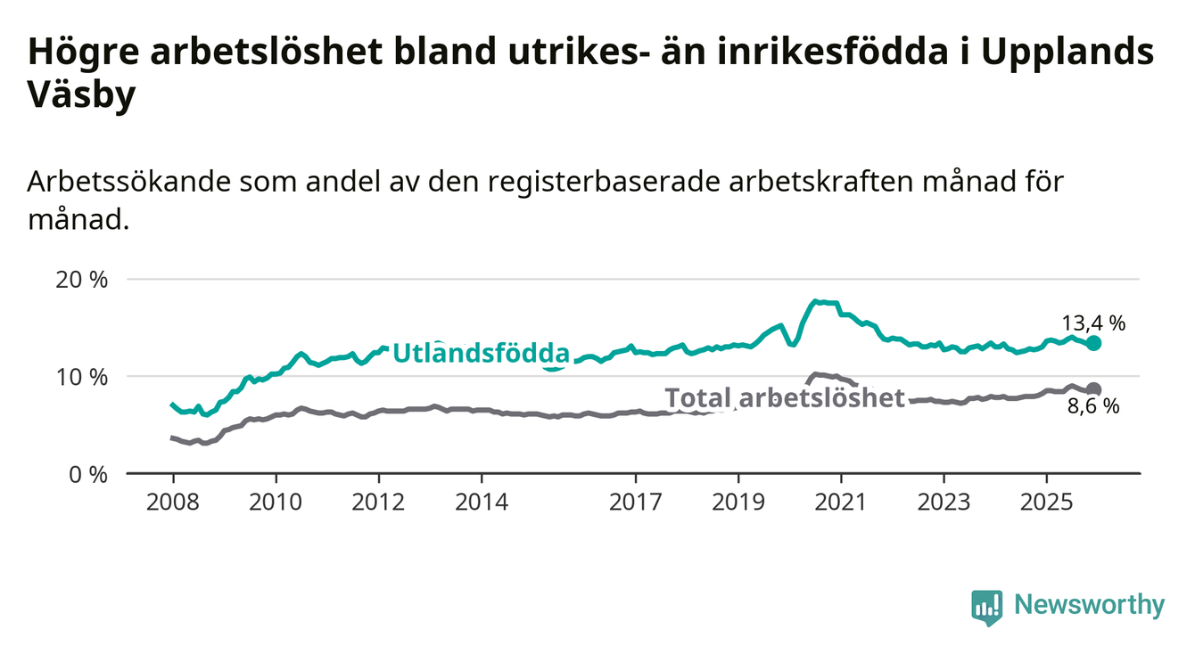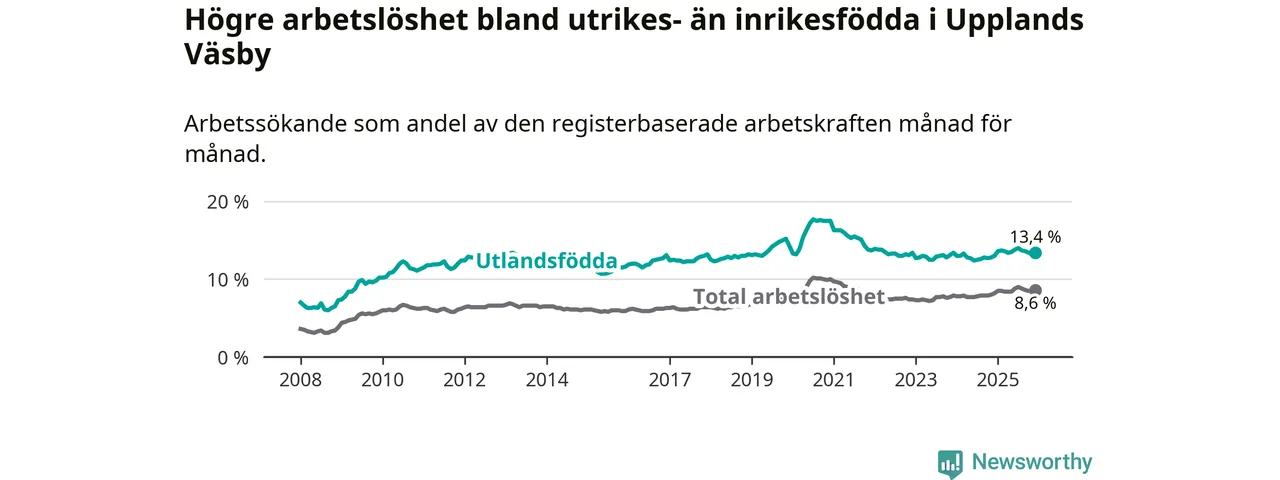 Arbetslösheten bland utlandsfödda var 13,4 procent i Upplands Väsby under december månad, motsvarande 1 533 av 11 440 personer. Det är 0,4 procentenheter fler än vid samma tidpunkt i fjol (+78 om man räknar personer). Därmed är de utlandsföddas arbetslöshet högre än vid samma tidpunkt i fjol för tolfte månaden i följd.