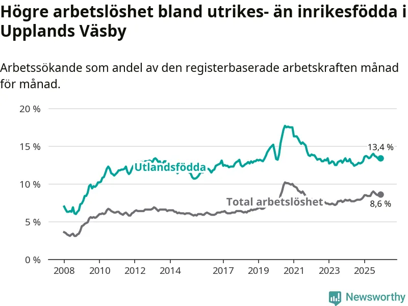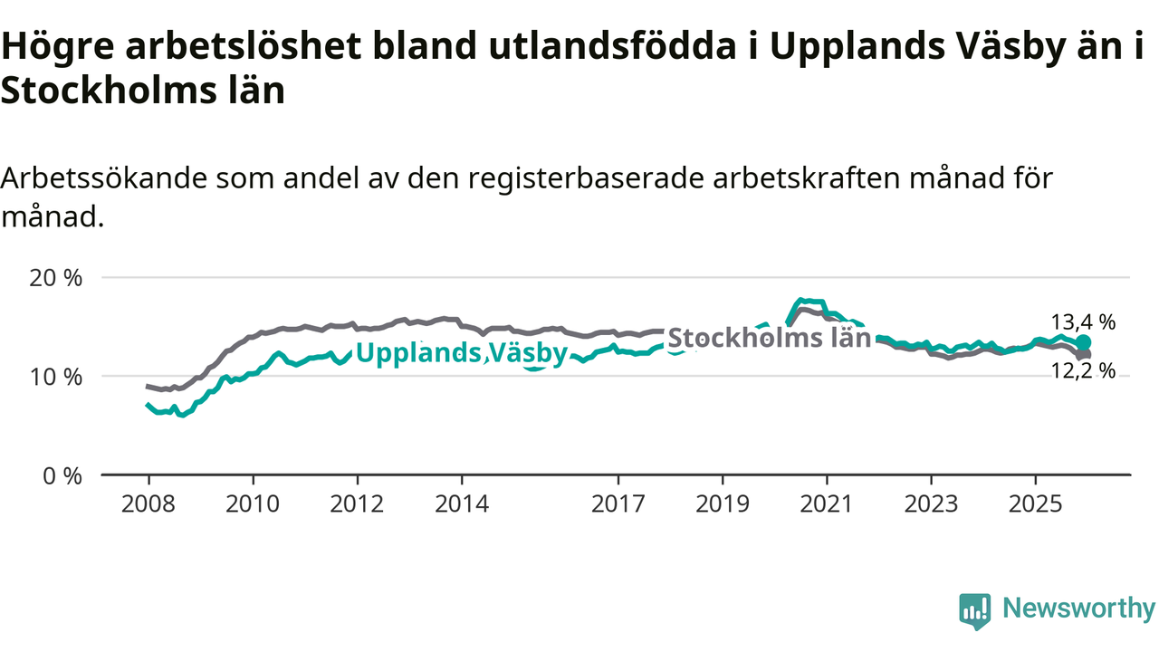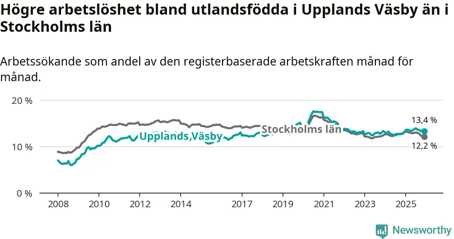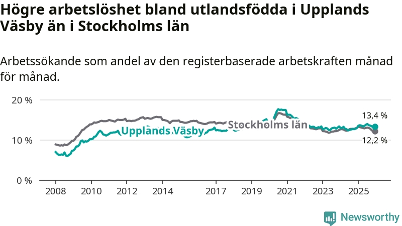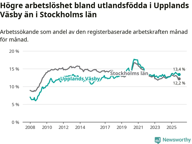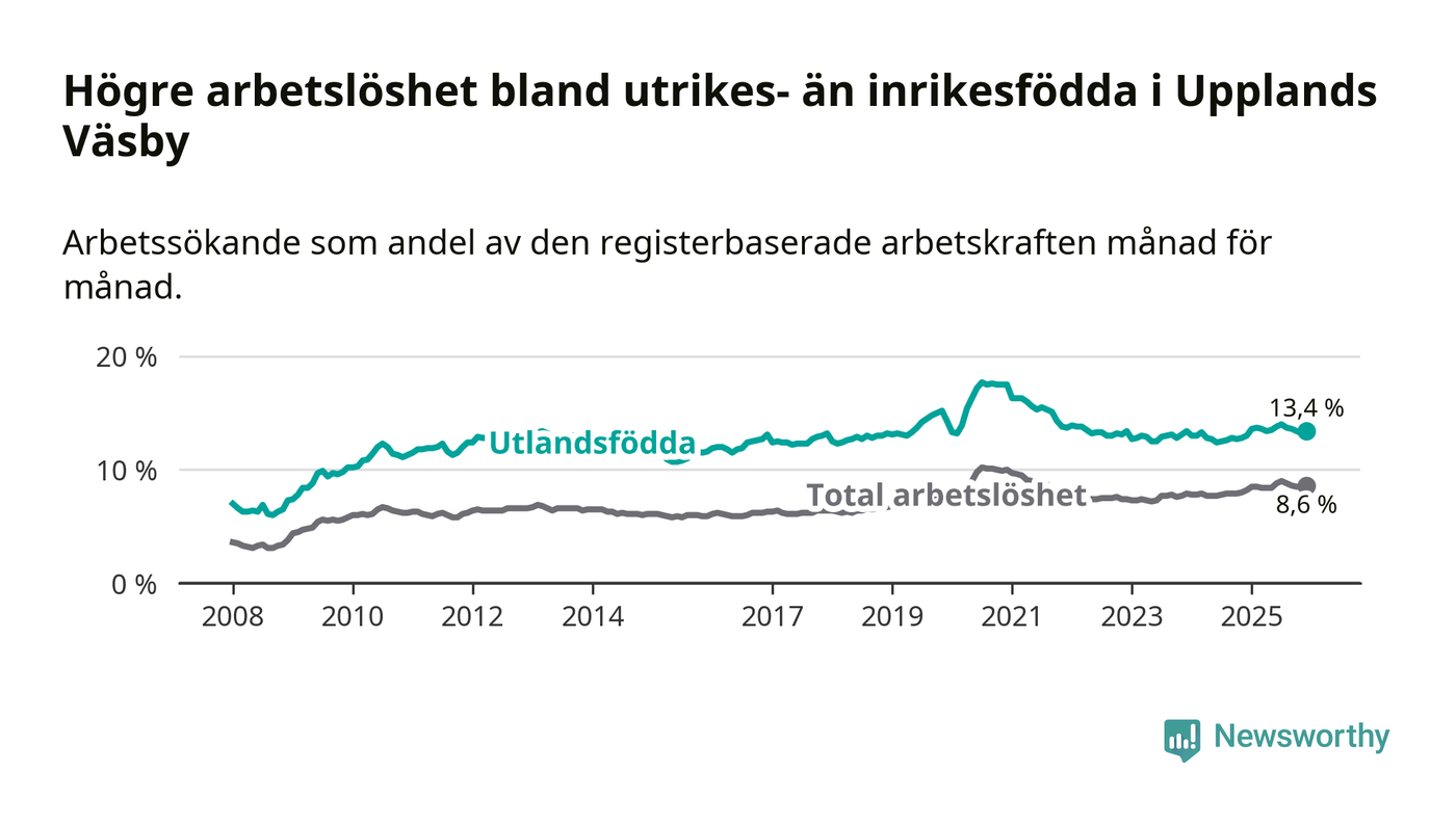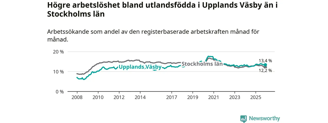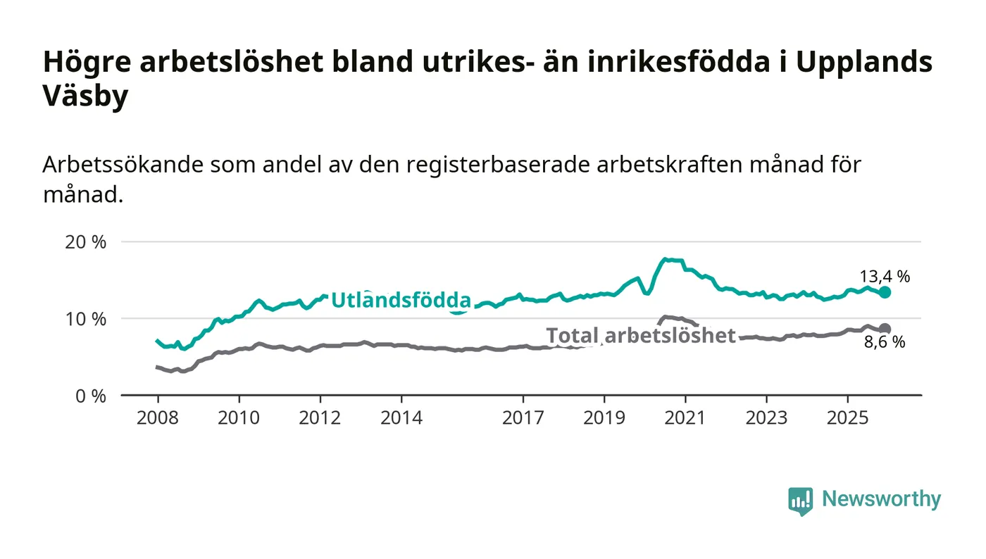 Arbetslösheten bland utlandsfödda var 13,4 procent i Upplands Väsby under december månad, motsvarande 1 533 av 11 440 personer. Det är 0,4 procentenheter fler än vid samma tidpunkt i fjol (+78 om man räknar personer). Därmed är de utlandsföddas arbetslöshet högre än vid samma tidpunkt i fjol för tolfte månaden i följd.