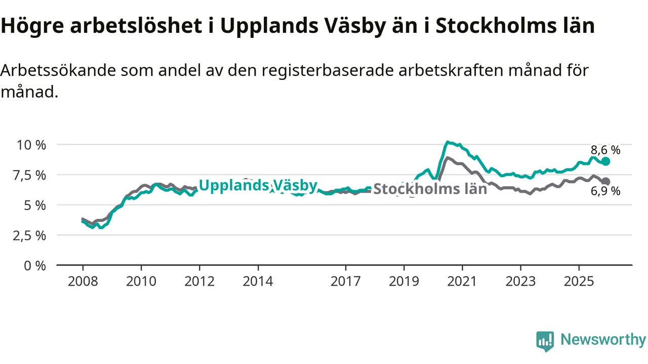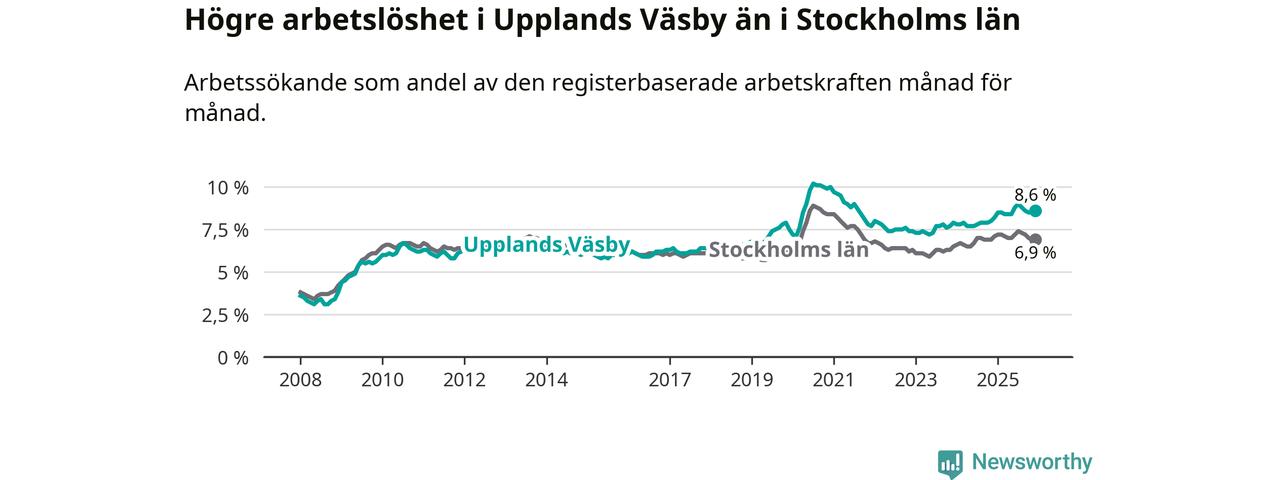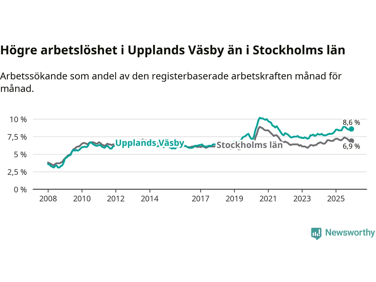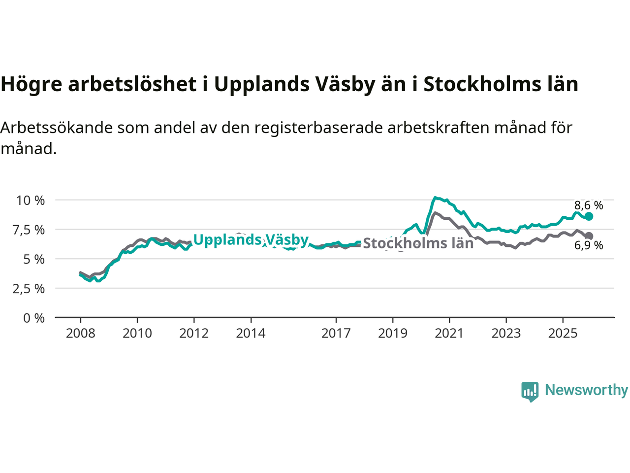 Upplands Väsby hade redan tidigare högre arbetslöshet än snittet i hela Stockholms län och nu växer klyftan (8,6 procent i kommunen, jämfört med 6,9 procent i hela länet). Ekerö har den lägsta arbetslösheten i länet (3,8 procent), medan Södertälje har den högsta (11,0 procent). För att Upplands Väsby skulle komma ner i samma arbetslöshetsnivå som Ekerö skulle 1 254 personer behöva sysselsättas.
