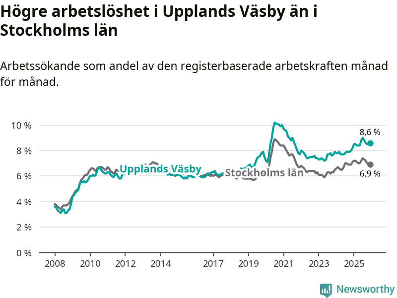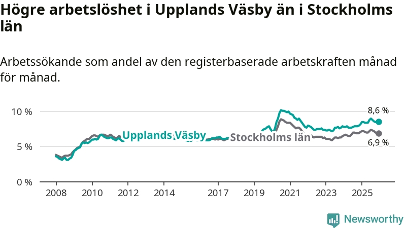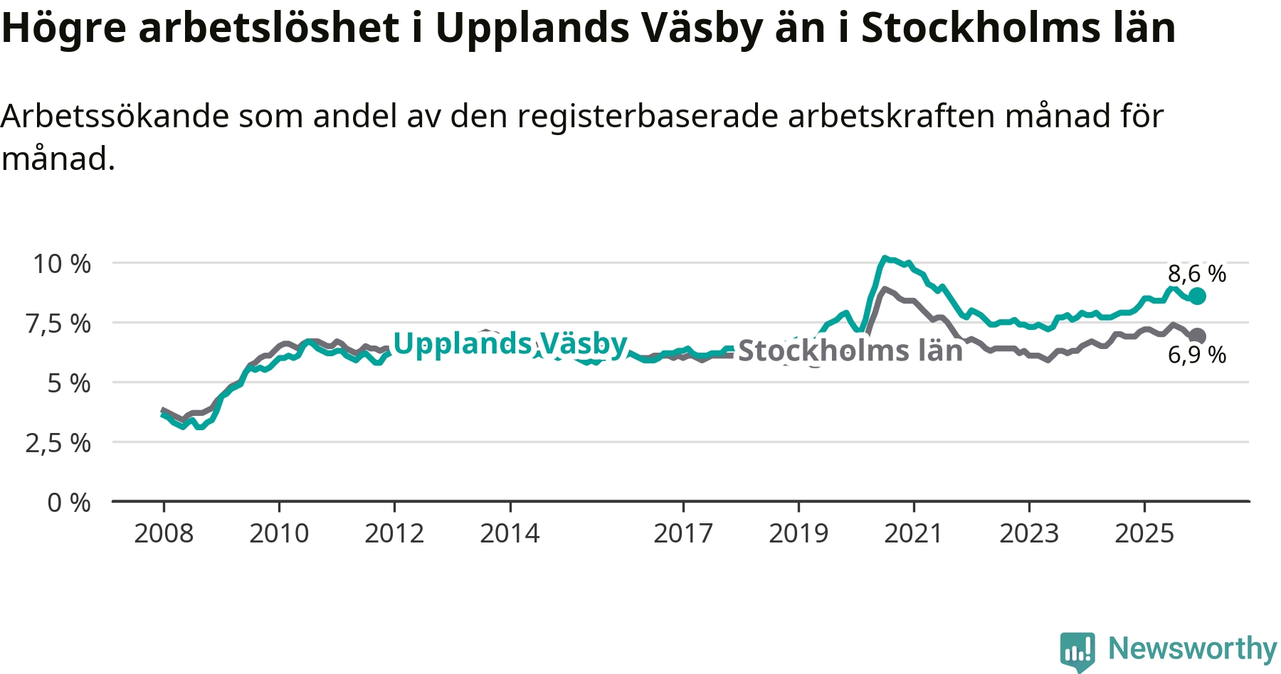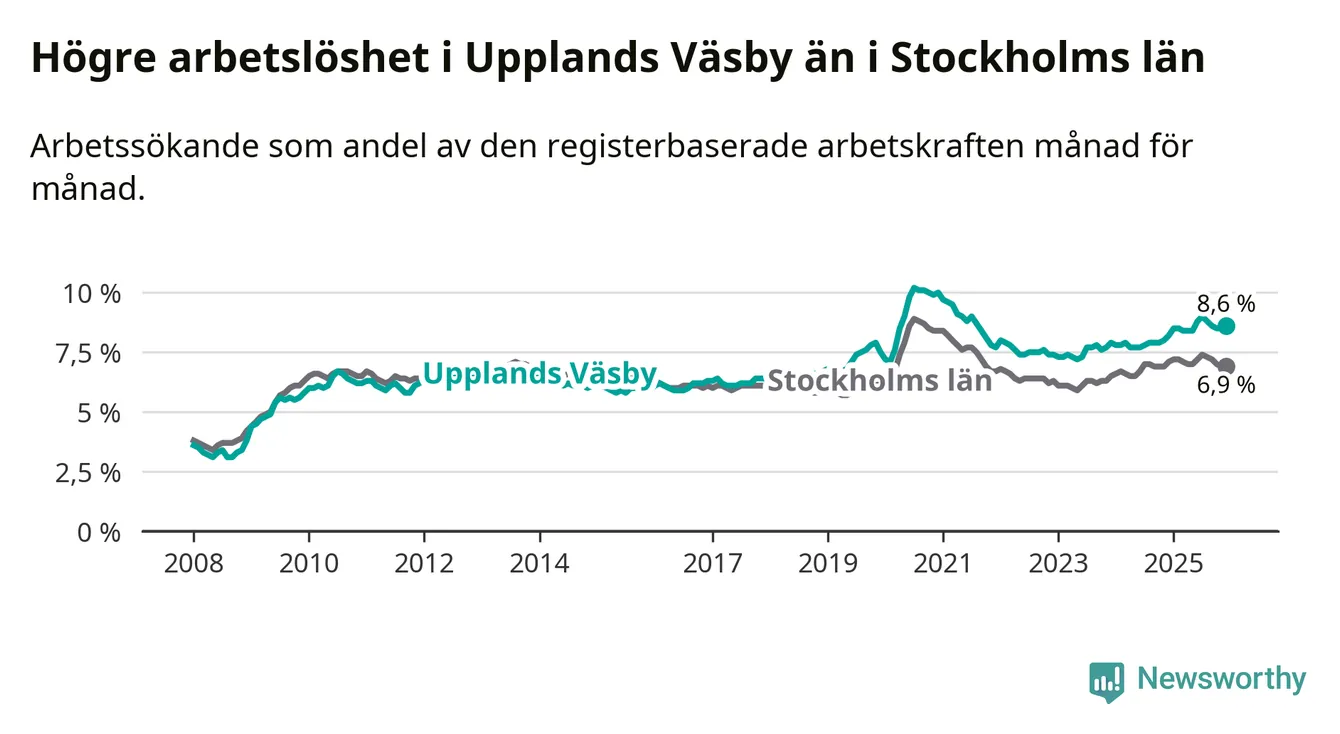 Upplands Väsby hade redan tidigare högre arbetslöshet än snittet i hela Stockholms län och nu växer klyftan (8,6 procent i kommunen, jämfört med 6,9 procent i hela länet). Ekerö har den lägsta arbetslösheten i länet (3,8 procent), medan Södertälje har den högsta (11,0 procent). För att Upplands Väsby skulle komma ner i samma arbetslöshetsnivå som Ekerö skulle 1 254 personer behöva sysselsättas.