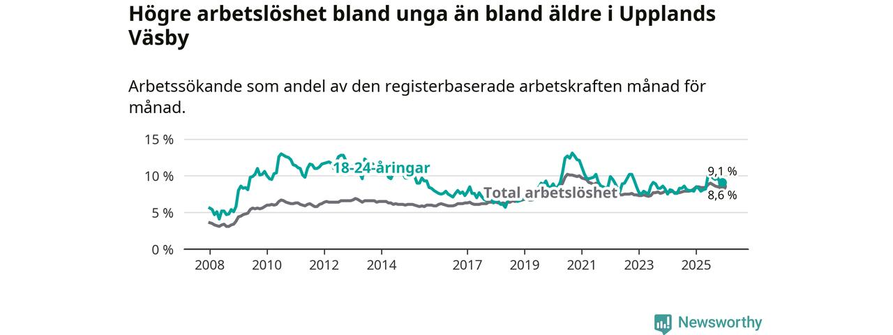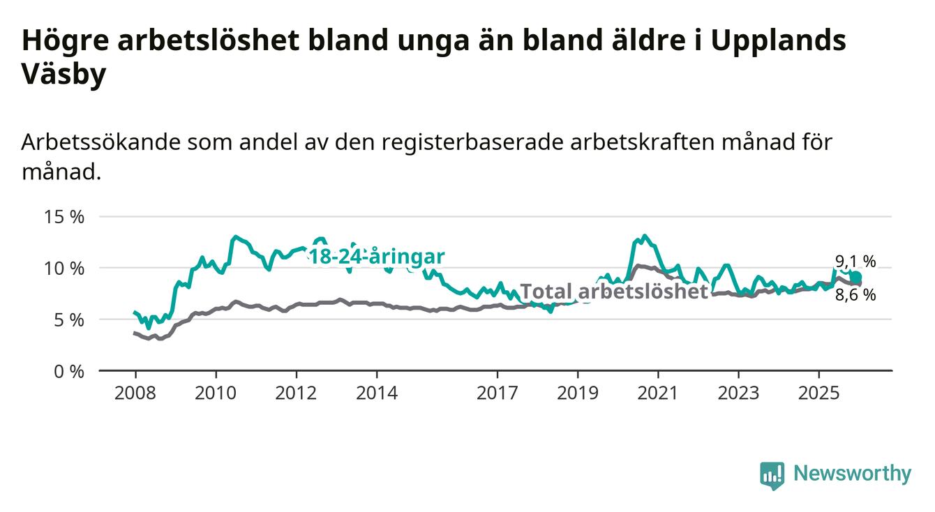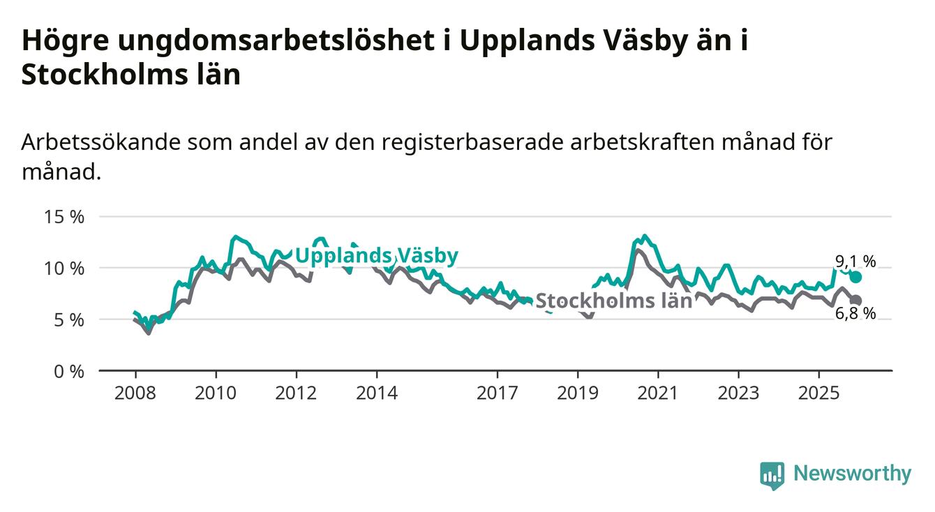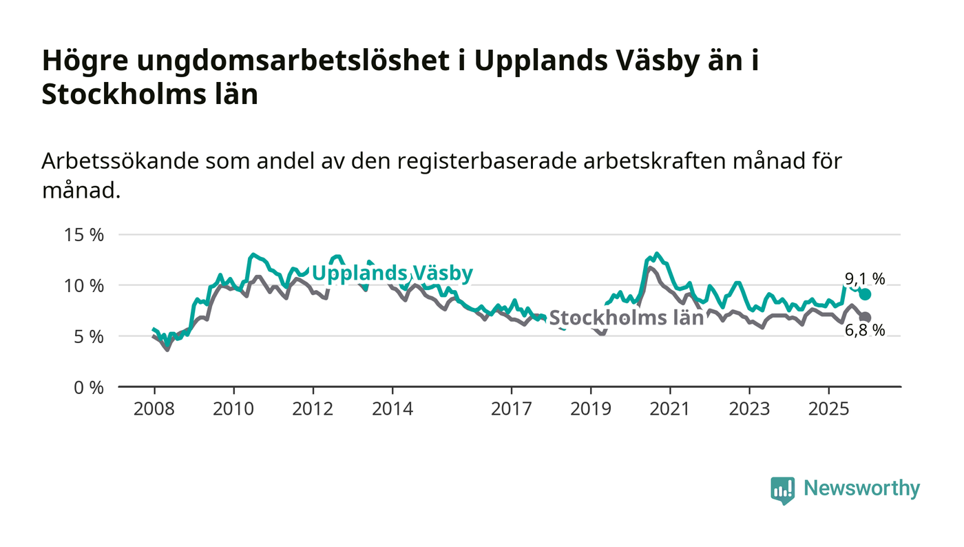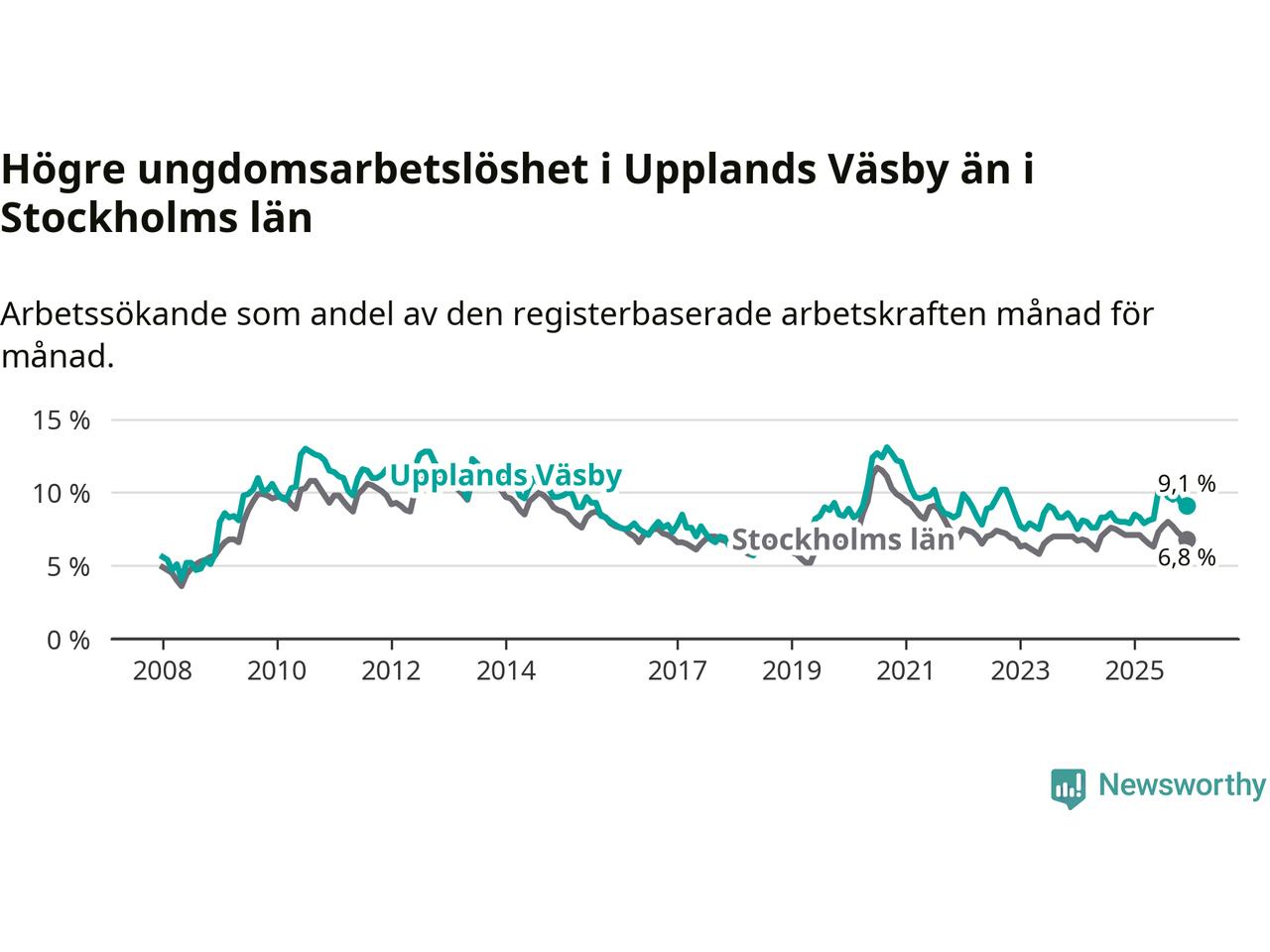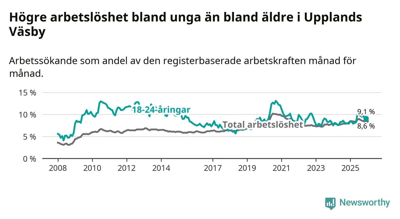 I och med den senaste månadens uppgång har de ungas arbetslöshet i Upplands Väsby stigit nio månader i följd (upp från 7,9 procent i mars 2025 till 9,1 procent nu).