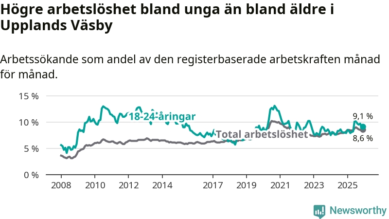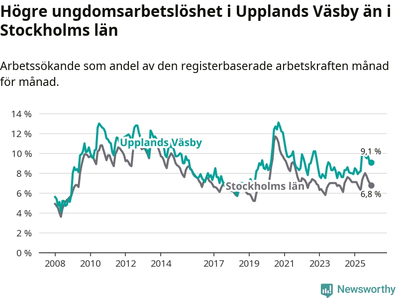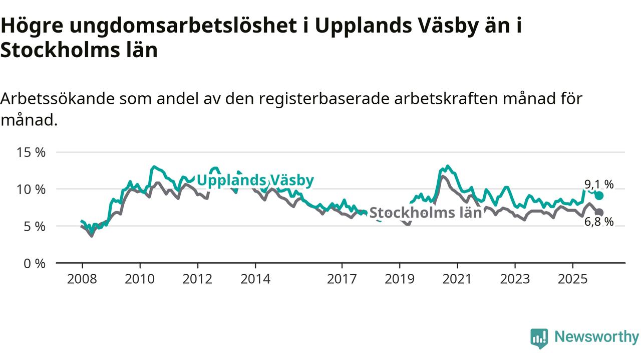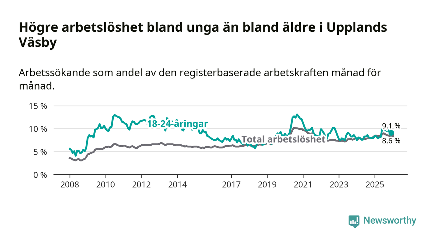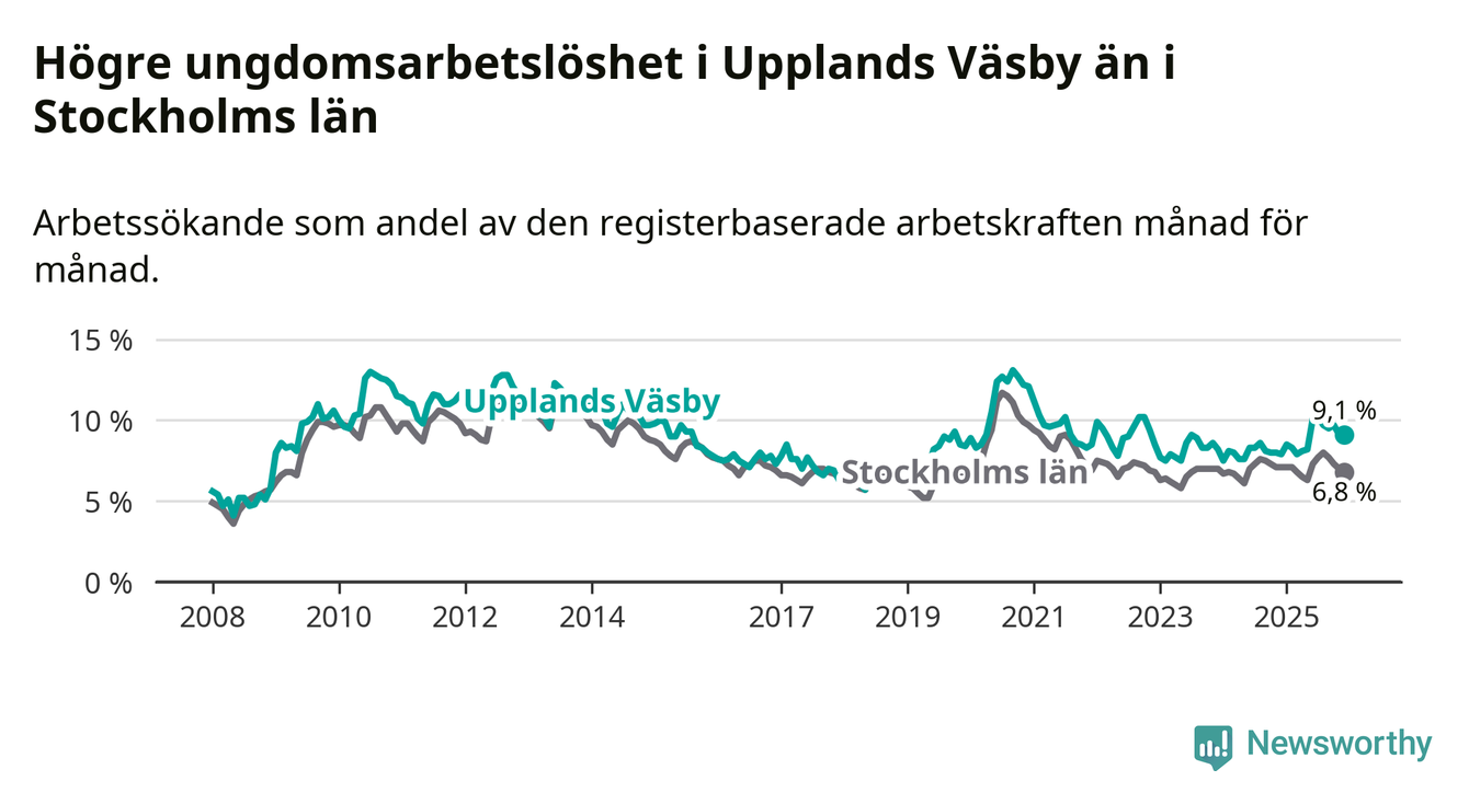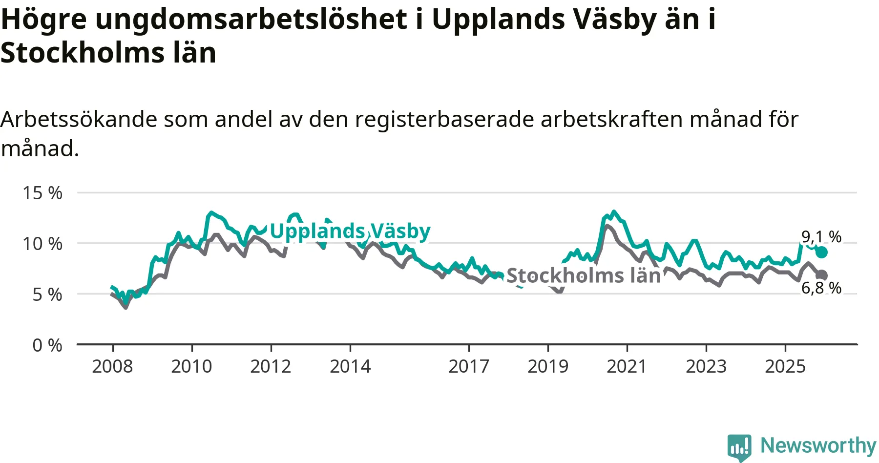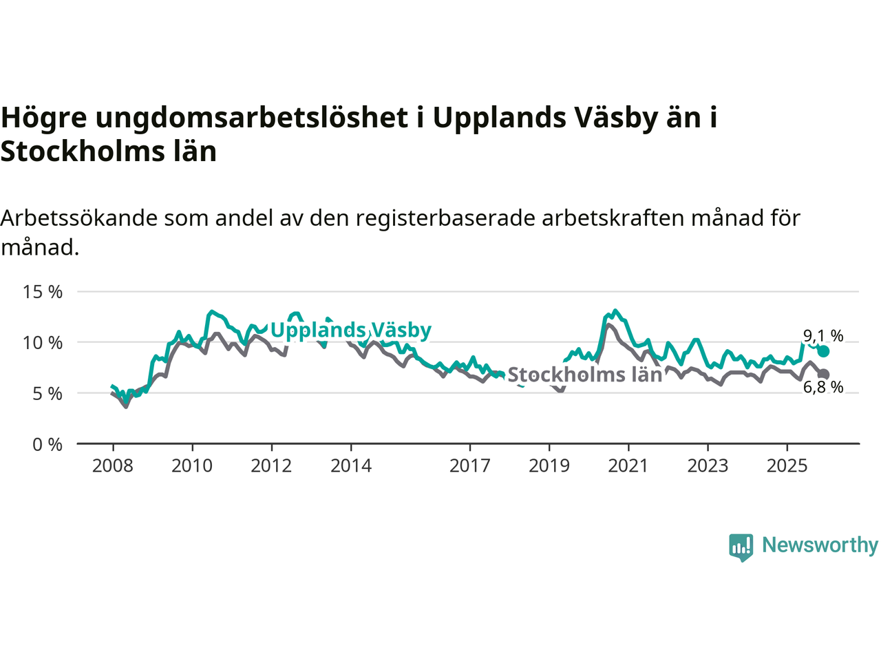 I och med den senaste månadens uppgång har de ungas arbetslöshet i Upplands Väsby stigit nio månader i följd (upp från 7,9 procent i mars 2025 till 9,1 procent nu).