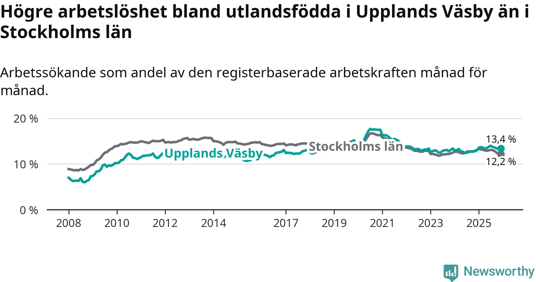 Medan arbetslösheten bland utlandsfödda alltså ökar i Upplands Väsby så minskar den i Stockholms län. Jämfört med december förra året har andelen arbetslösa utlandsfödda i länet minskat med 0,9 procentenheter (till 12,2 procent).