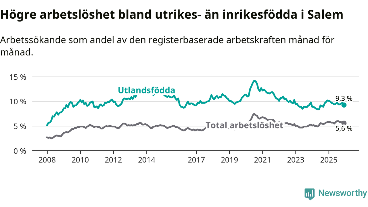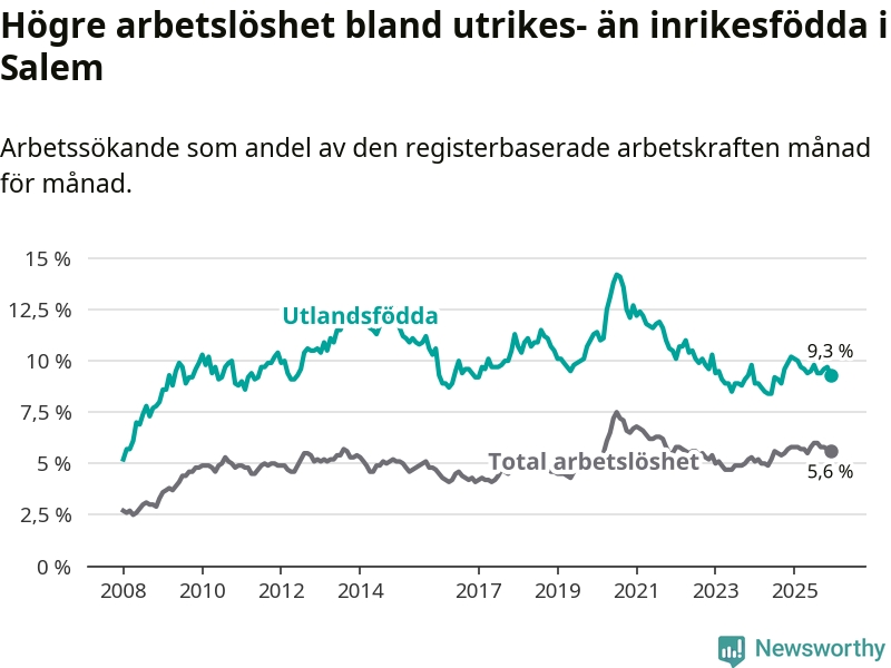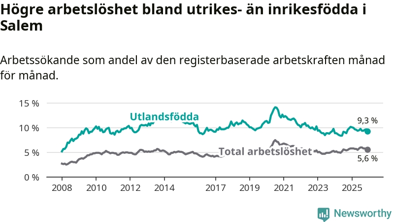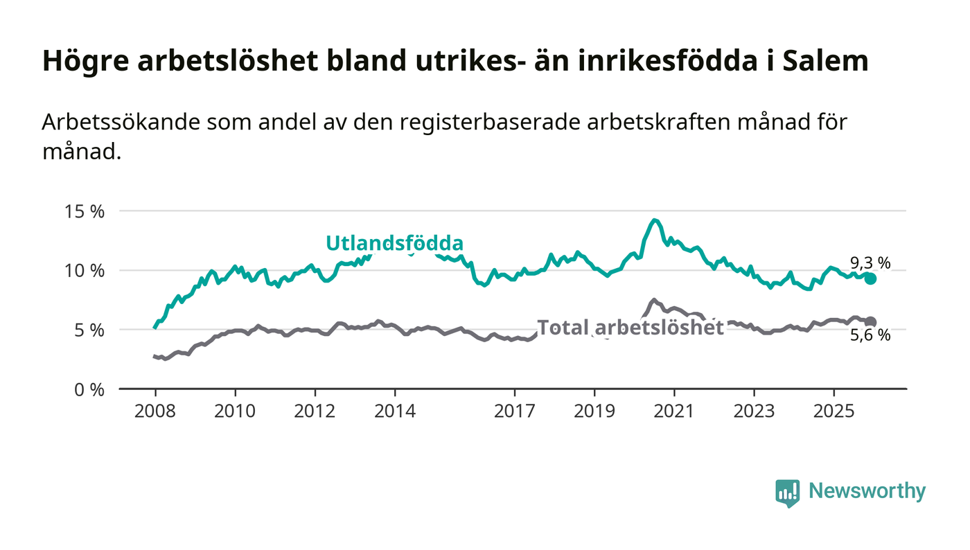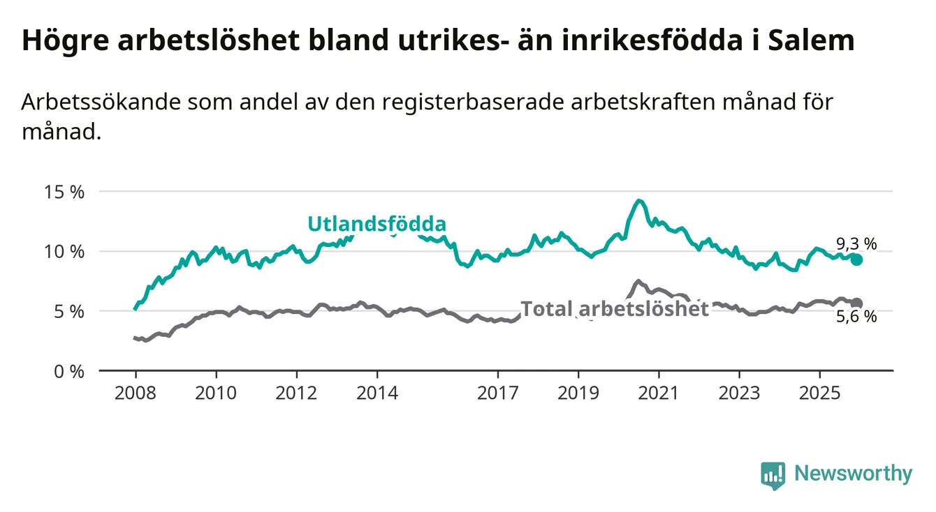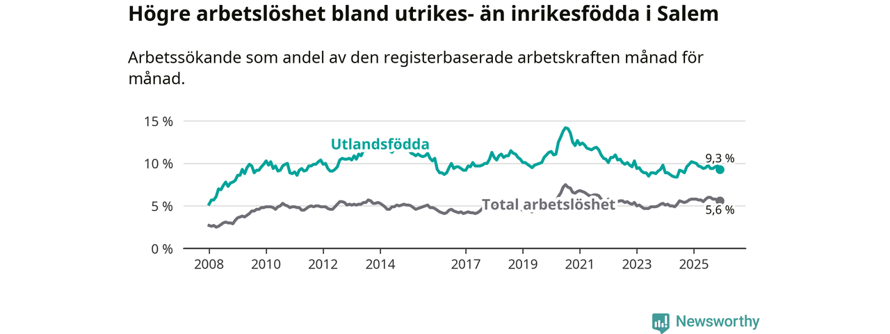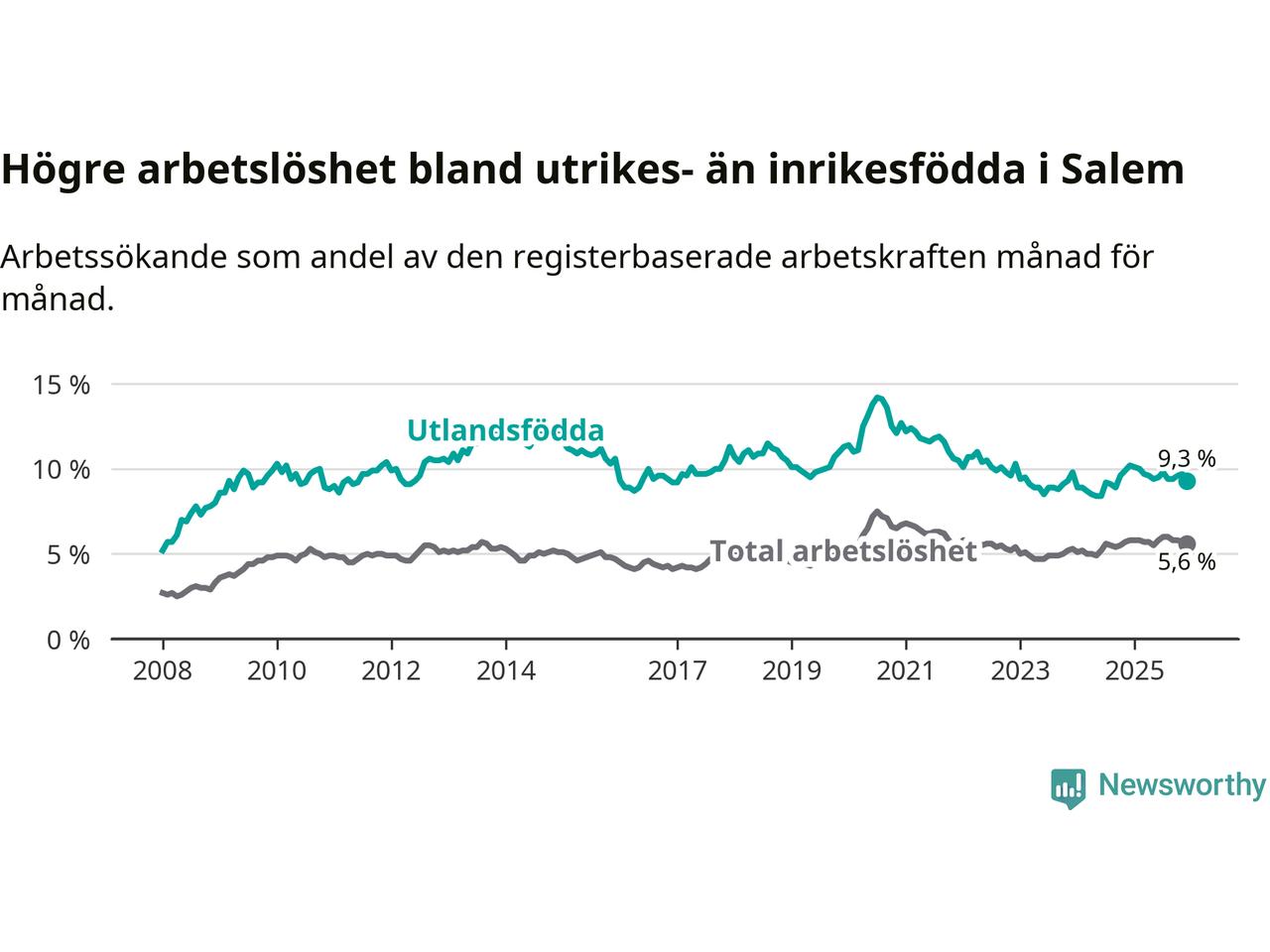 Skillnaden i arbetslöshet mellan utrikesfödda och hela befolkningen är 3,7 procentenheter i Salem. Det är en mindre skillnad än för ett år sedan (−0,7 procentenheter).